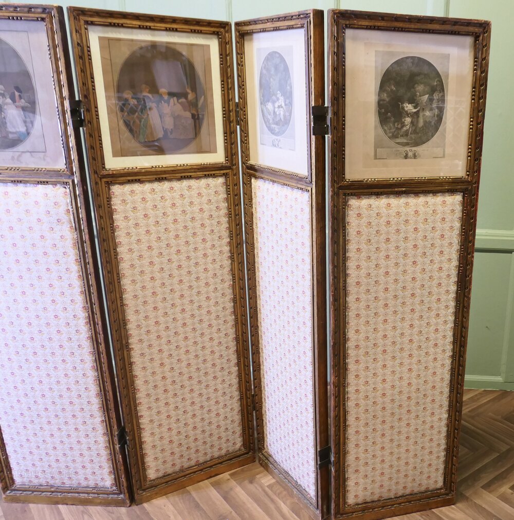 Each of the 4 folds has a quilted upholstered panel with a quartered mirror above on one side and on the other there is a 19th Century print behind glass.