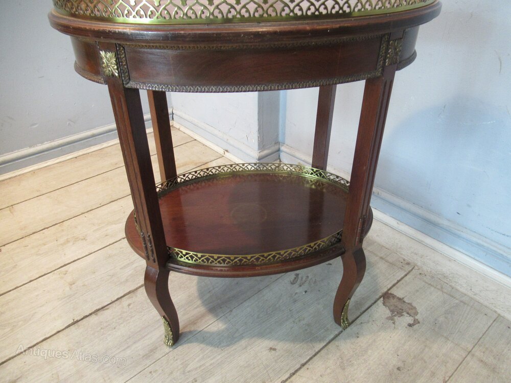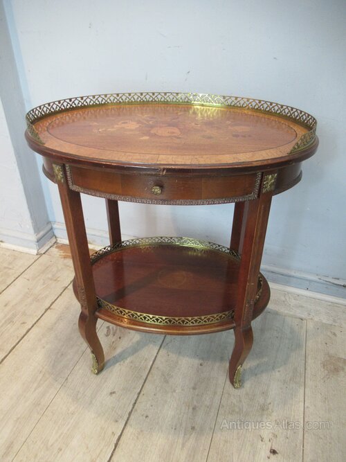 French style walnut oval side table or lamp table , the top has a floral marquety inlay . There is a brass gallery around the top and lower shelf , with ornate mounts, and standing on cabriole legs.