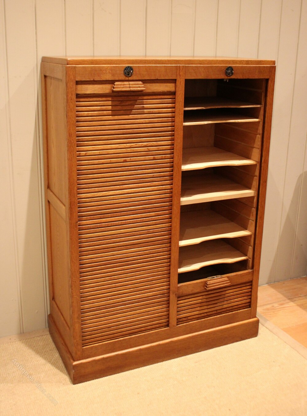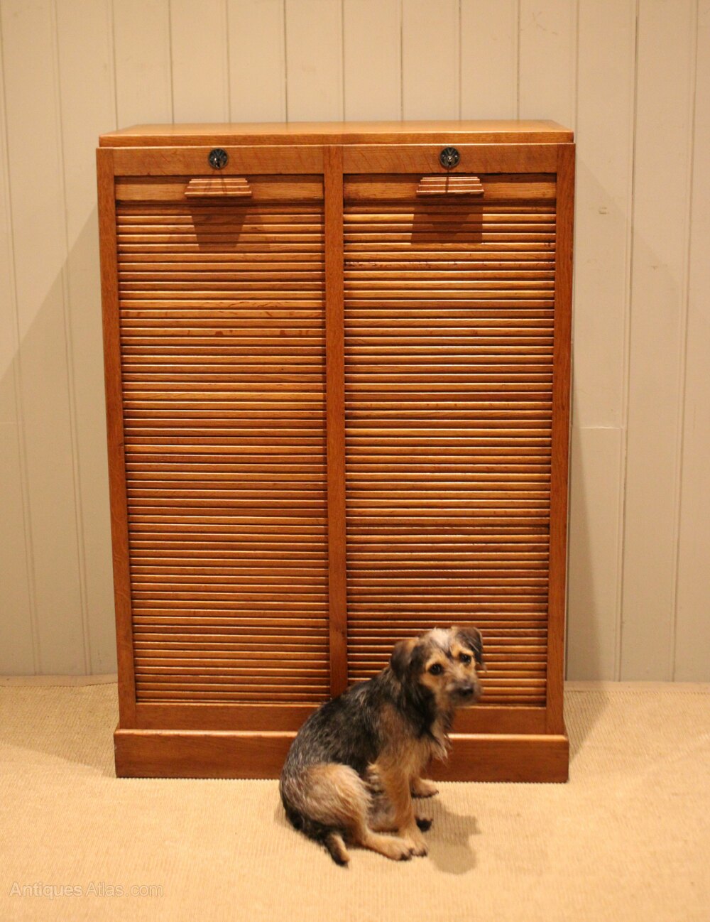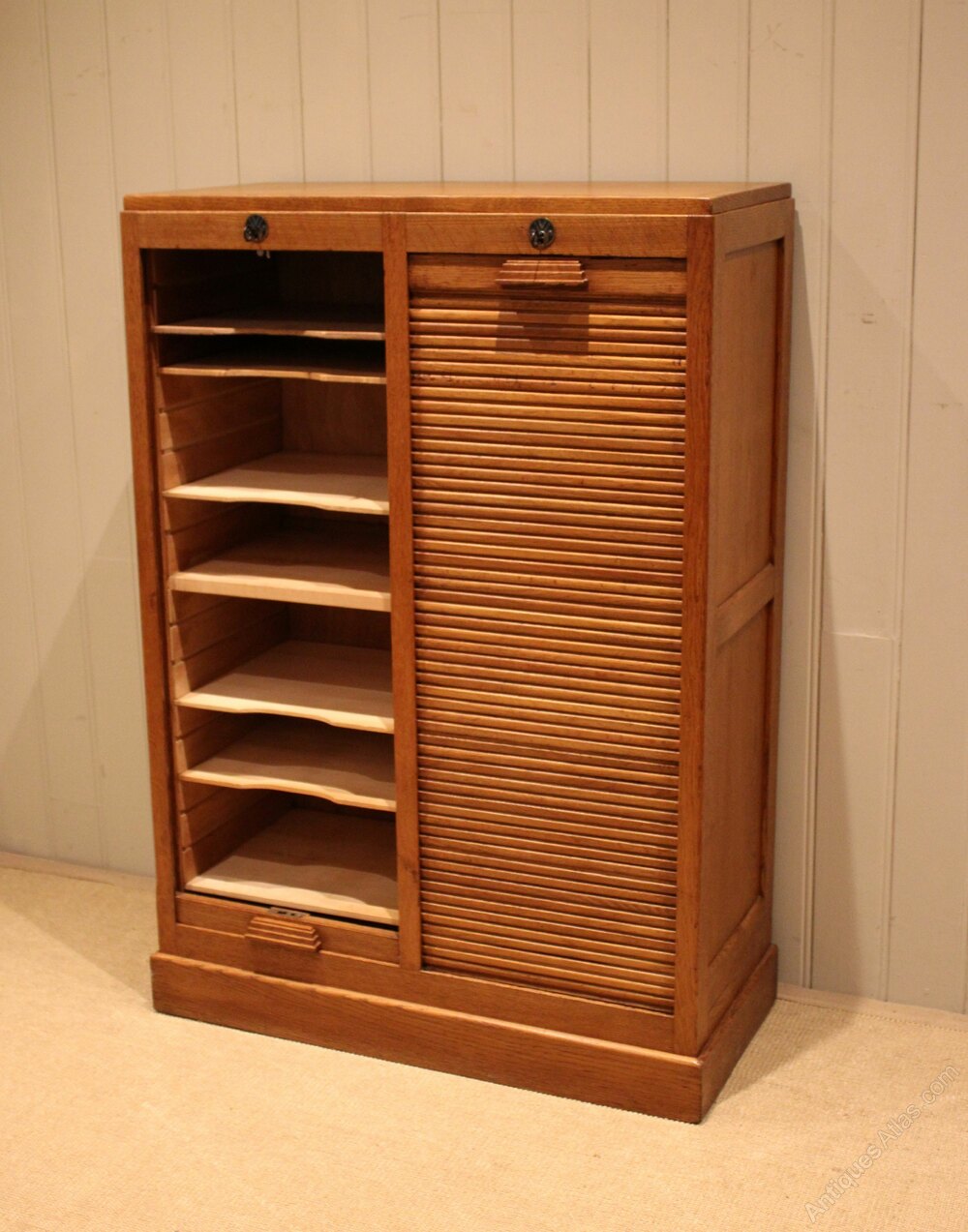 French Art Deco oak filing cabinet having double tambour front doors with six slide out plywood shelves to each side , raised on a plinth base. Complete with working lock & key.