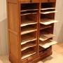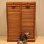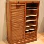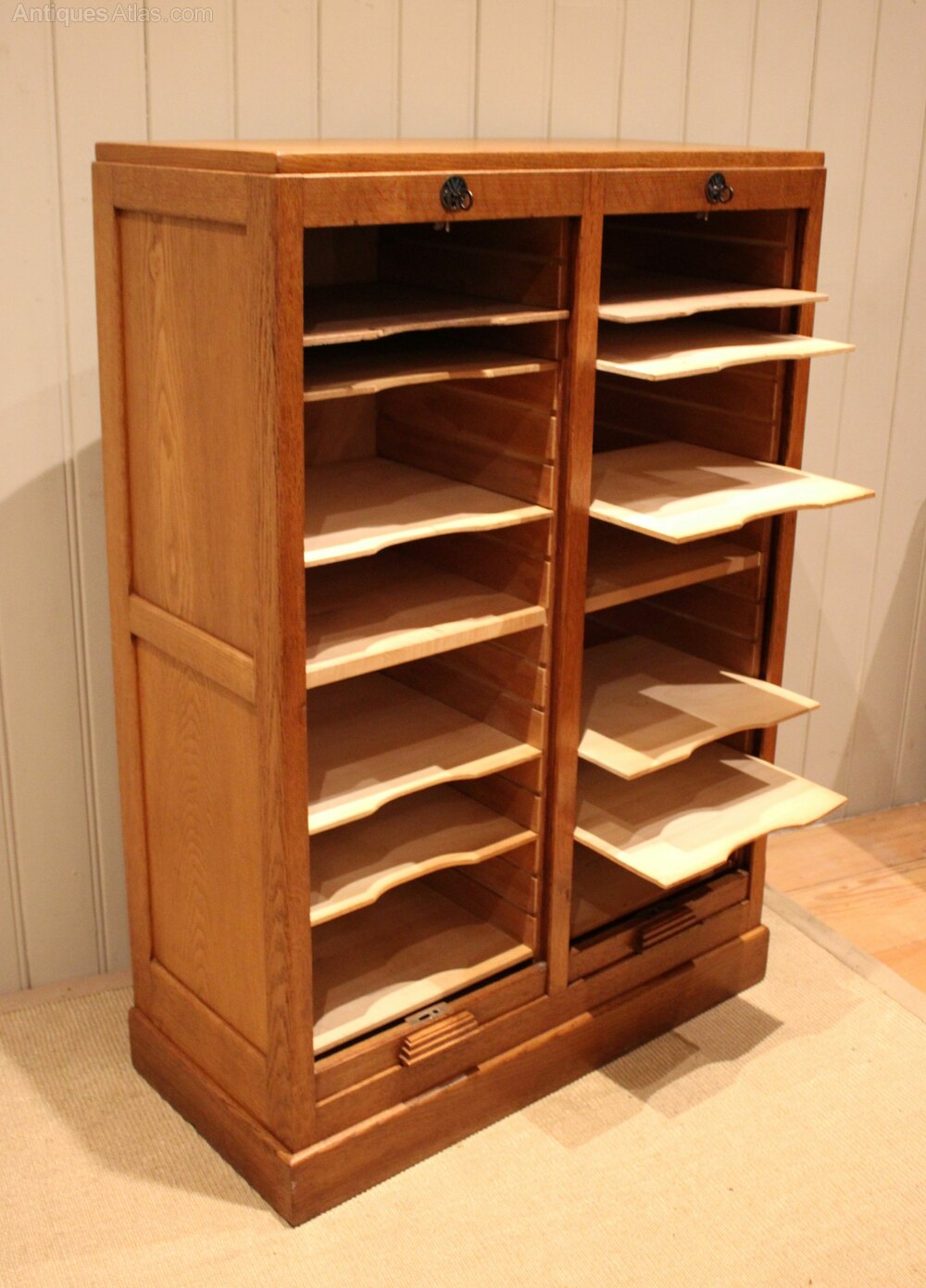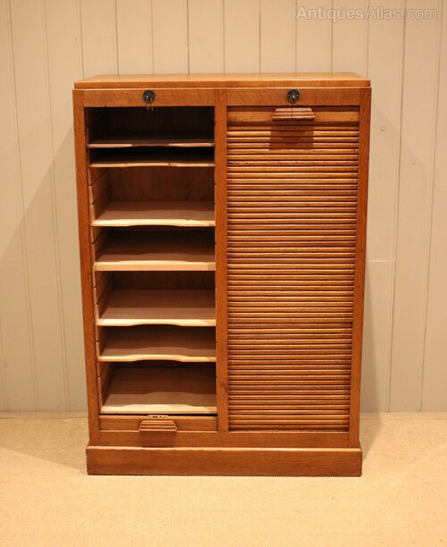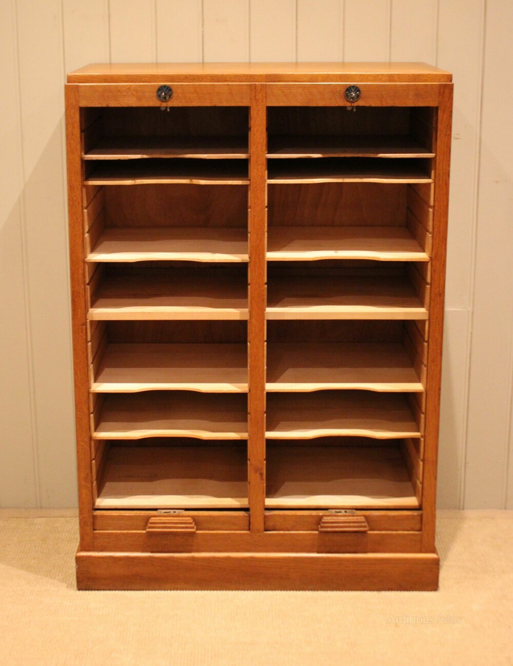 French Art Deco oak filing cabinet having double tambour front doors with six slide out plywood shelves to each side , raised on a plinth base. Complete with working lock & key.