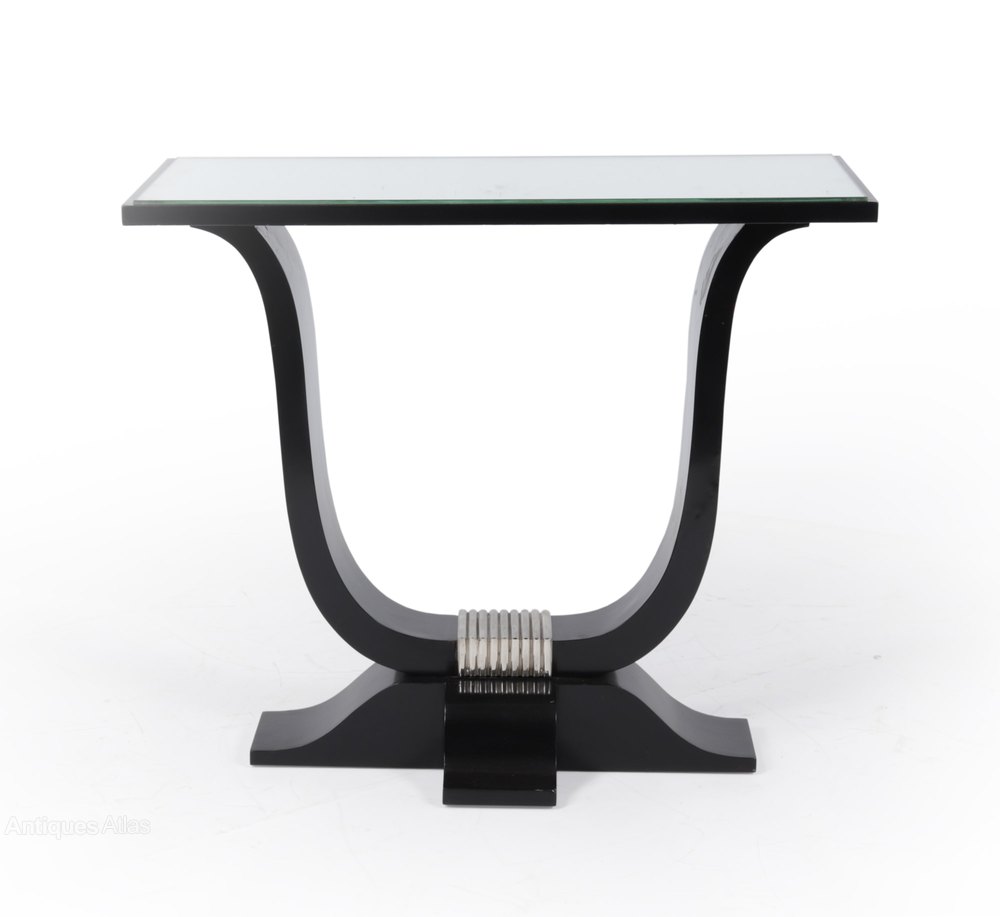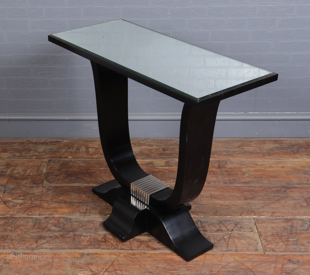 A free standing French Art Deco side table with shaped base and uprights, mirrored glass top in excellent condition throughout