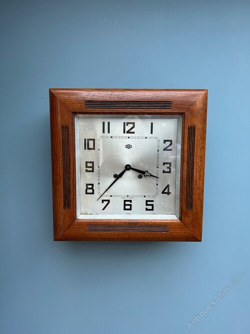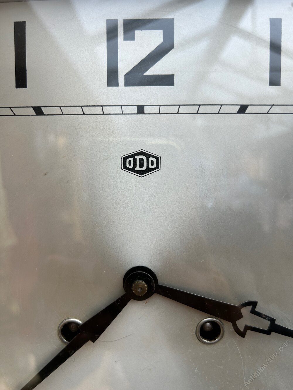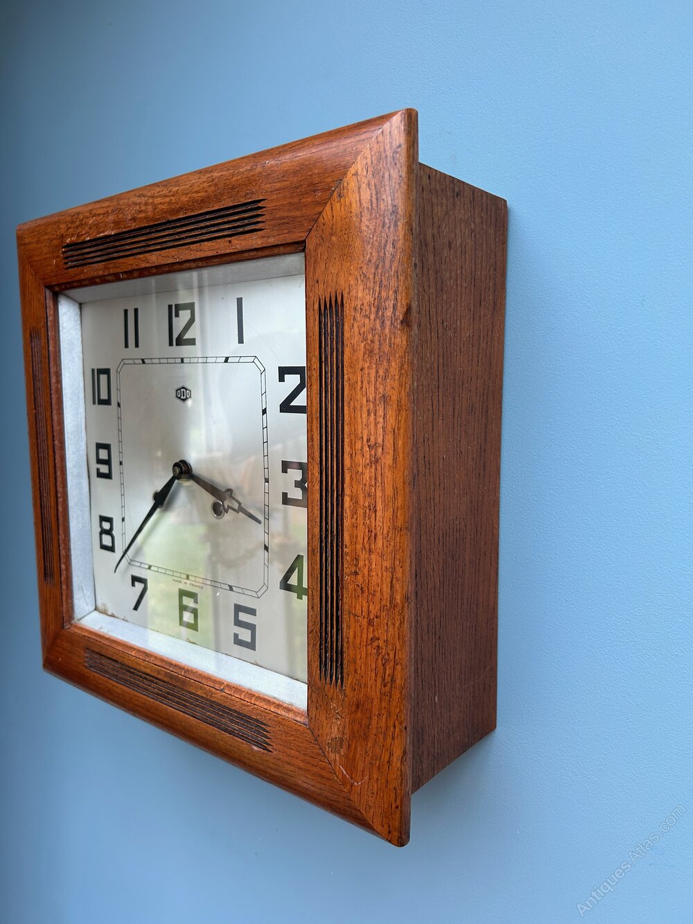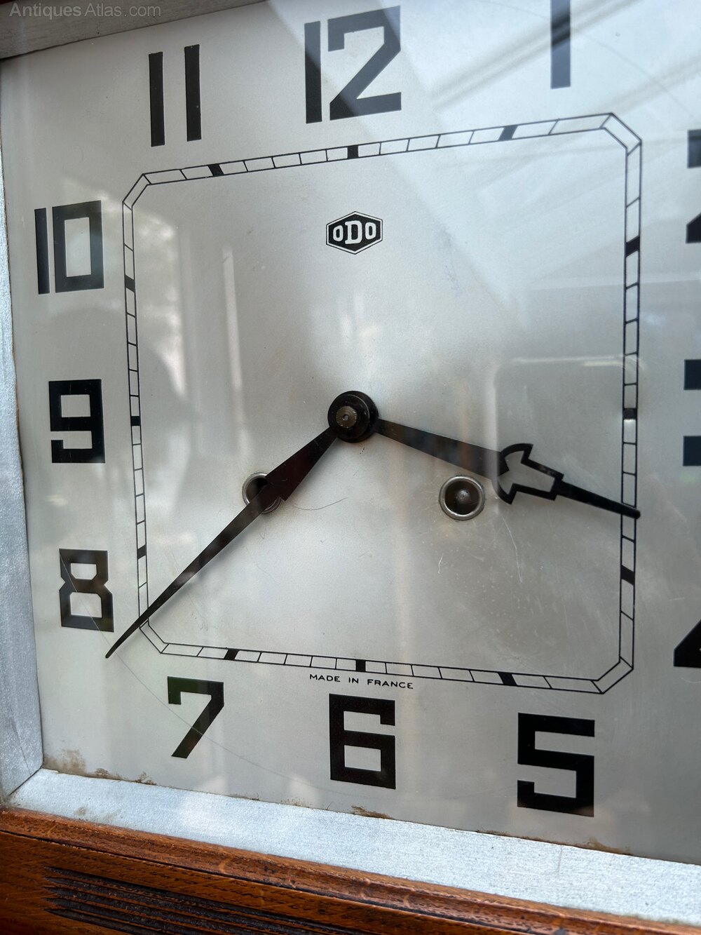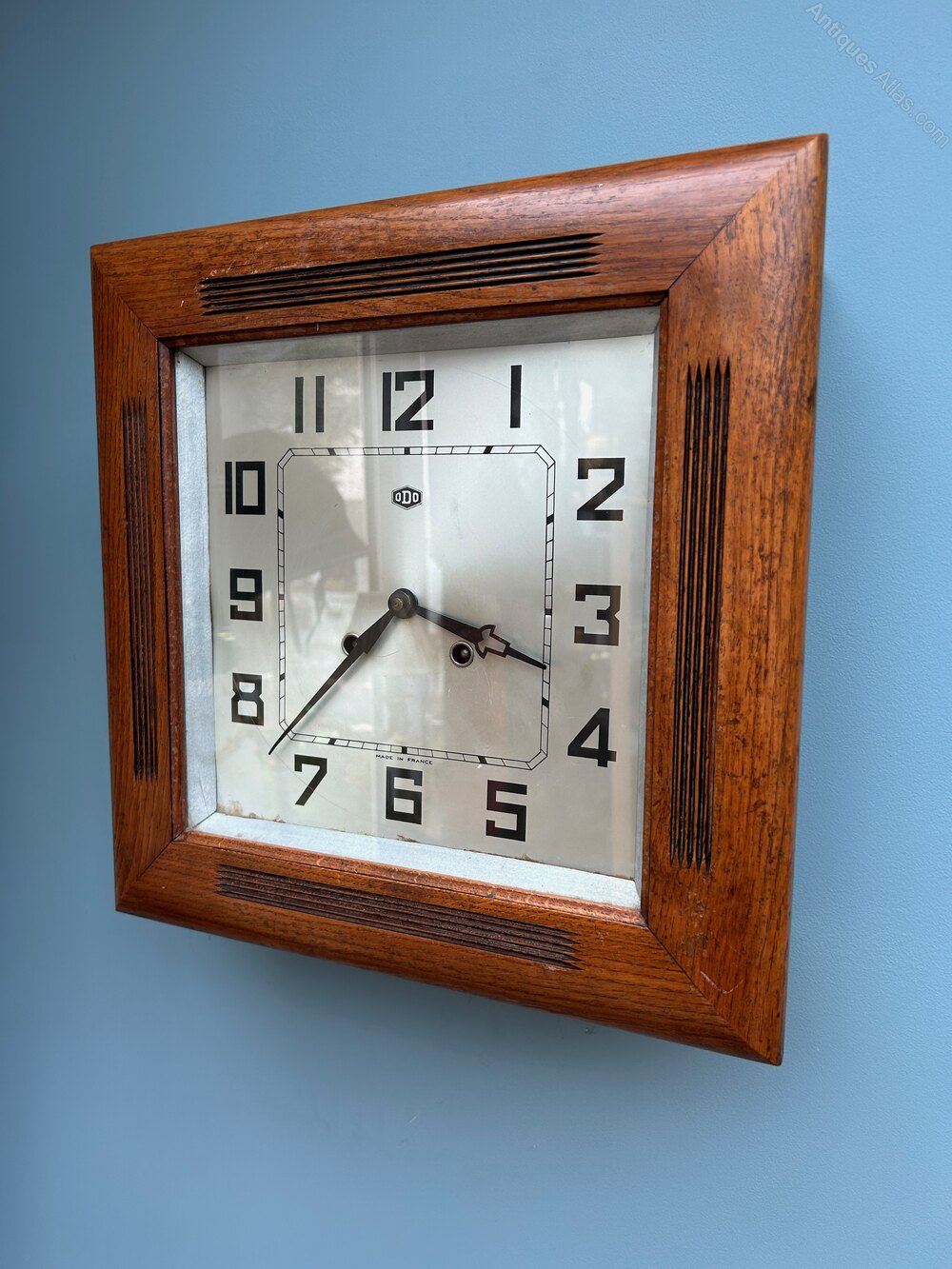 French Art Deco striking wall clock by Odo. In original condition (age related marks) circa 1930. Oak case, silvered face and black numerals. Strikes on the half hour and the hour on a gong. Lovely rare piece.