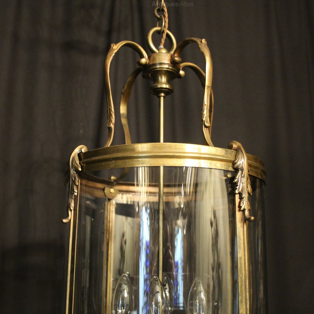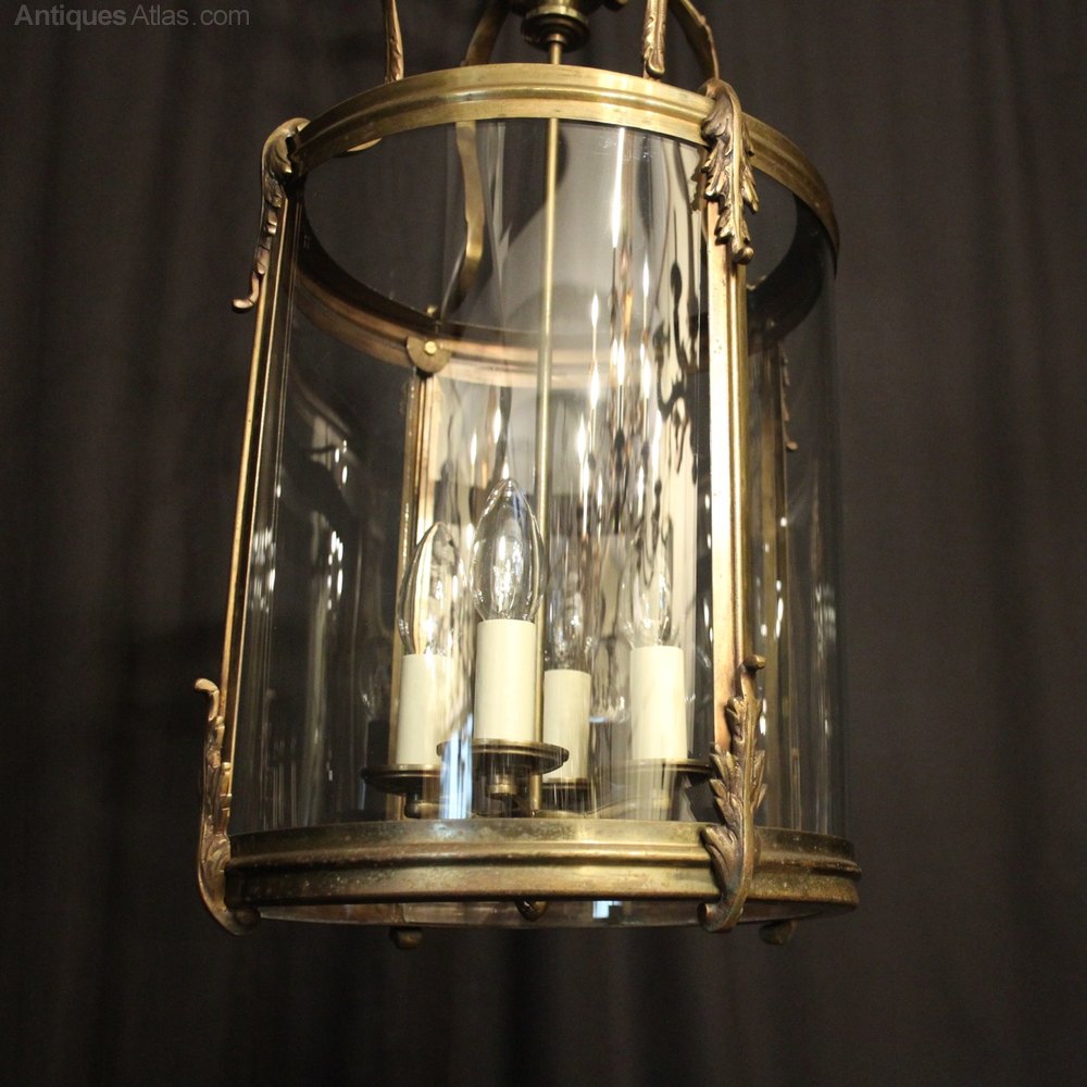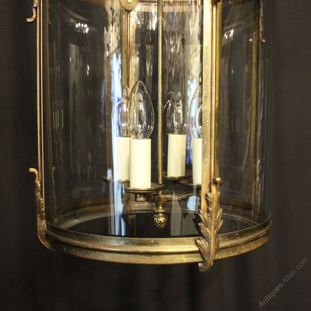 A French brass four light antique hall lantern, the four light fittings with circular bobeche drip pans, surrounded by two sectional circular convex glass panels and held within a simple scrolling framework with reeded side panels, decorative acanthus leaves and open scrolling canopy, having the original chain and ceiling rose, original faded patination with some pitting to the base. Fully rewired and PAT tested. All our lanterns come with bulbs and ceiling fixings.