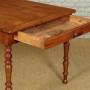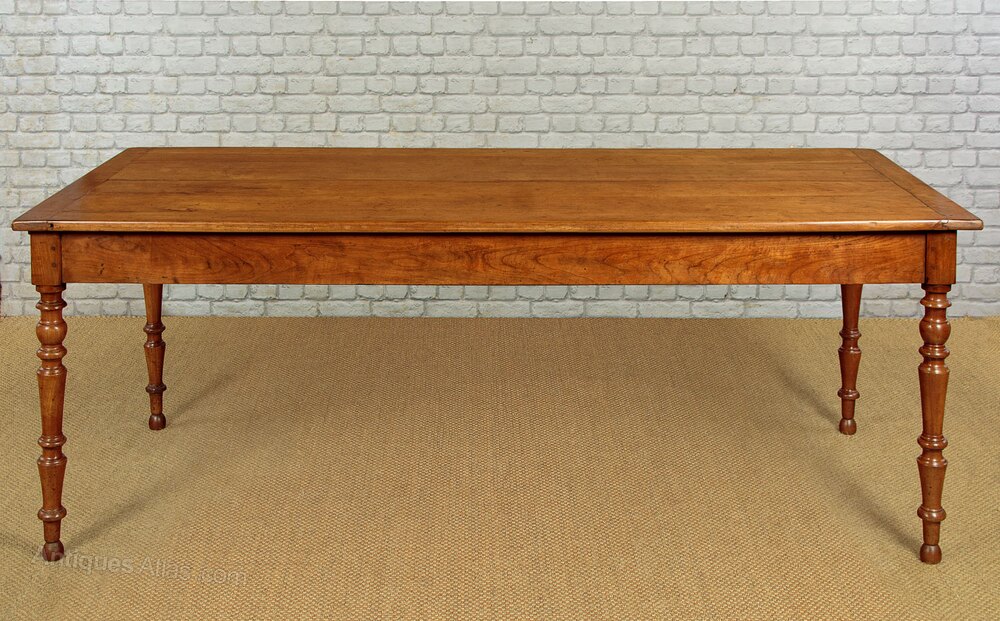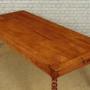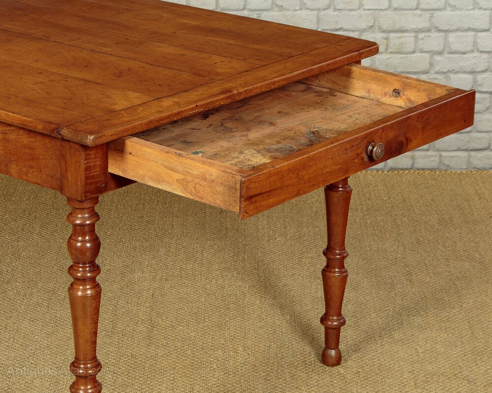 Beautiful mid 19th.c. French cherry wood farmhouse kitchen dining table c.1860. 35" x 78½" top (a little wider than may we see) made from solid cherry wood boards with cleated ends. Base with a useful drawer at one end and a 14" extension in oak at the other. Slim straight apron all round with 24" knee height below. Raised on lovely turned and tapering legs. Excellent colour and condition, cleaned and waxed in our workshops.