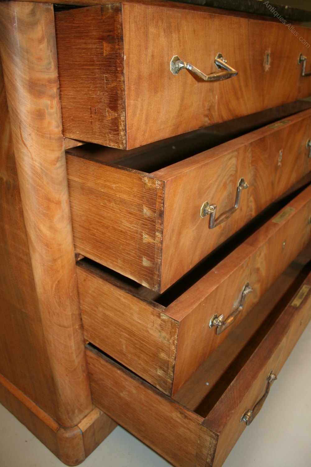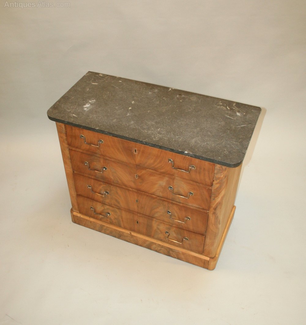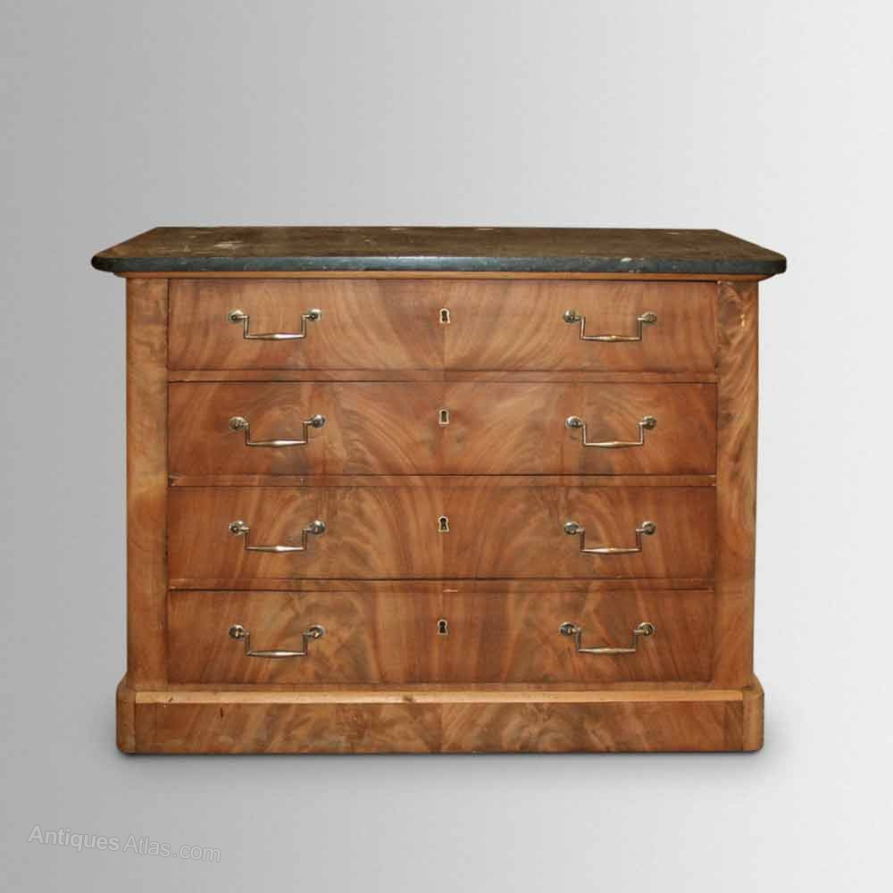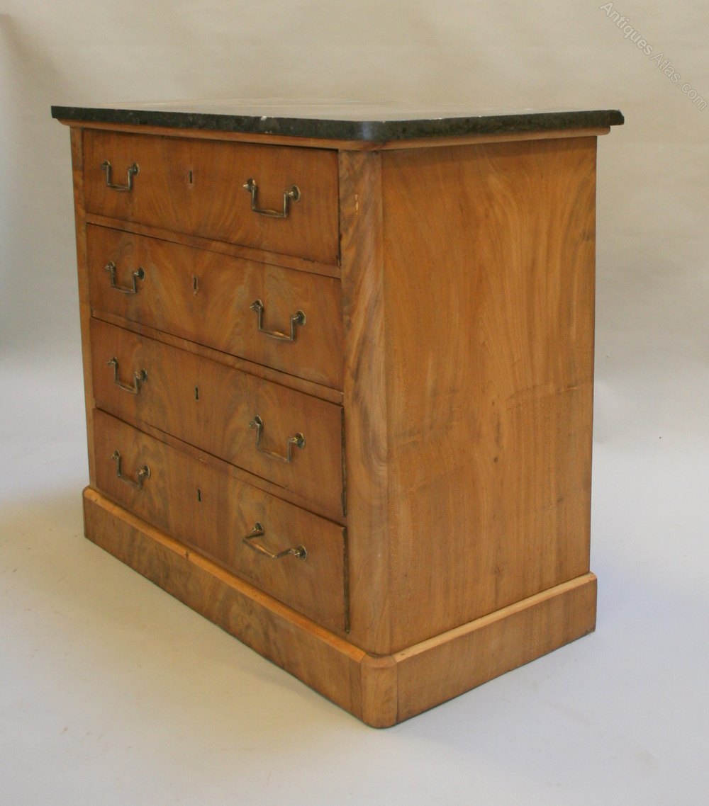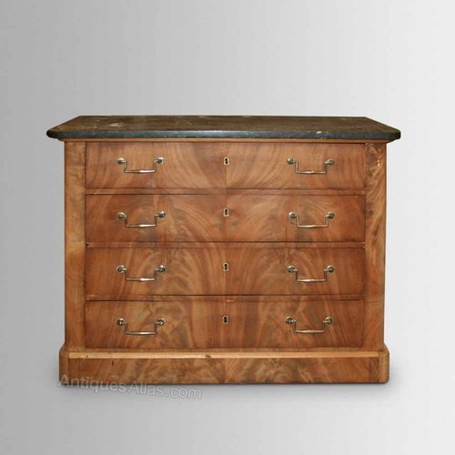 An elegant commode, circa 1880, with "book-matched" flame mahogany veneeers to the 4 long drawers below a marble top.