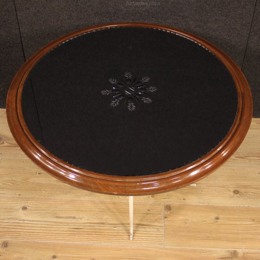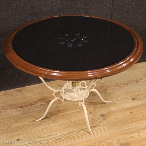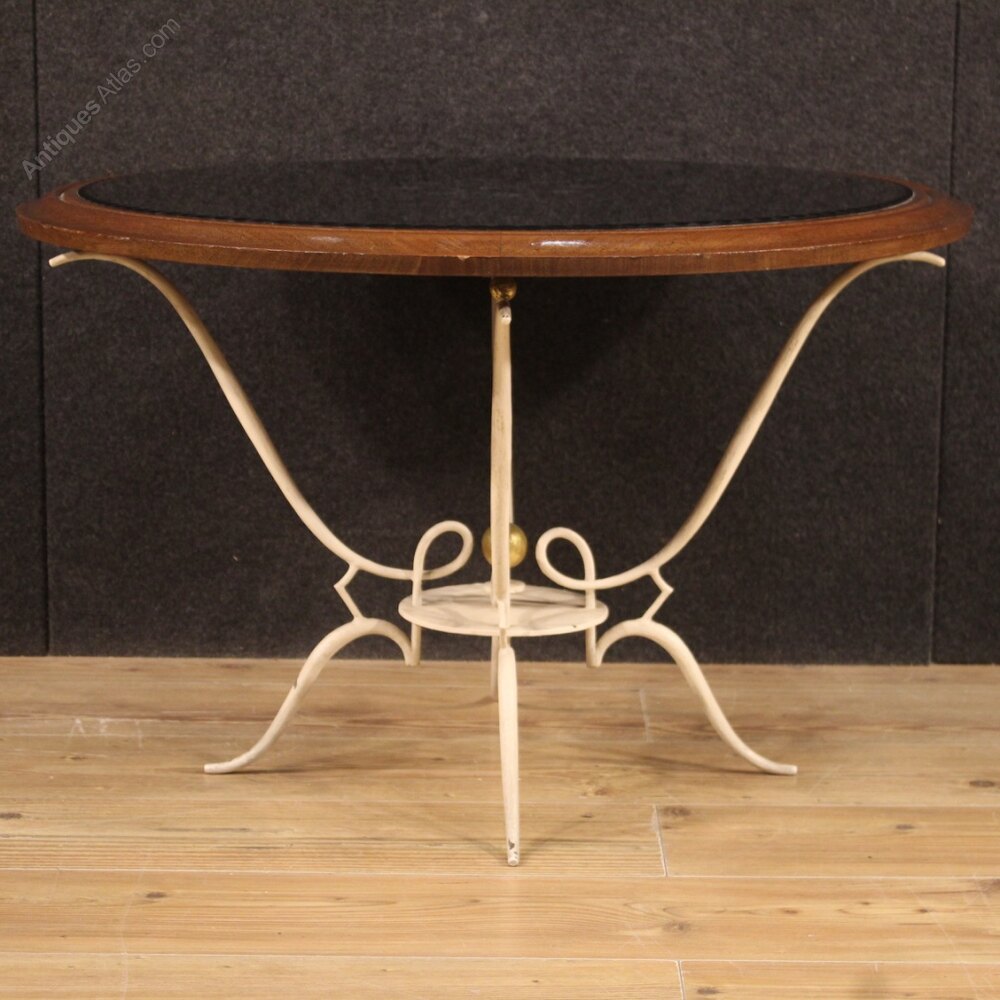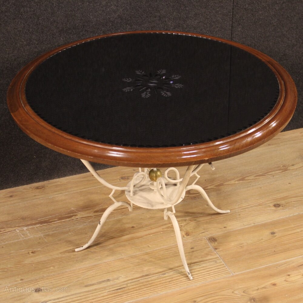 French design coffee table from 60s / 70s. Furniture with painted and gilded metal base, wooden top with chiseled built-in mirror of excellent quality. Coffee table of good size and service, of excellent solidity and stability. Furniture for antique dealers and interior decorators, difficult to find. Mirror top with some small scratches, without cracks or chips (see photos). In good condition with some small signs of aging.