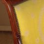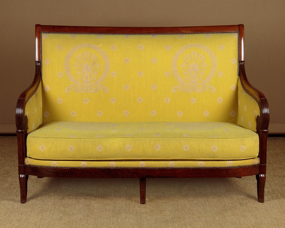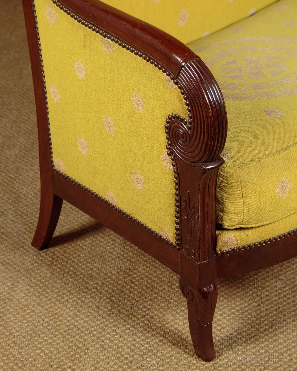 Fine early 19th.c. French Empire couch c.1830. Mahogany frame and striking upholstery in lemon yellow with Empire style motifs to the backrest and seats. Straight cresting rail with a little roll at the top and continued on the stiles, shaped arms with large reeded and scrolling terminals on palmate supports. Note the carved papyrus leaf detail where the arms meet the stiles. Webbed seat with a loose deep sprung cushion over a mahogany veneered apron raised on shaped front legs also carved with papyrus leaf detail. Some minor wear to the covers, otherwise very good condition, cleaned and waxed in our workshops.