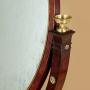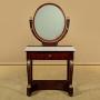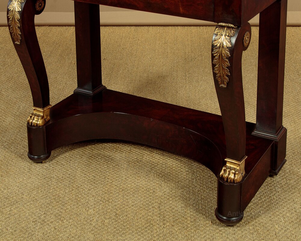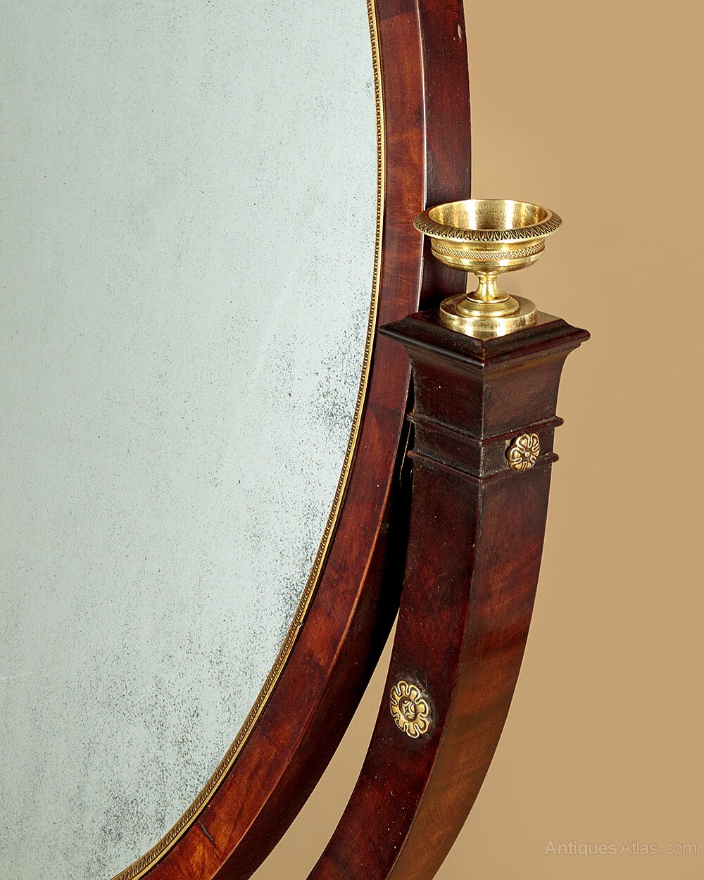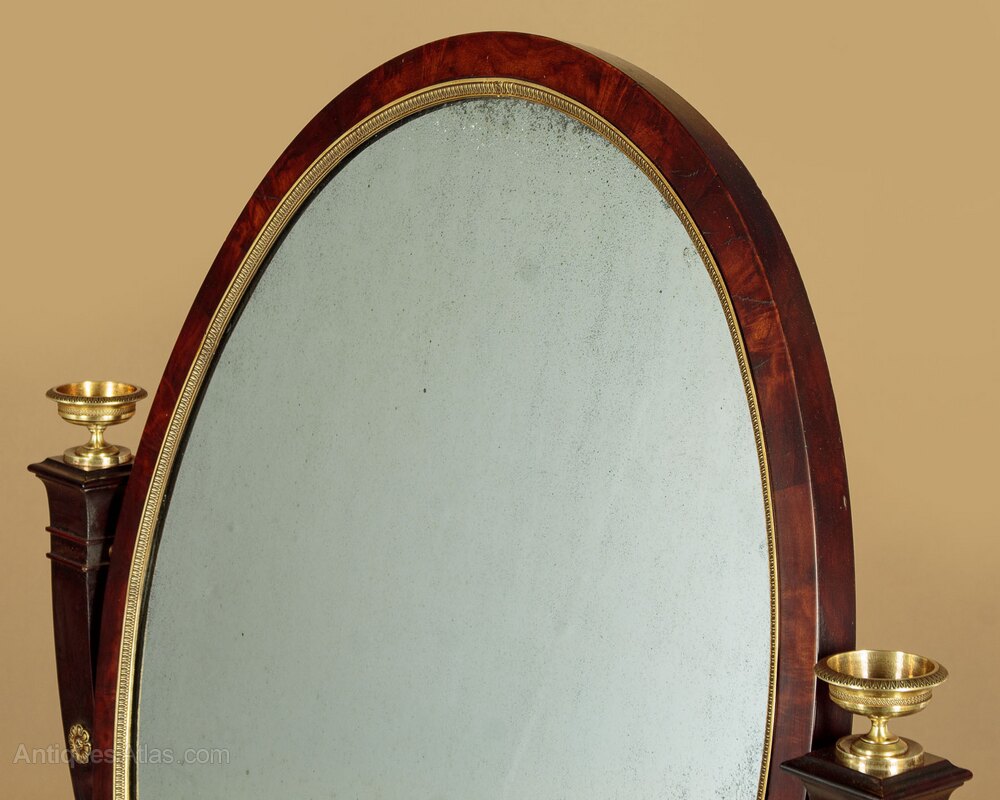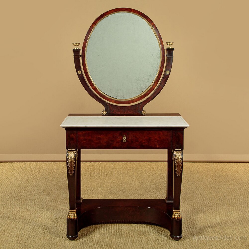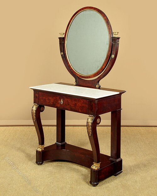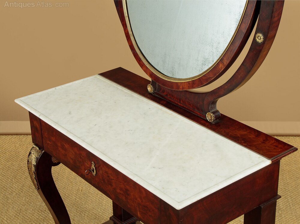 Splendid early 19th.c. French Empire style brass mounted mahogany dressing table c.1815. Original 21" x 25" oval mirror plate in a flame mahogany veneered frame with crisp brass moulding to the inner edge. Angle adjustable on a curved yoke topped with brass tazza finials and with small brass flower head roundels applied. Original white marble table top (height 30½") with a very slightly raised edge to stop things rolling off the sides. Flame mahogany veneered base with a useful drawer in the front edge. Raised on shaped front legs with large brass acanthus mounts to the knees, brass roundels at both sides and large brass claw feet. Square column back legs with moulded detail. Open plinth base, shaped to allow space for someone's feet when sat at the table. Raised on moulded feet with the original brass castors recessed below. Some tarnish to the mirror (which could be replaced if preferred). Otherwise excellent condition, restored, cleaned and waxed in our workshops. Key supplied for the drawer.