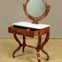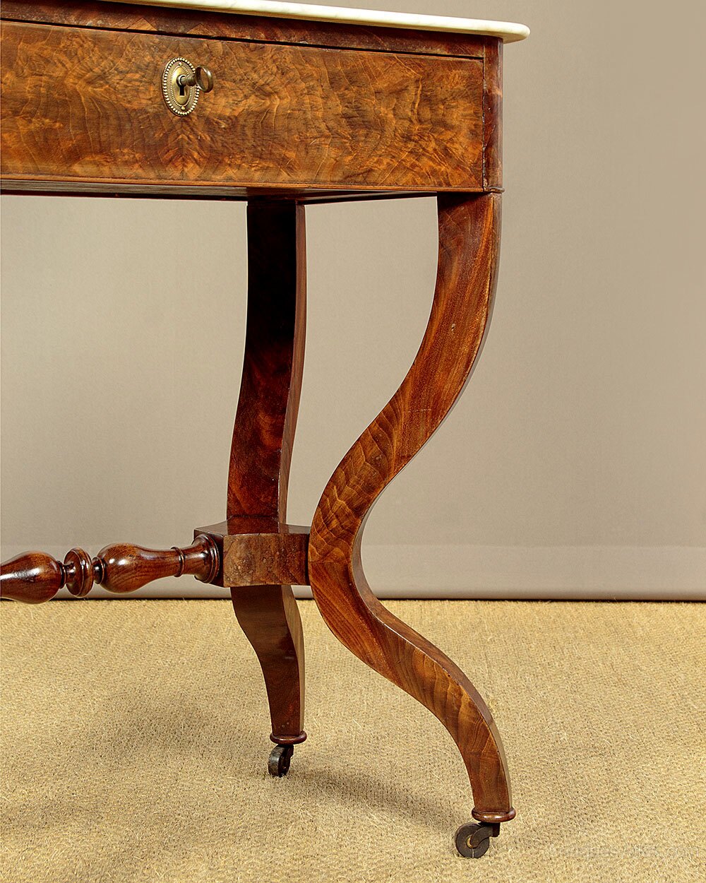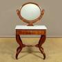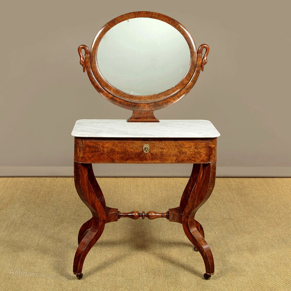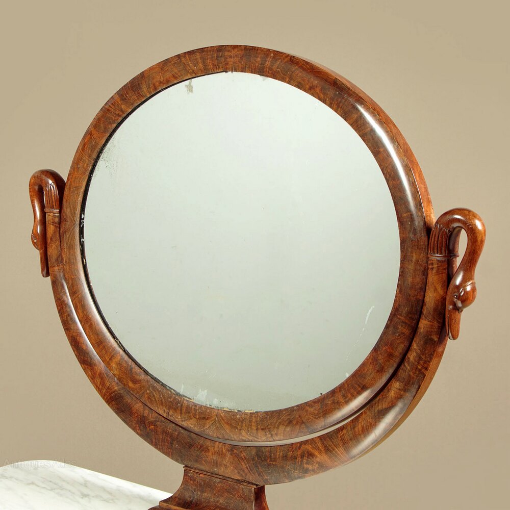Early 19th.c. French Empire style mahogany dressing table or wash stand c.1820. Just 29" wide. Original oval mirror plate within a crossbanded flame mahogany frame, angle adjustable on a shaped yoke, veneered to match and ending in delightful carved swan’s heads (symbol of the Empress Josephine). Over the original white marble top with rounded corners. Flame mahogany veneered base with a single drawer. Raised on graceful curving legs joined with a turned stretcher and retaining the original wooden castors to the feet. Some tarnish to the mirror (which could be easily replaced), mainly around the edge. Otherwise very good colour and condition, cleaned and waxed in our workshops. Key supplied.