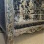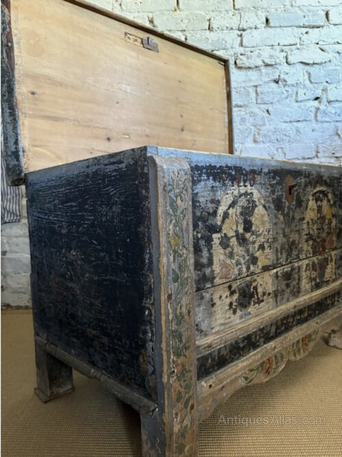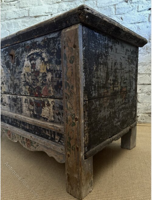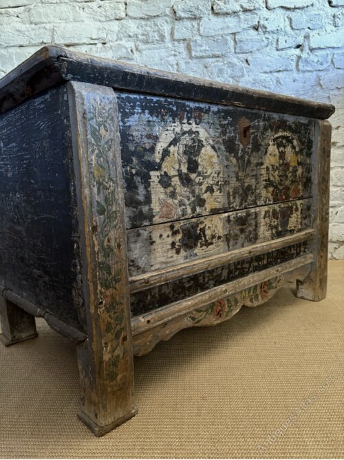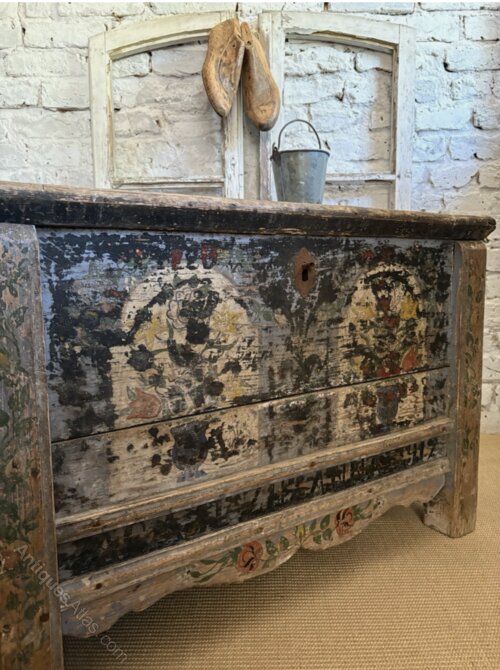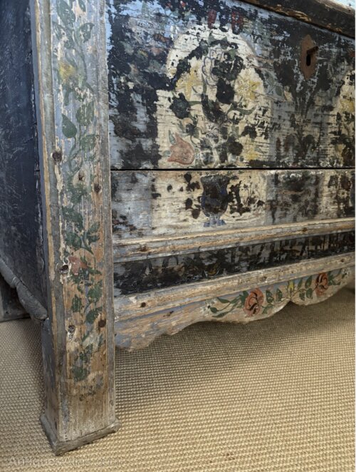 The most fabulous French painted folk art chest. Weathered black and blues tones with floral details and artwork.
