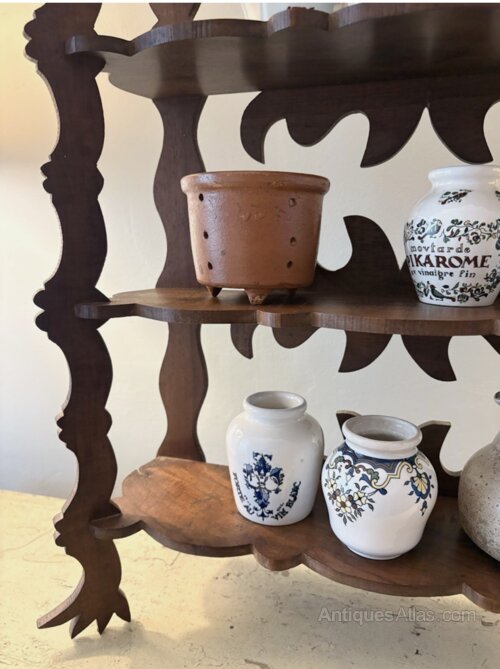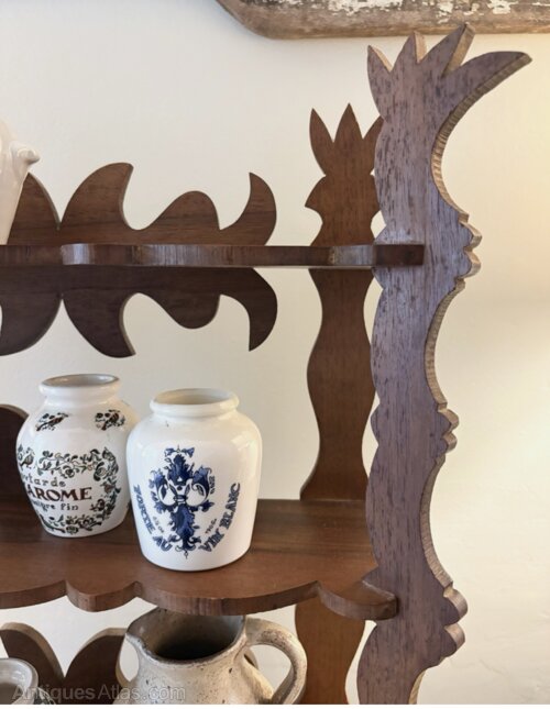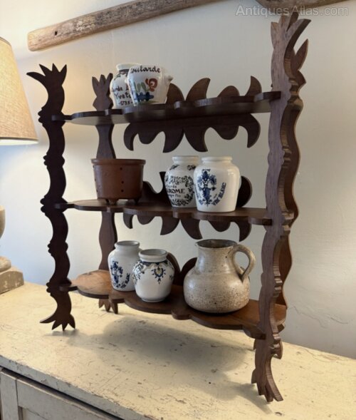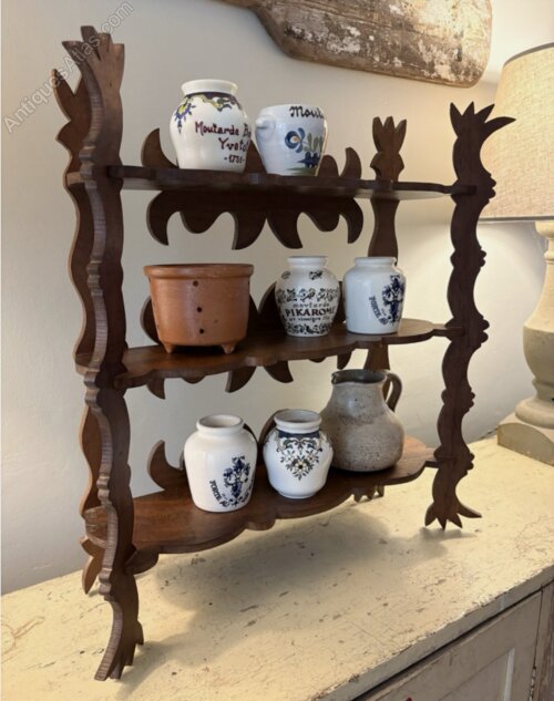 An unusual French freestanding etagere with a folk art design. Quirky design in wonderful condition. Wonderful grainy wood in a dark medium tone. As stated this one currently free stands although flexible enough to allow for a wall hanging opportunity.