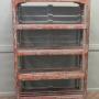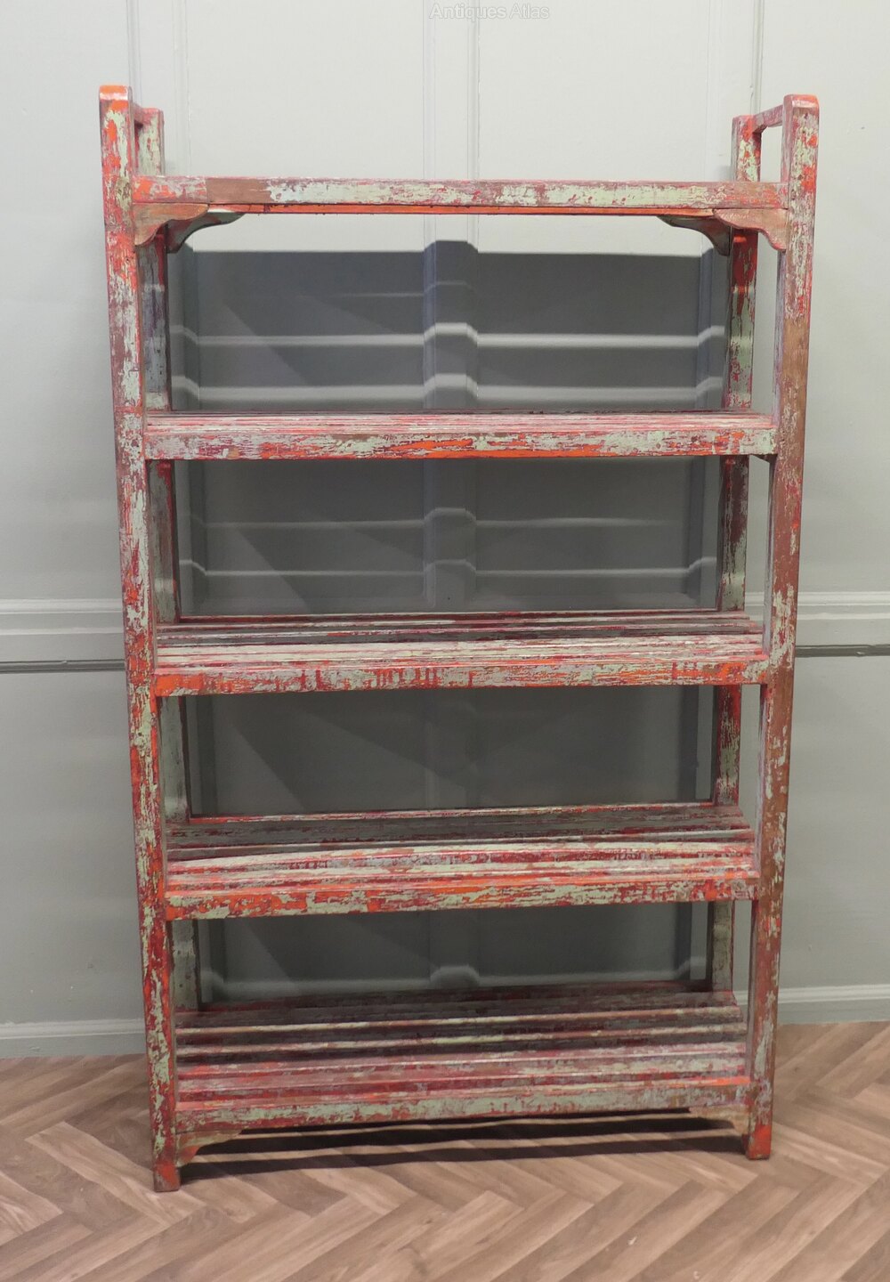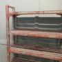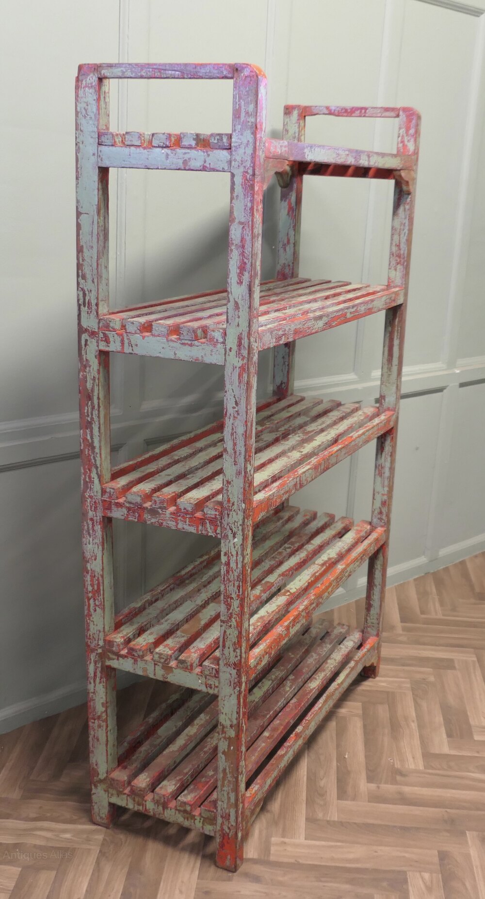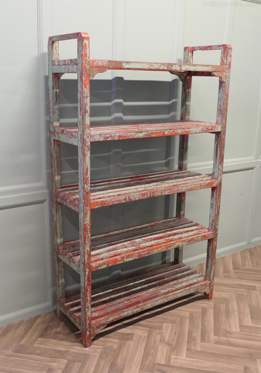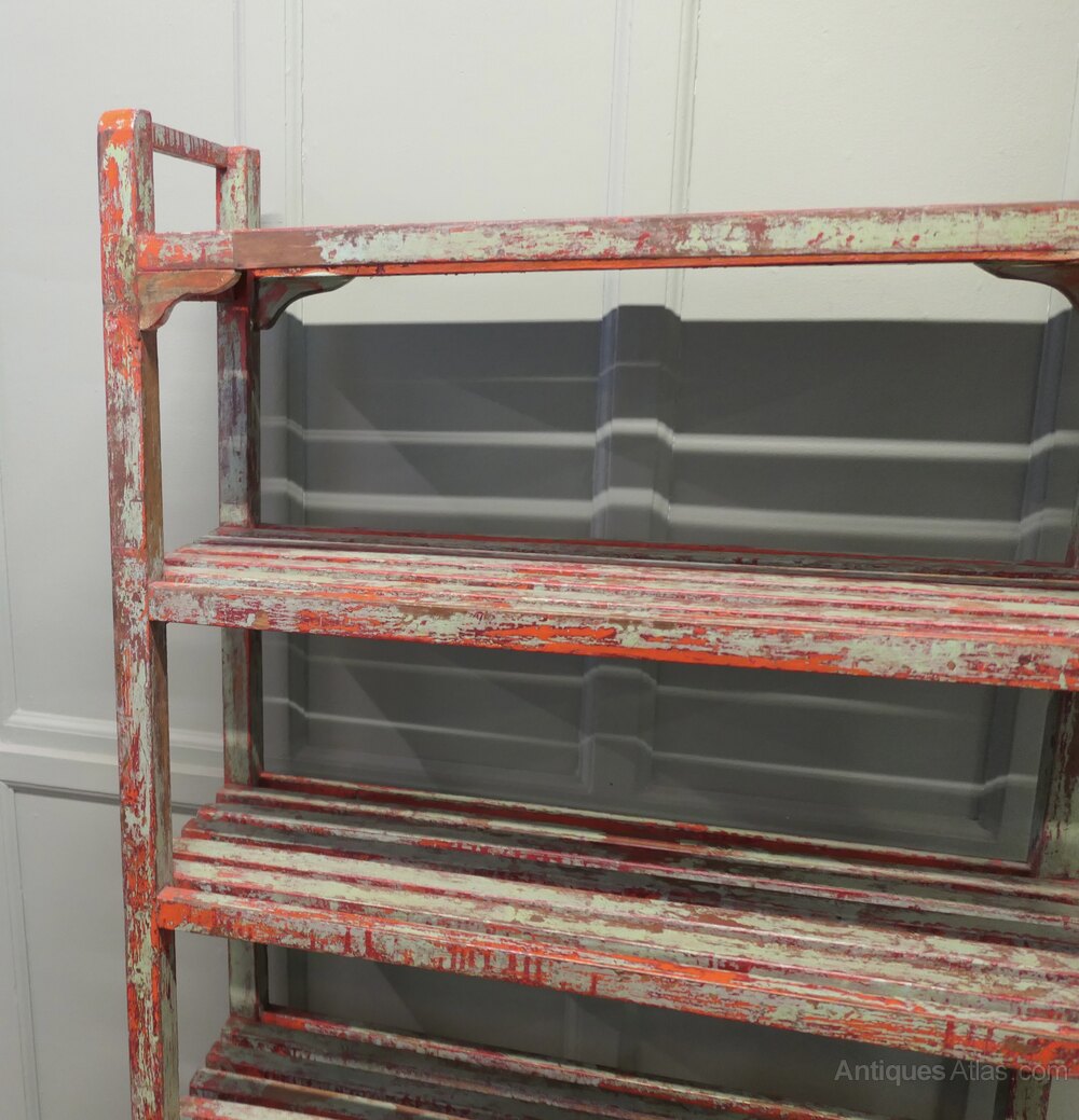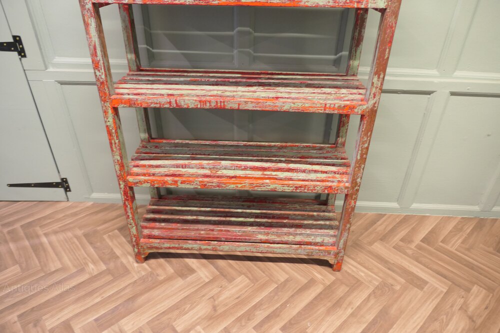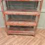 A 5 shelf rack, very strong and sturdy, from a pottery studio, this is a great piece with original character, the shelf is made in hard wood and has been painted every few years, it seems the choice of colour has been different each time the shelf was painted, it is predominately pale green and red.