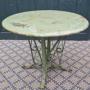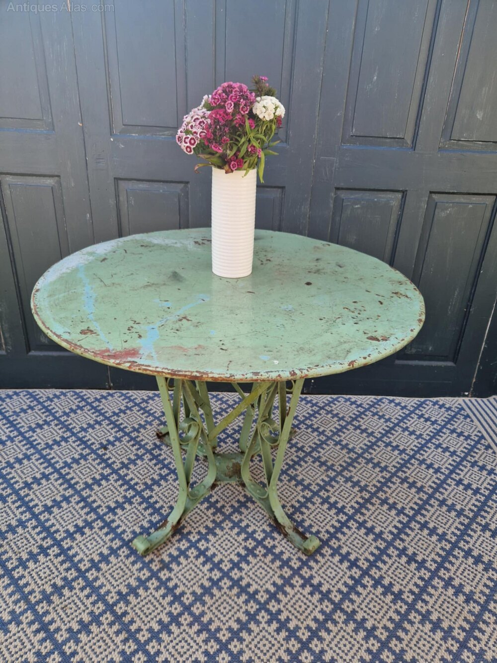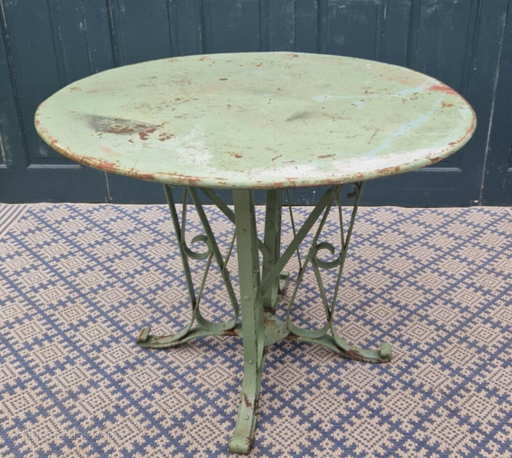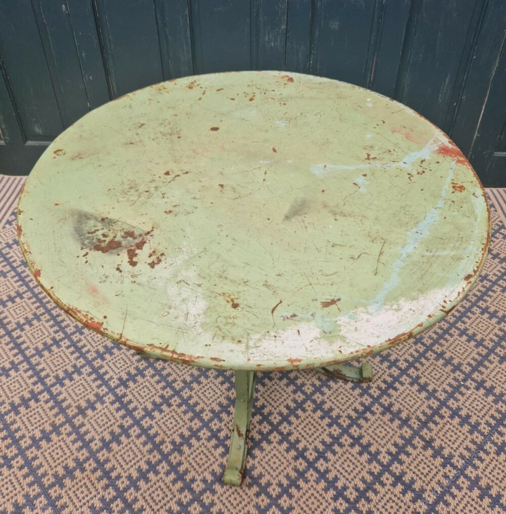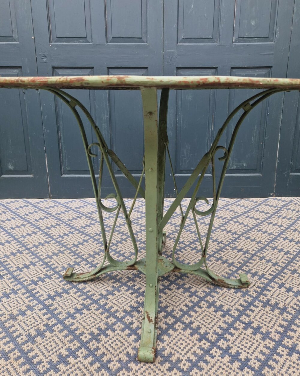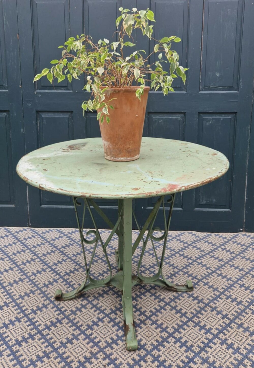 A stylish early 20th-century French garden/bistro table. The circular tabletop sits on a wrought iron base with scroll decoration. The table is painted in an elegant French grey with signs of previous light duck egg blue showing. It will elevate any garden or patio.