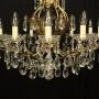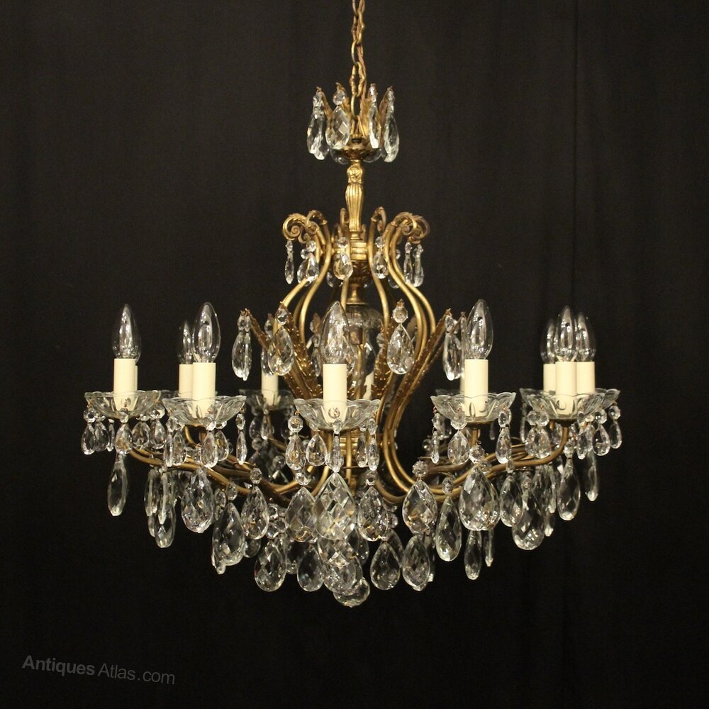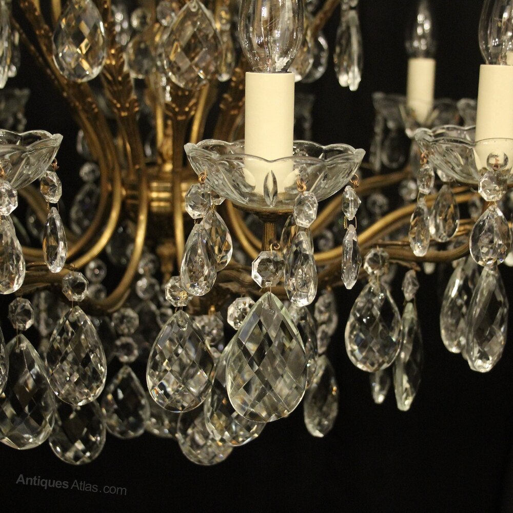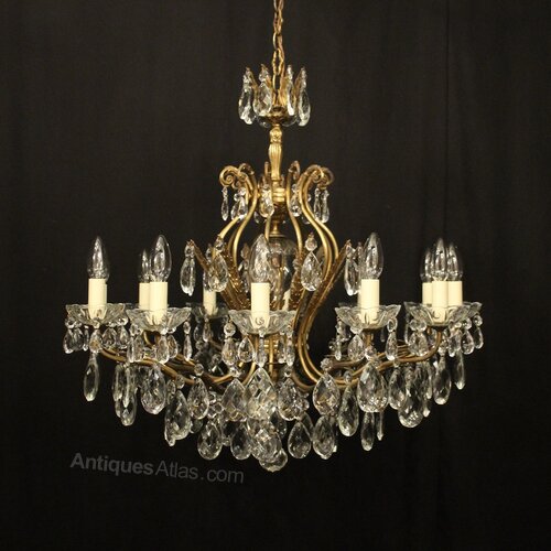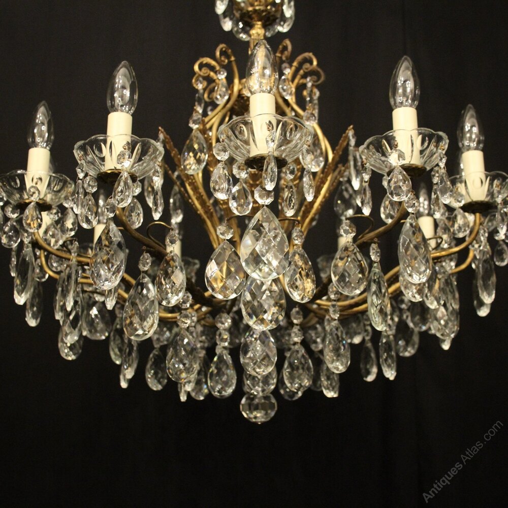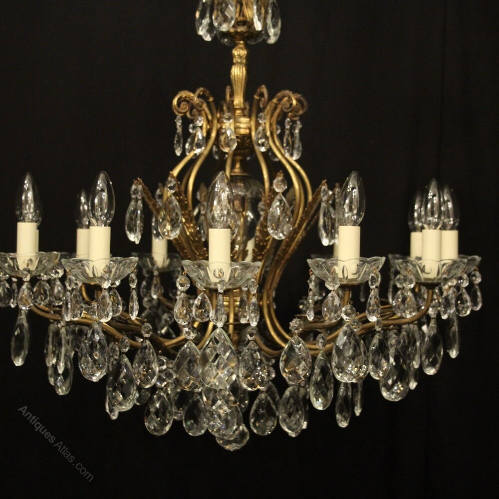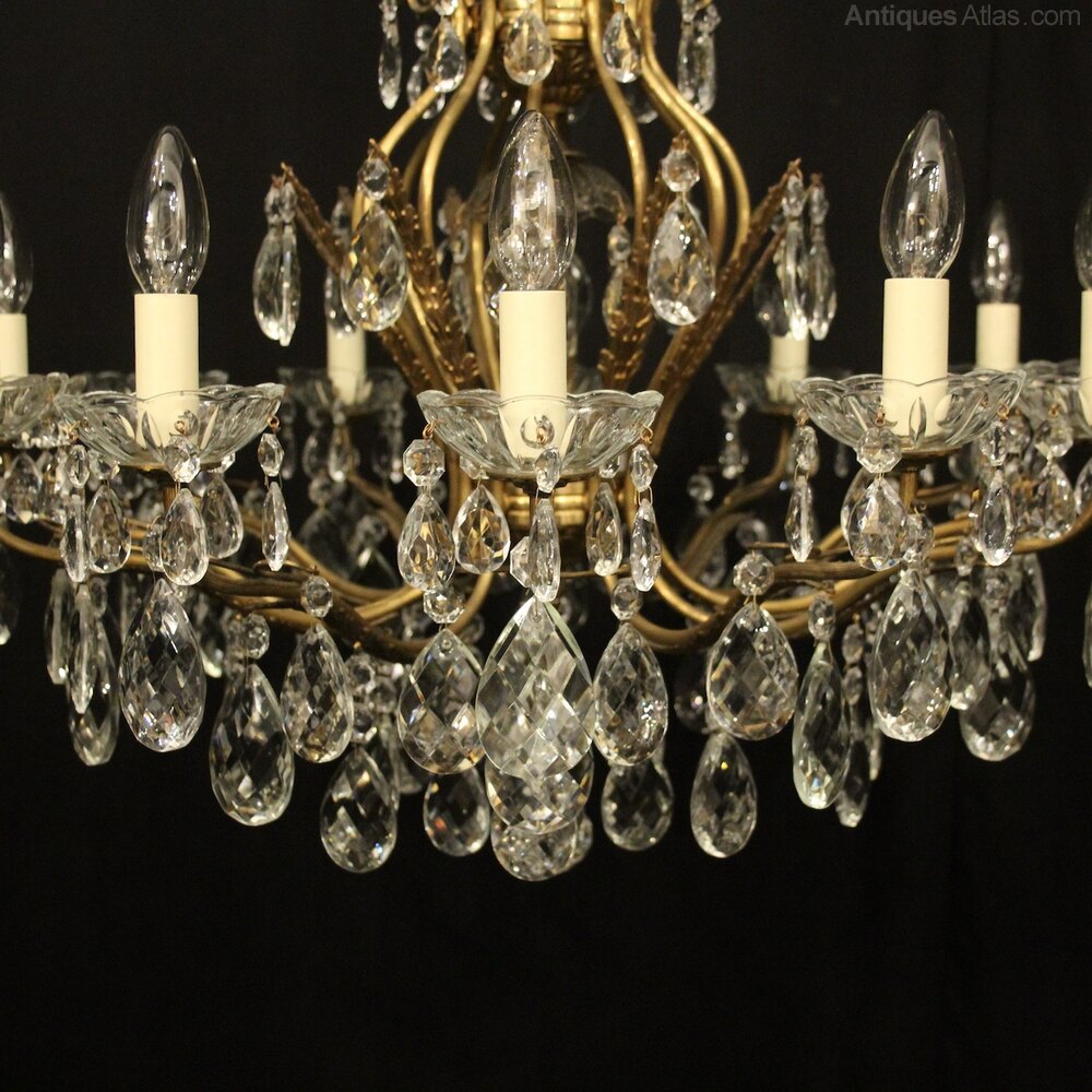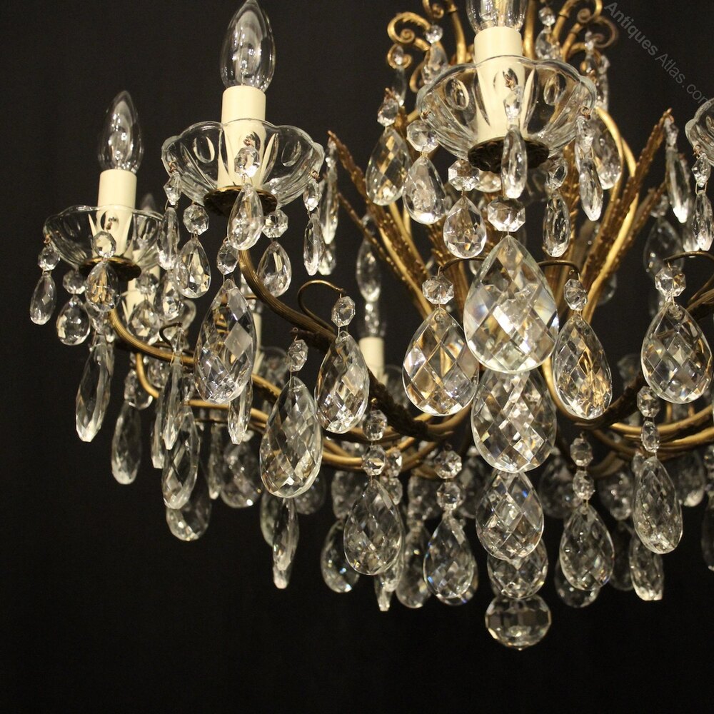 A French gilded brass and cut glass 13 light birdcage form antique chandelier, the 12 reeded leaf scrolling arms with glass bobeche drip pans, issuing from a cage form interior with a single inverted light fitting and leaf canopy, decorated overall with faceted cut glass pendants and having the original chain and ceiling rose. Great wide proportions. Fully rewired and PAT tested. All our chandeliers come with ceiling fixings and spare bulbs.