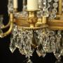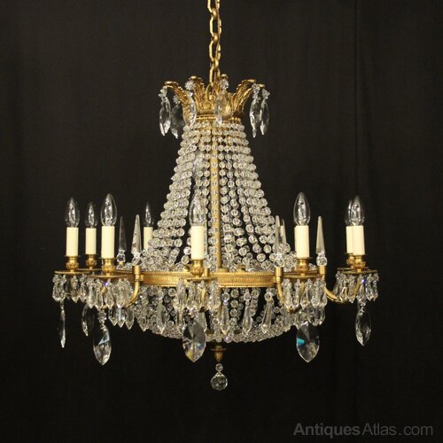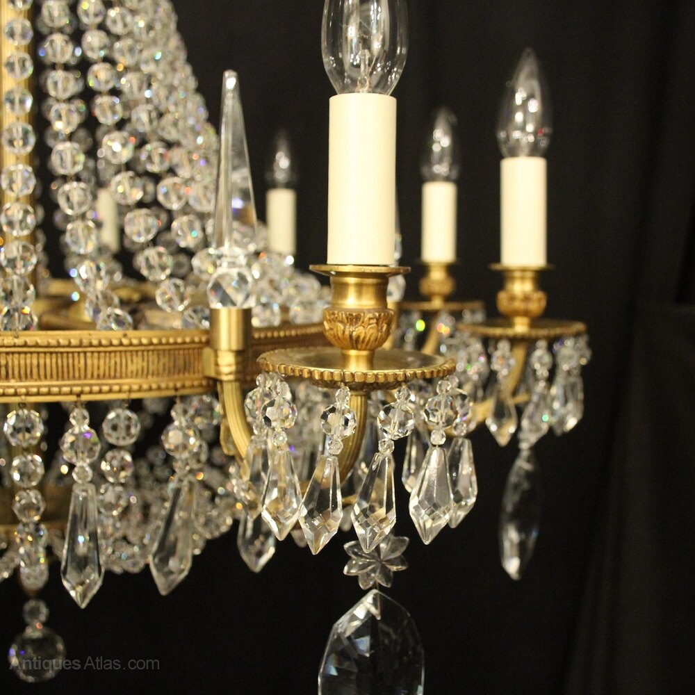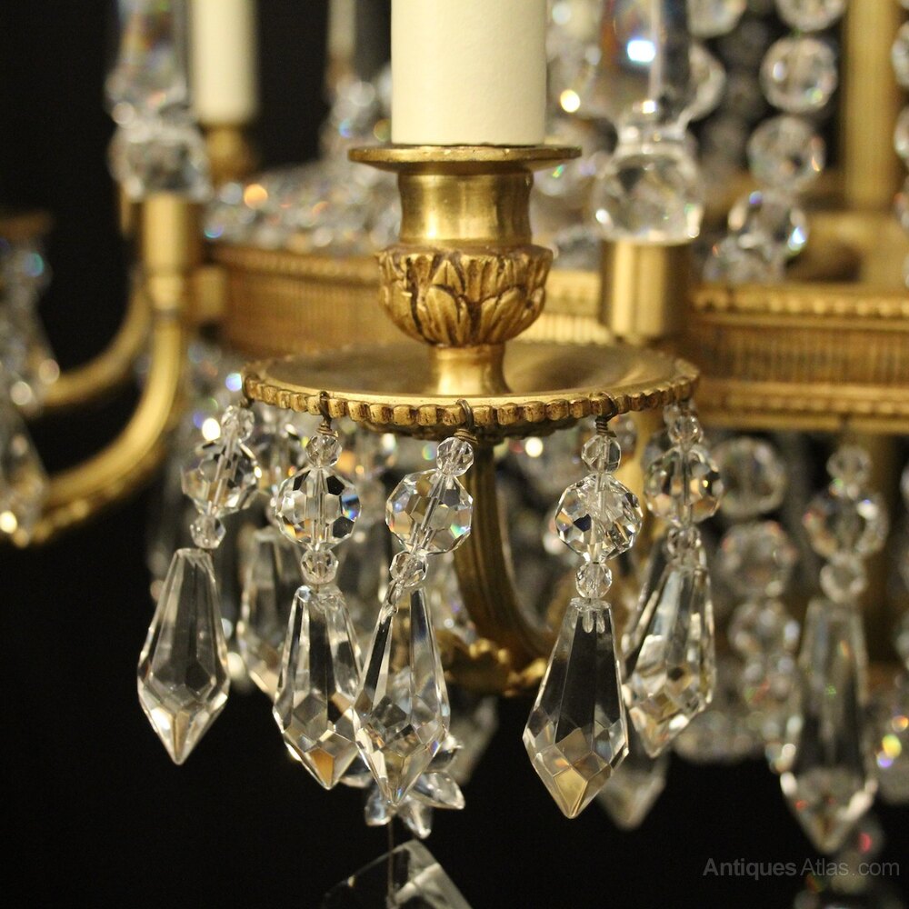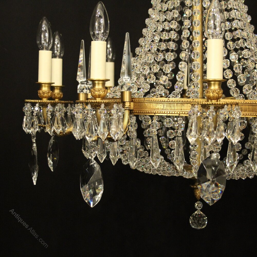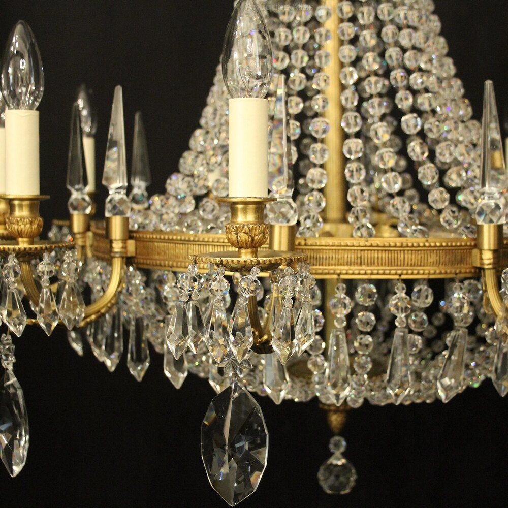 A French gilded bronze and crystal 15 light tent & waterfall chandelier, the 10 prismatic spike reeded leaf clad scrolling arms with circular millgrain bobeche drip pans and bulbous leaf candle sconces, issuing from a reeded central band and scrolling leaf canopy with 5 internal light fittings, decorated overall with graduated swaged crystal faceted pendants and having the original chain and ceiling rose, lovely quality gilding. Fully rewired and PAT tested. All our chandeliers come with bulbs and ceiling fixings. We have a pair of matching wall lights.