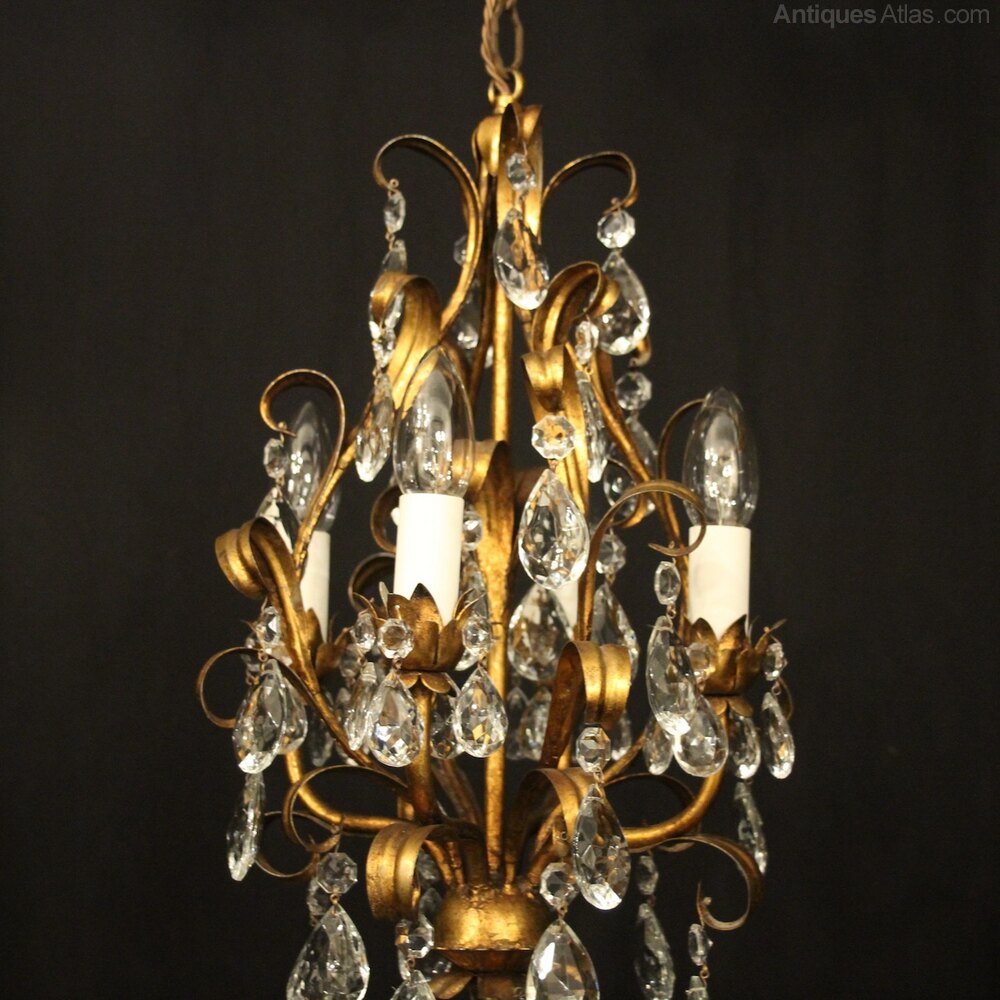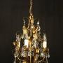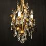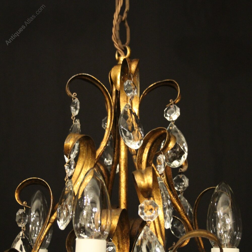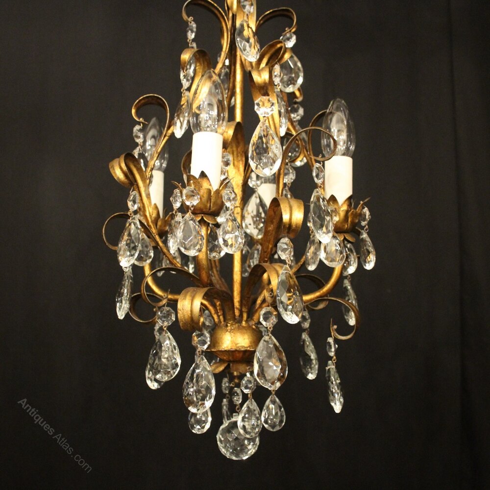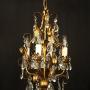 A decorative French gilded and crystal 4 light chandelier, the leaf clad scrolling arms with leaf foliated bobeche drip pans, issuing from an open cage centre, decorated over with faceted cut glass crystal pendants and having the original chain and ceiling rose, lovely original patination and very pretty. Fully rewired and PAT tested. All our chandeliers come with ceiling fixings and spare bulbs.