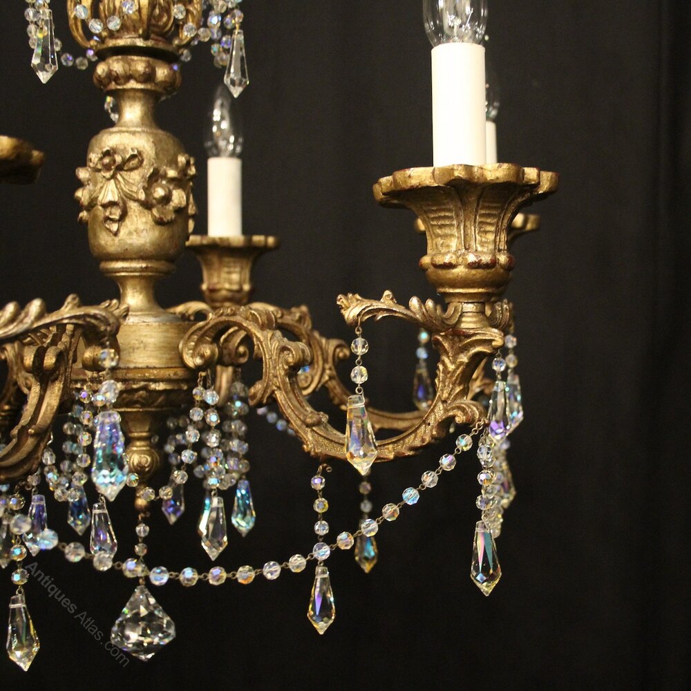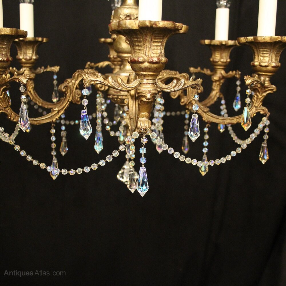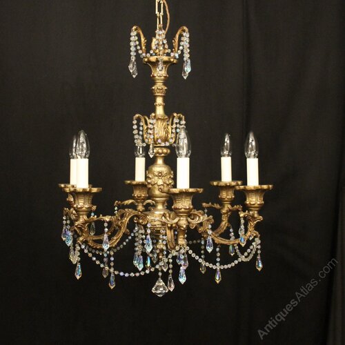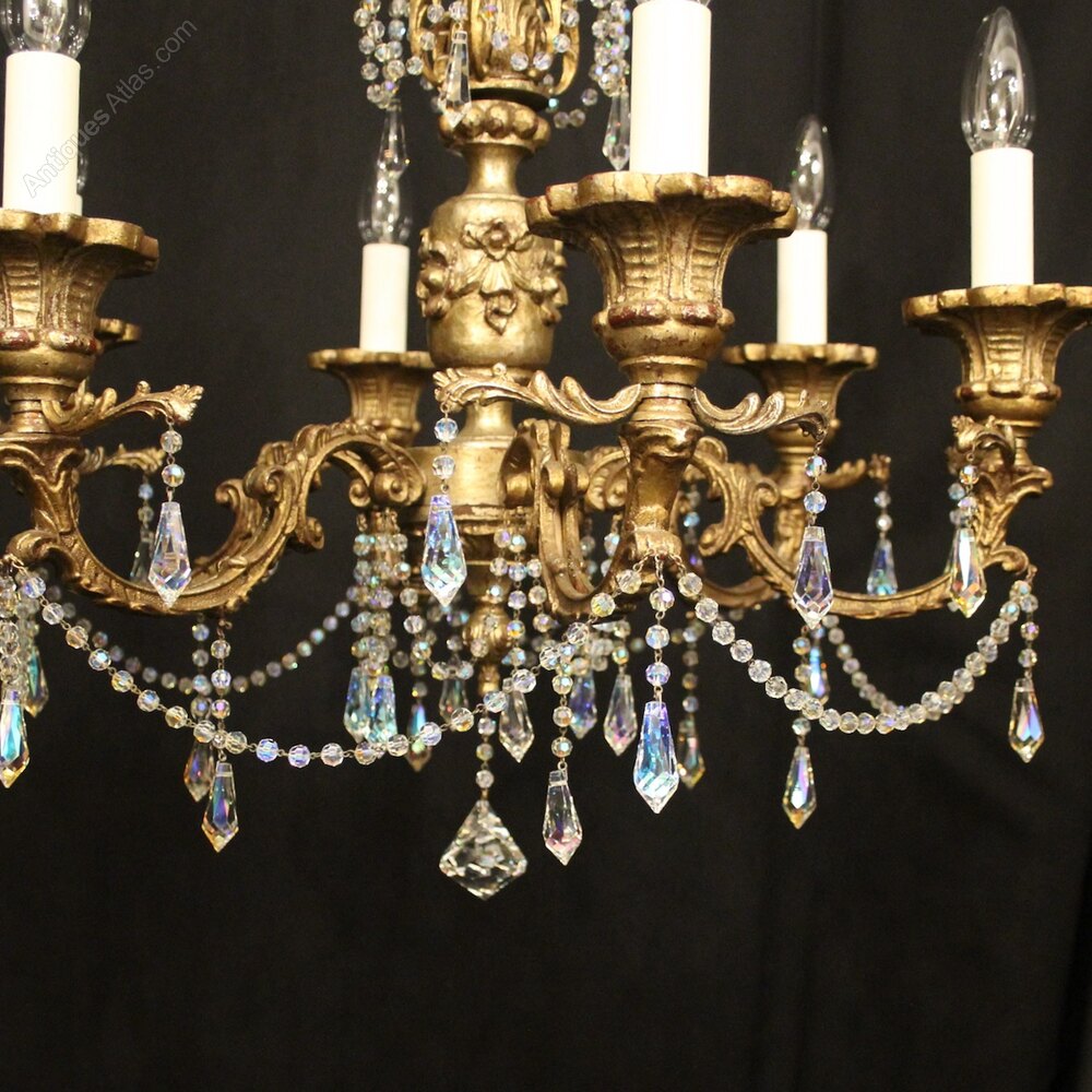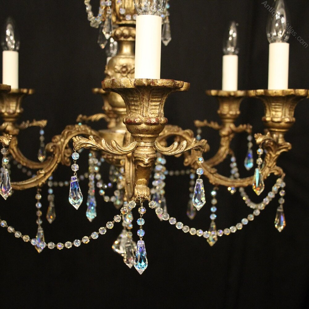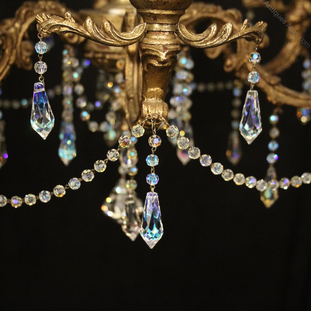 A French silver giltwood and Swarovski crystal 6 chandelier, the gilded metal scrolling arms with trumpet wooden bobeche drip pans, issuing from a foliated giltwood central column and scrolling leaf canopy, decorated overall with swaged Swarovski crystal faceted pendants and having the original chain and ceiling rose. Fully rewired and PAT tested. All our chandeliers come with bulbs and ceiling fixings.