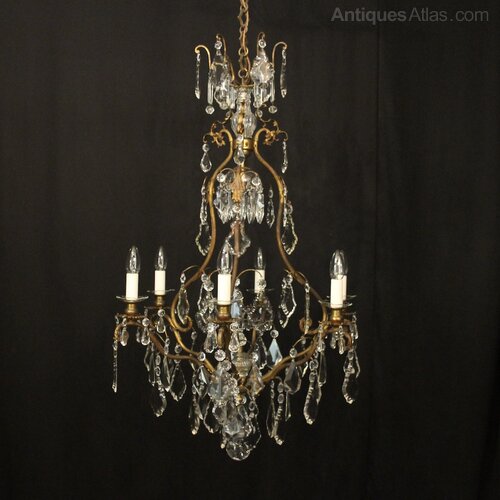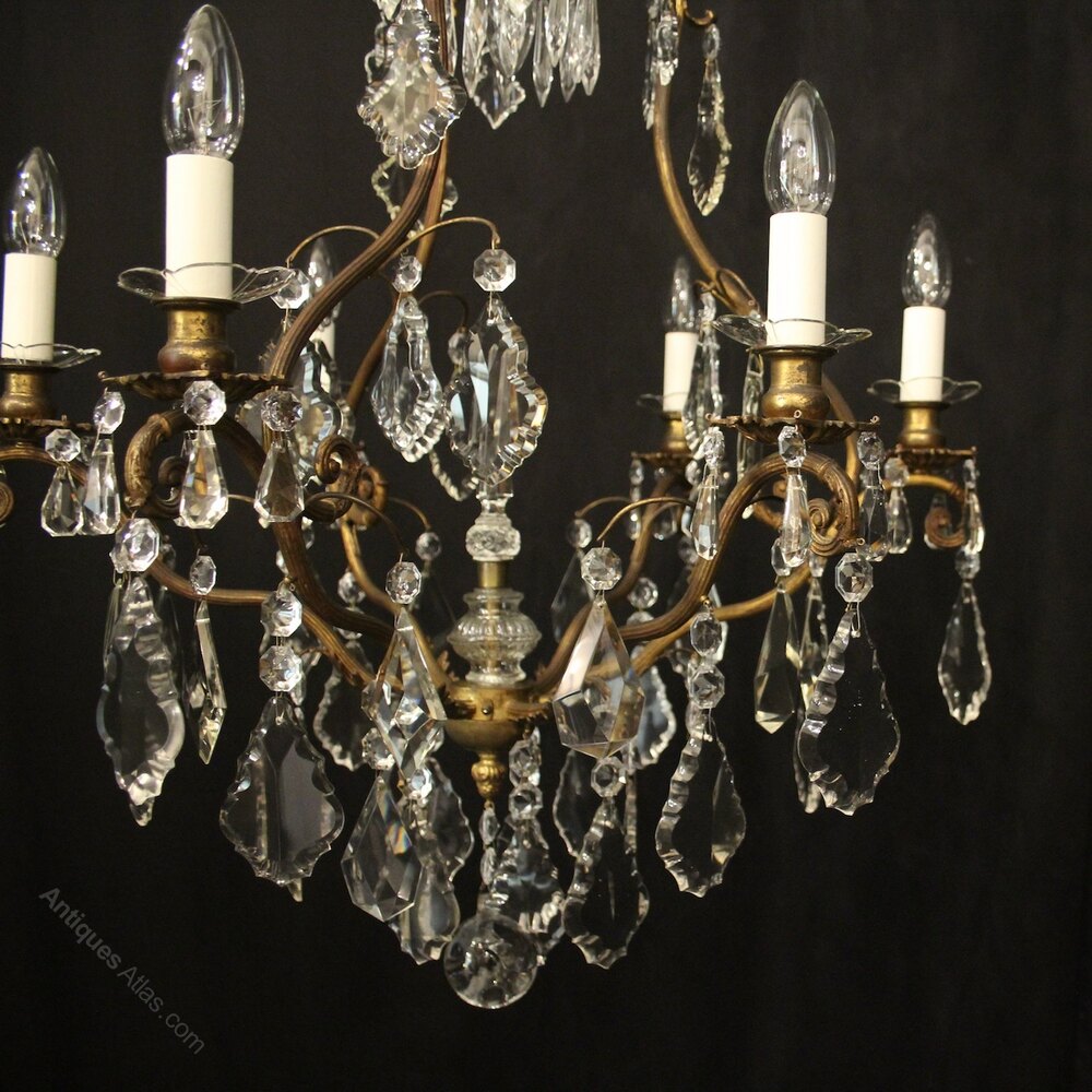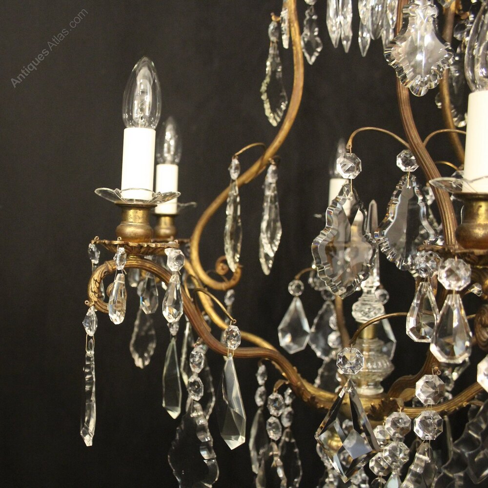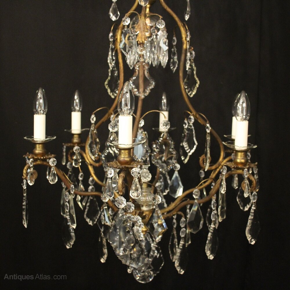 A French gilded brass and crystal 7 light birdcage form antique chandelier, the reeded scrolling arms with glass bobeche drip pans and bulbous candle sconces, issuing from a cage form interior with a single inverted light fitting with prismatic spike and glass baluster scrolling canopy, decorated overall with crystal faceted pendants and having the original chain and ceiling rose. Fully rewired and PAT tested. All our chandeliers come with bulbs and ceiling fixings.