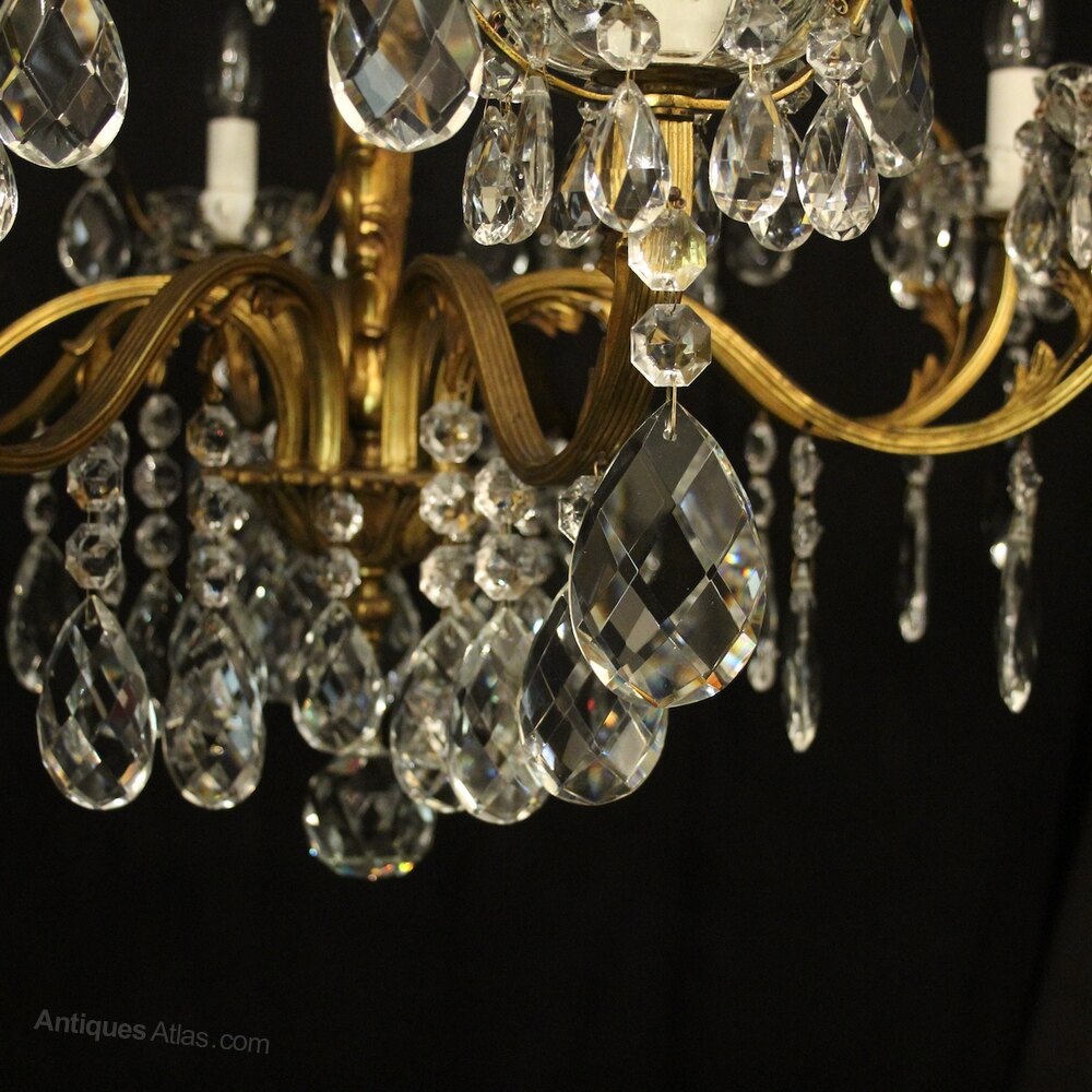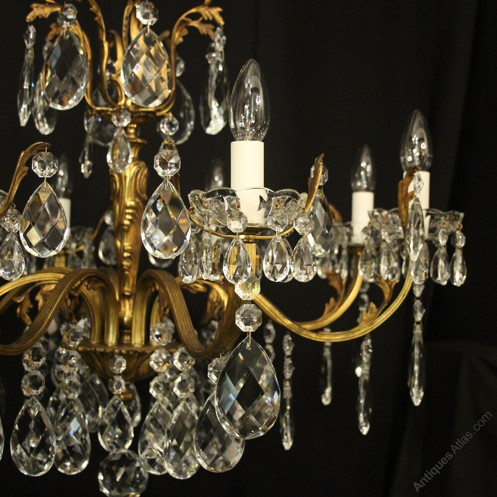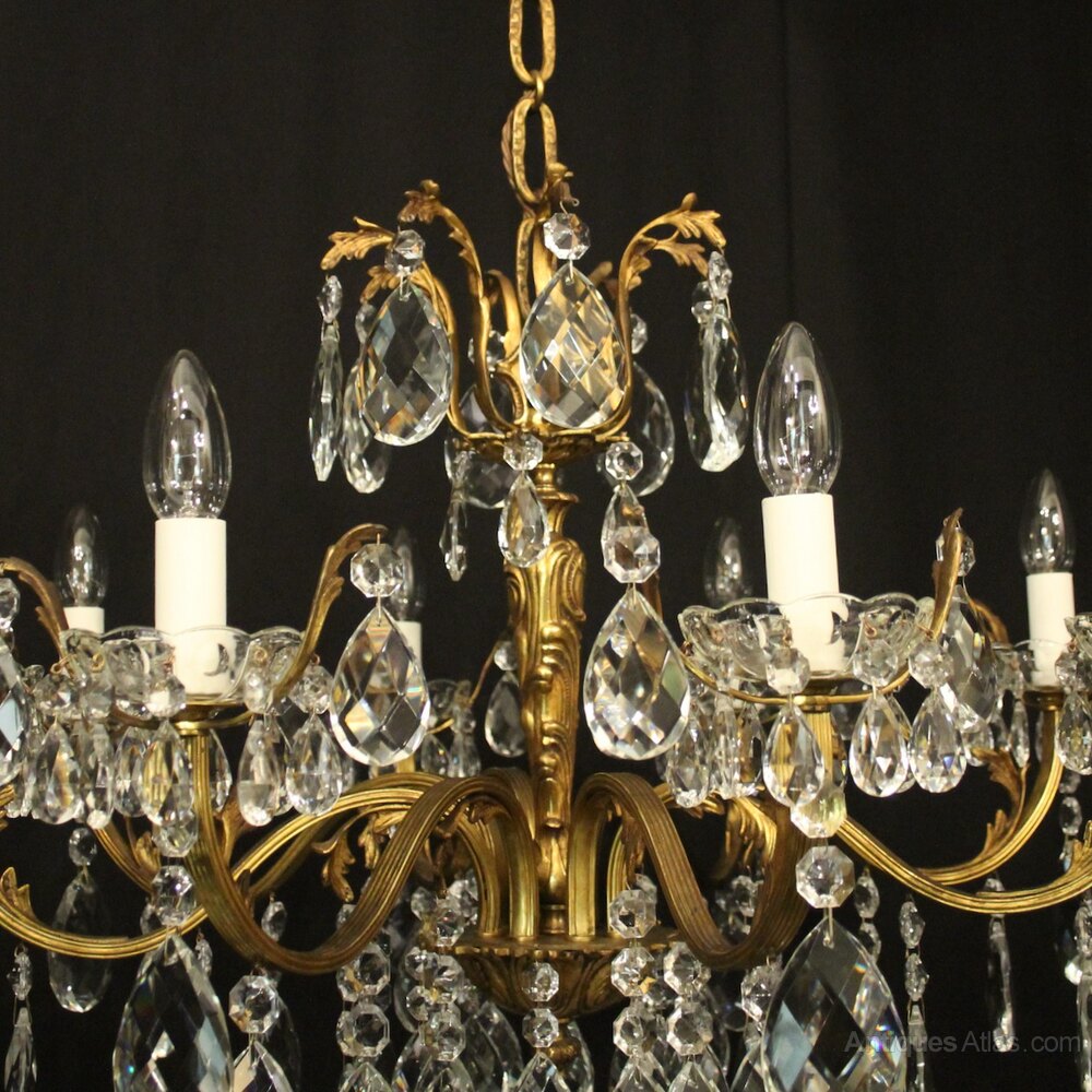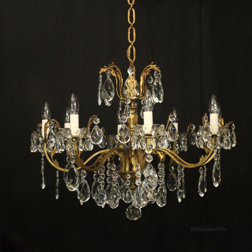 A quality French gilded bronze and crystal 8 light antique chandelier, the reeded leaf clad scrolling arms with crystal glass bobeche drip pans, issuing from an ornate foliated central column with scrolling leaf canopy, decorated overall in double pear faceted crystal pendants and having the original chain and ceiling rose. Great colour and nice wide proportions. Fully rewired and PAT tested. All our chandeliers come with ceiling fixings and spare bulbs.