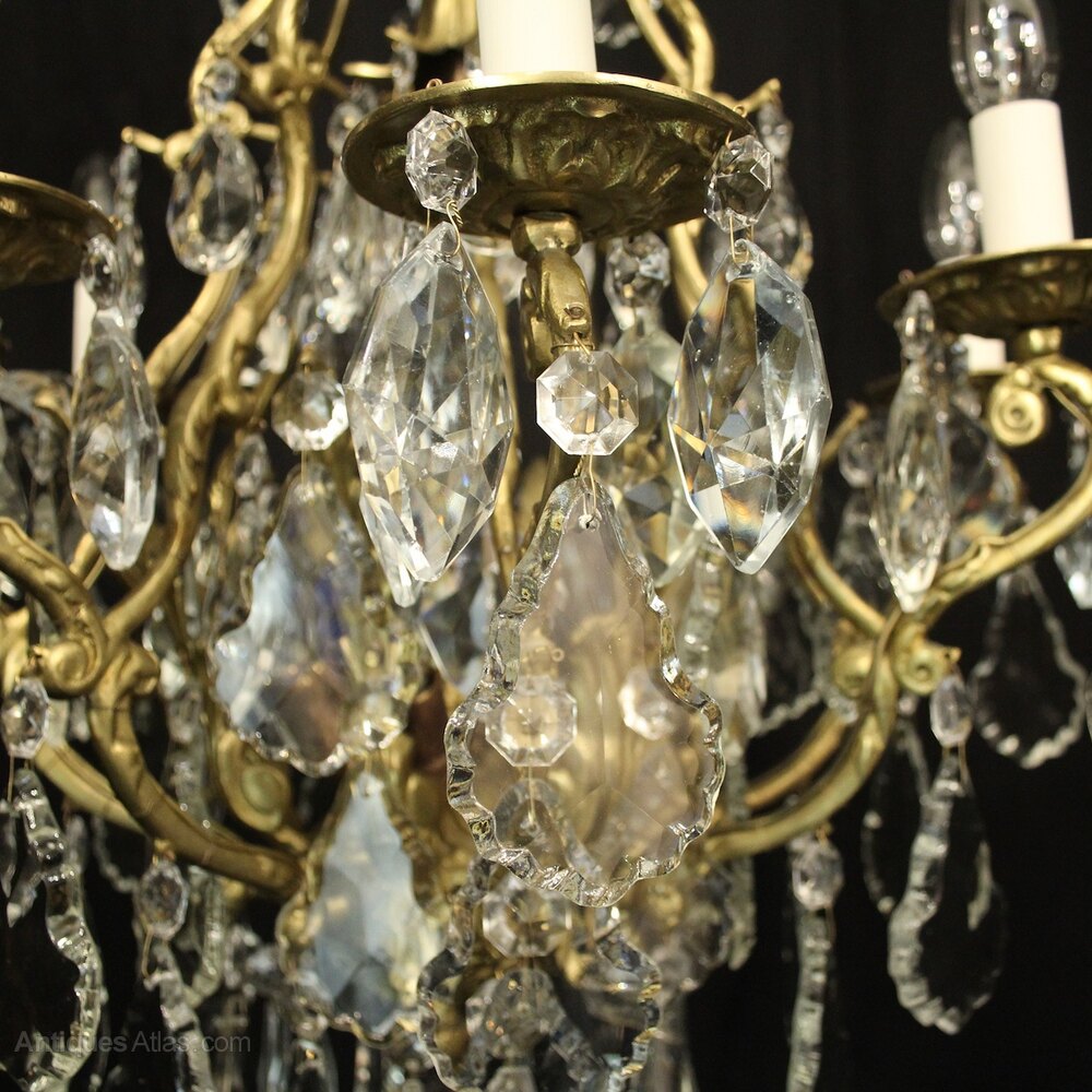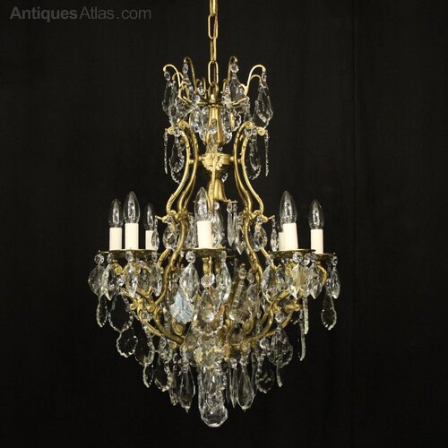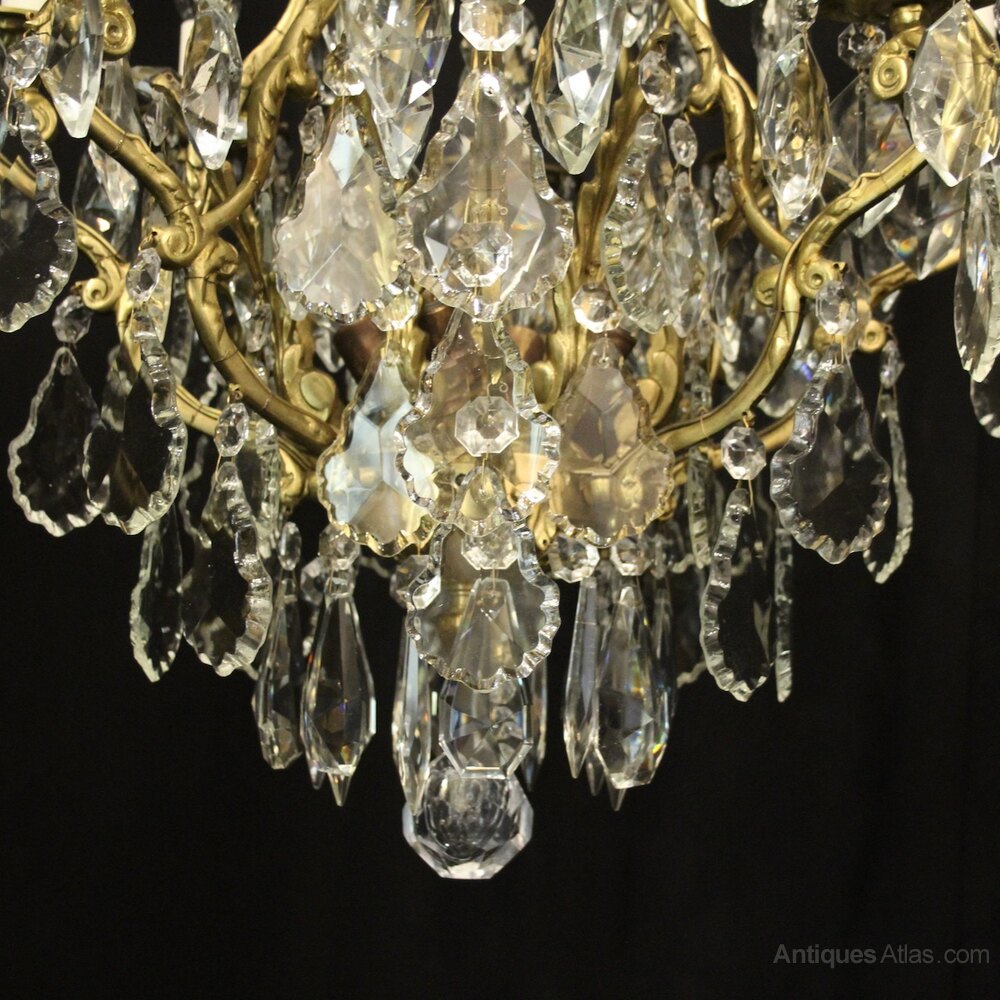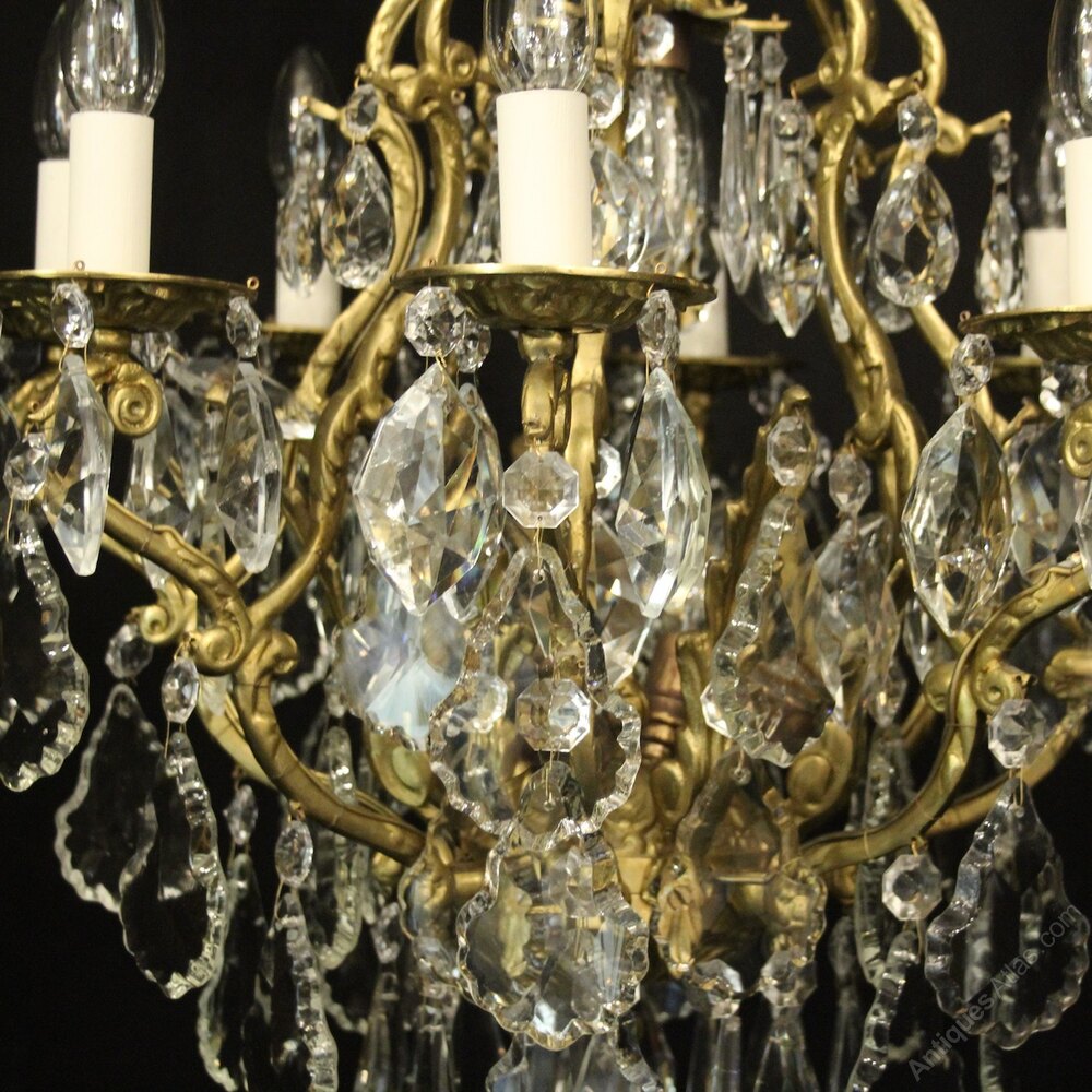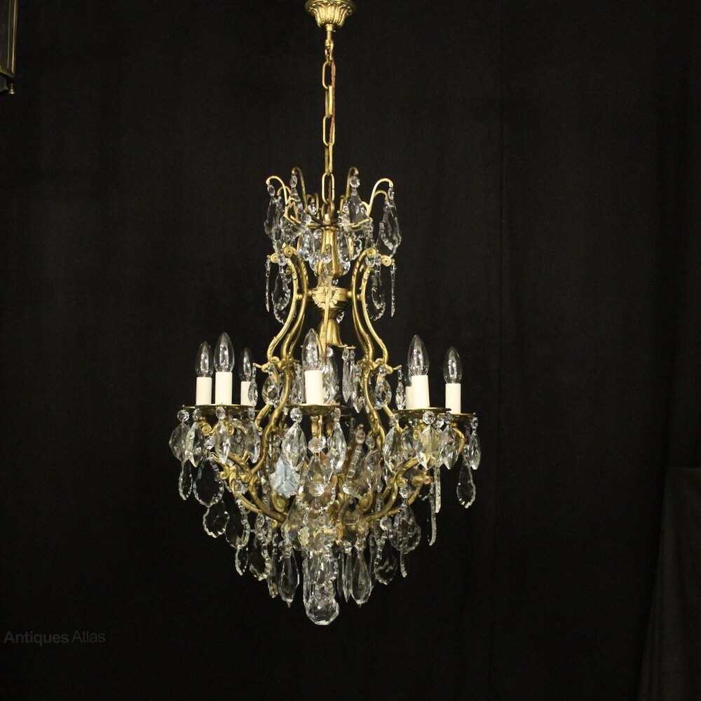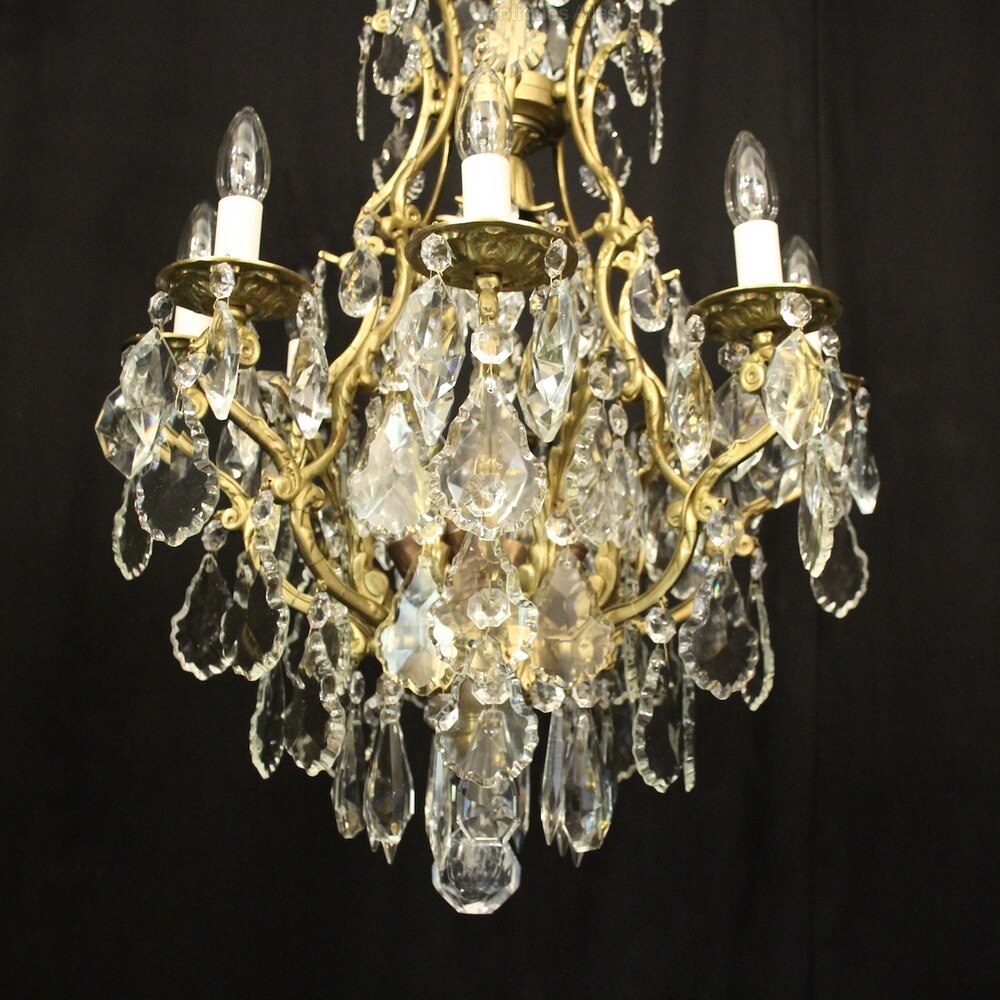 A French gilded brass and crystal 9 light birdcage form chandelier, the eight scrolling arms with circular leaf bobeche drip pans, issuing from a foliated cage form interior with a single inverted light fitting, decorated overall with faceted crystal pendants and having the original chain and ceiling rose. Fully rewired and PAT tested. All our chandeliers come with bulbs and ceiling fixings.