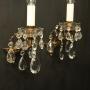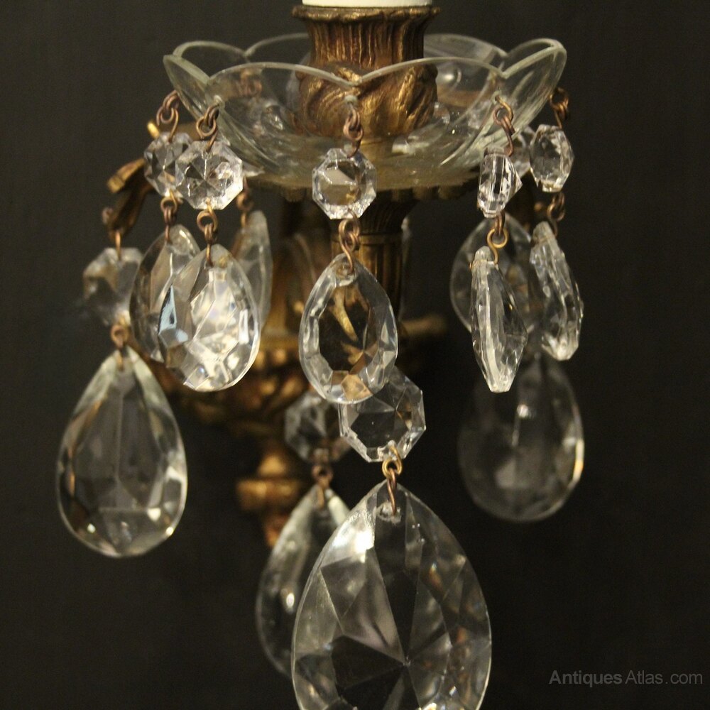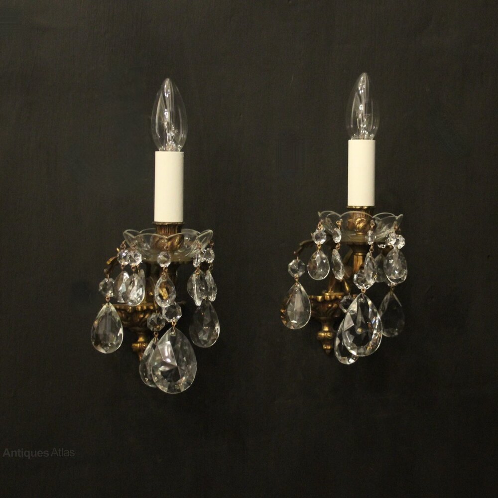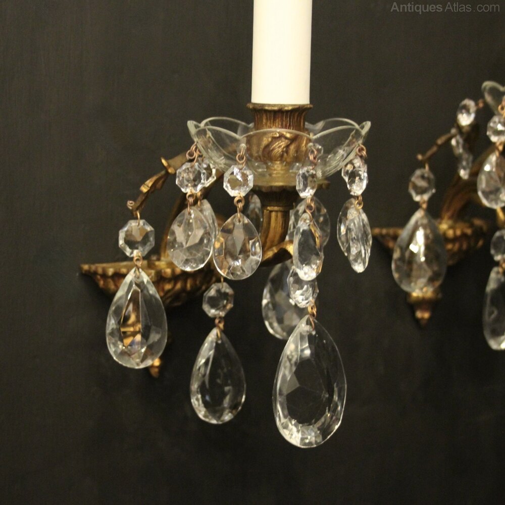 A French pair of gilded brass and crystal single arm antique wall lights, the leaf scrolling arms with glass bobeche drip pans and bulbous candle sconces, issuing from a small tapering backplate and decorated with crystal faceted pendants. Fully rewired and PAT tested. All our wall lights come with aged brass screws for fixing and spare bulbs.