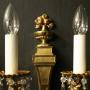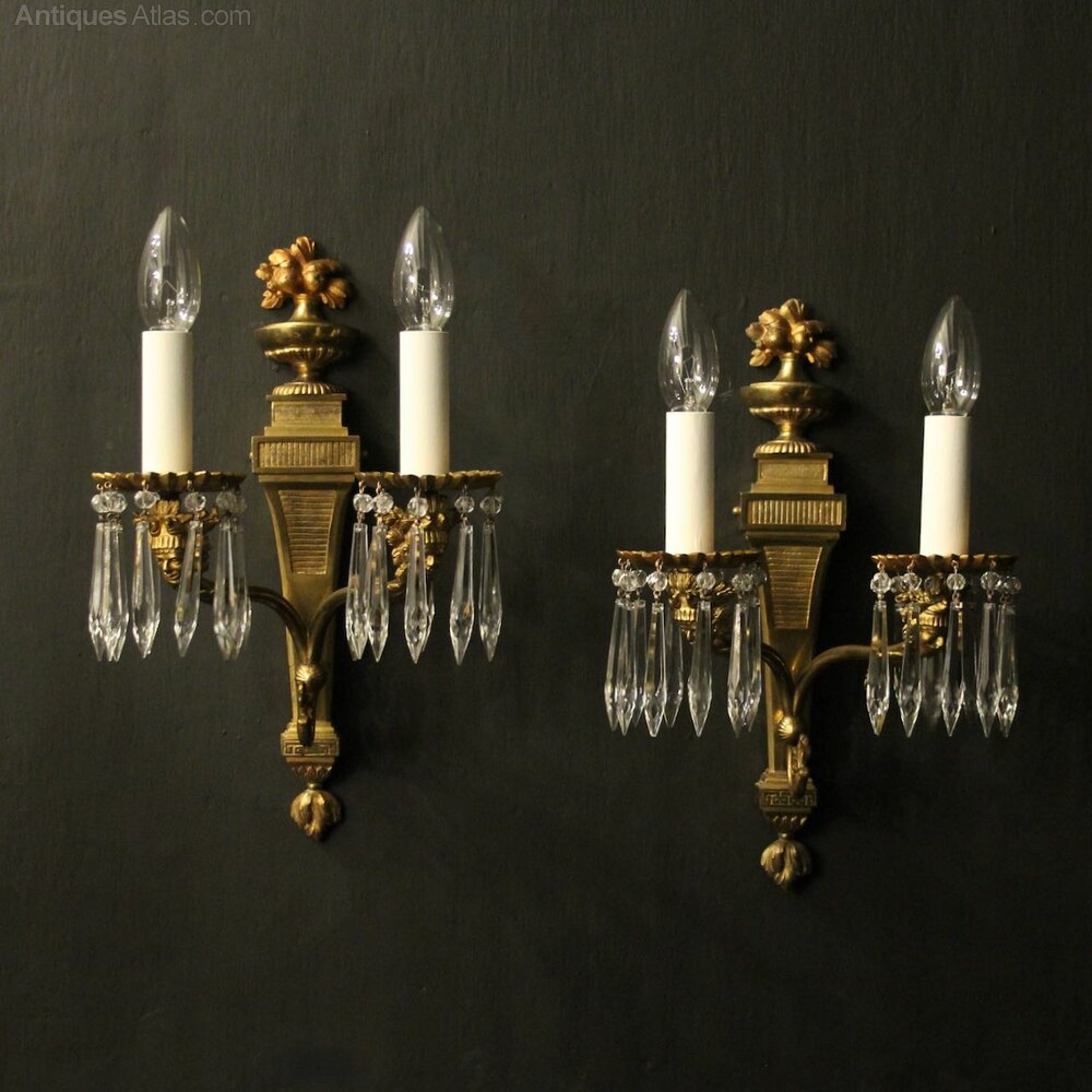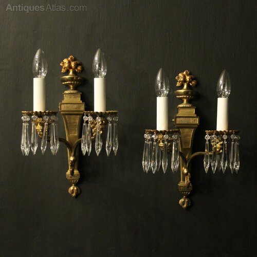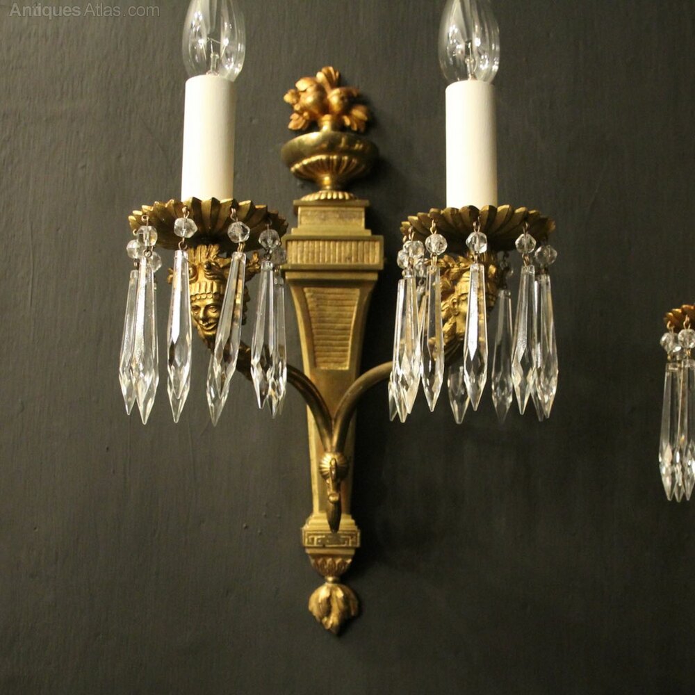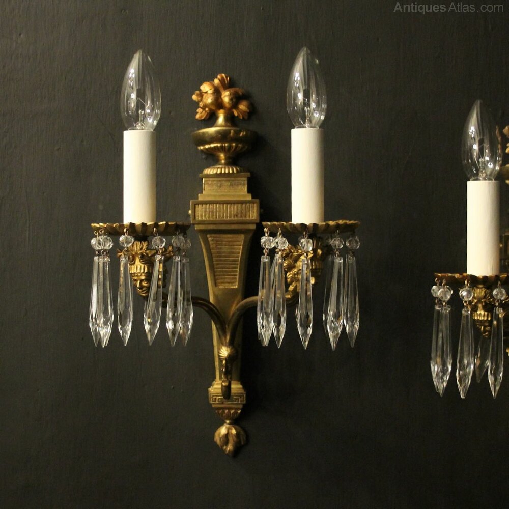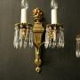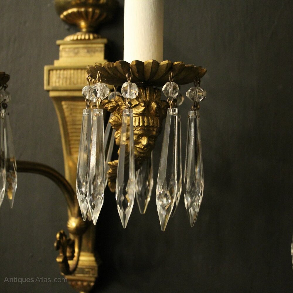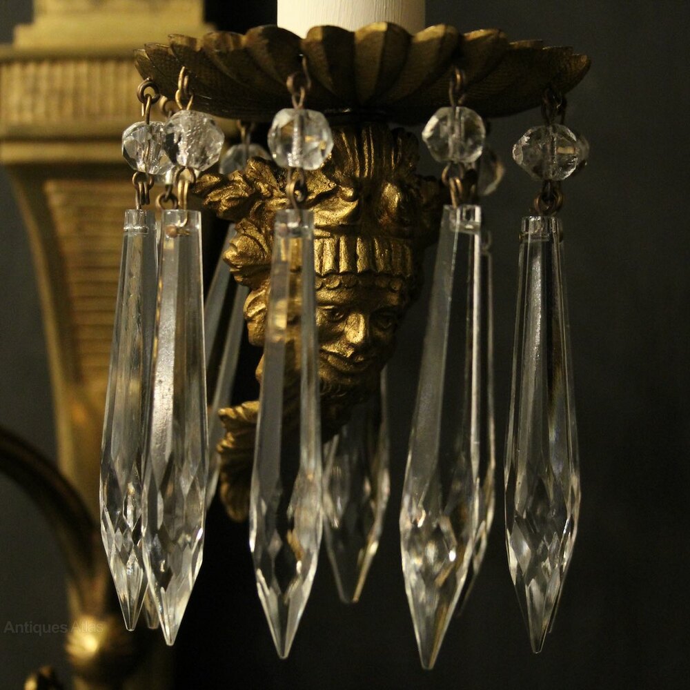 A French pair of gilded bronze and crystal twin arm antique wall lights, the scrolling arms with ornate leaf clad female heads and sectional bobeche drip pans, issuing from an tapering backplate with floral urn canopy and decorated with icicle crystal faceted pendants. Fully rewired and PAT tested. All our wall lights come with aged brass screws or brackets for fixing and spare bulbs.