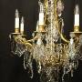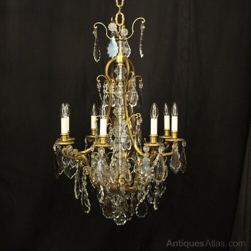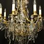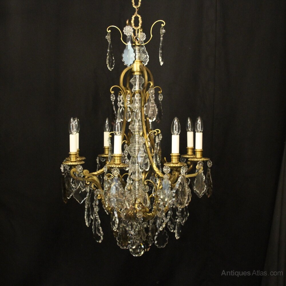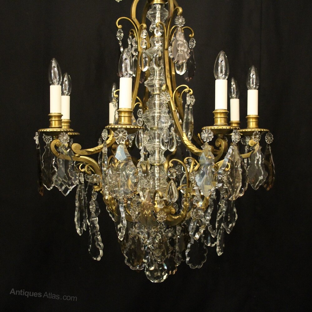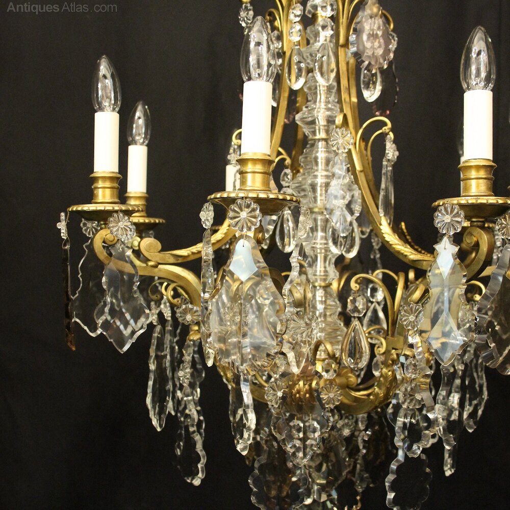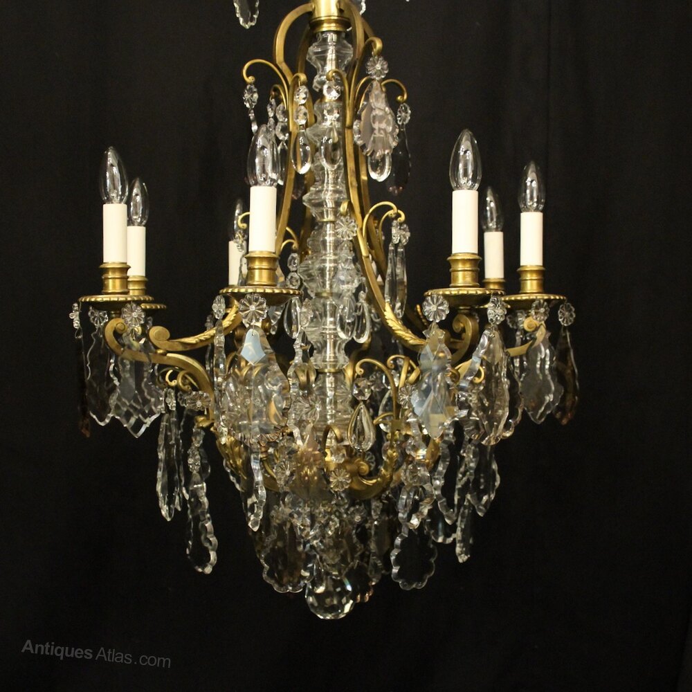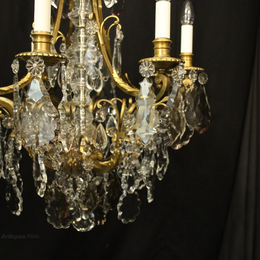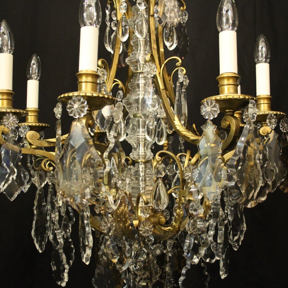 A lovely French gilded bronze and crystal 12 light birdcage form antique chandelier, the eight square gauge scrolling arms with circular bobeche drip pans and banded candle sconces, issuing from an ornate glass baluster central column having 4 internal leaf light fittings, with leaf scrolling canopy, decorated overall with Slab clear and smoked crystal faceted pendants, having the original chain and ceiling rose, lovely original gilded patination and nice quality casting. Fully rewired and PAT tested. All our chandeliers come with bulbs and ceiling fixings.
