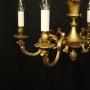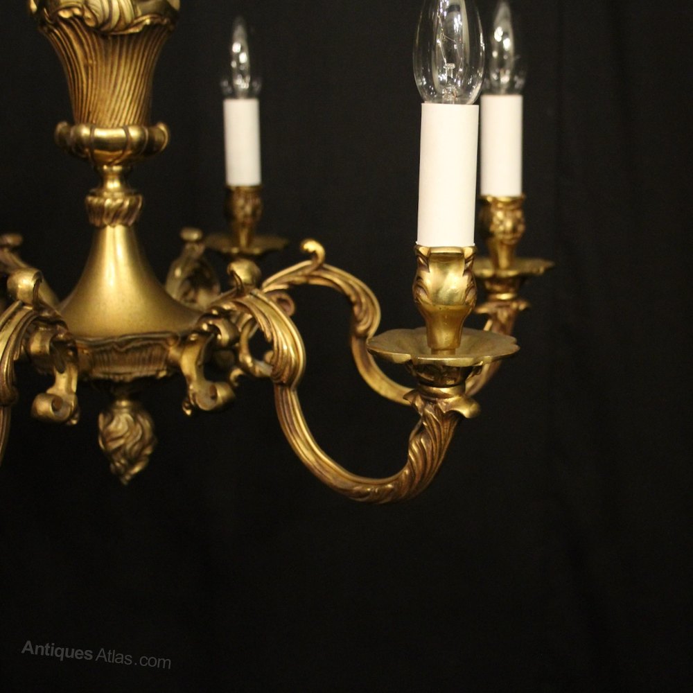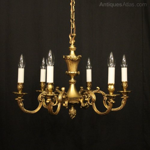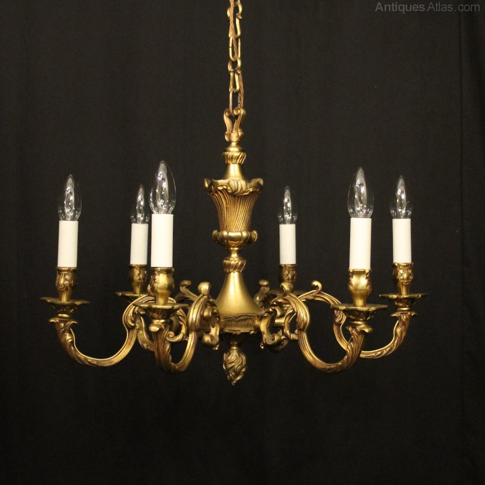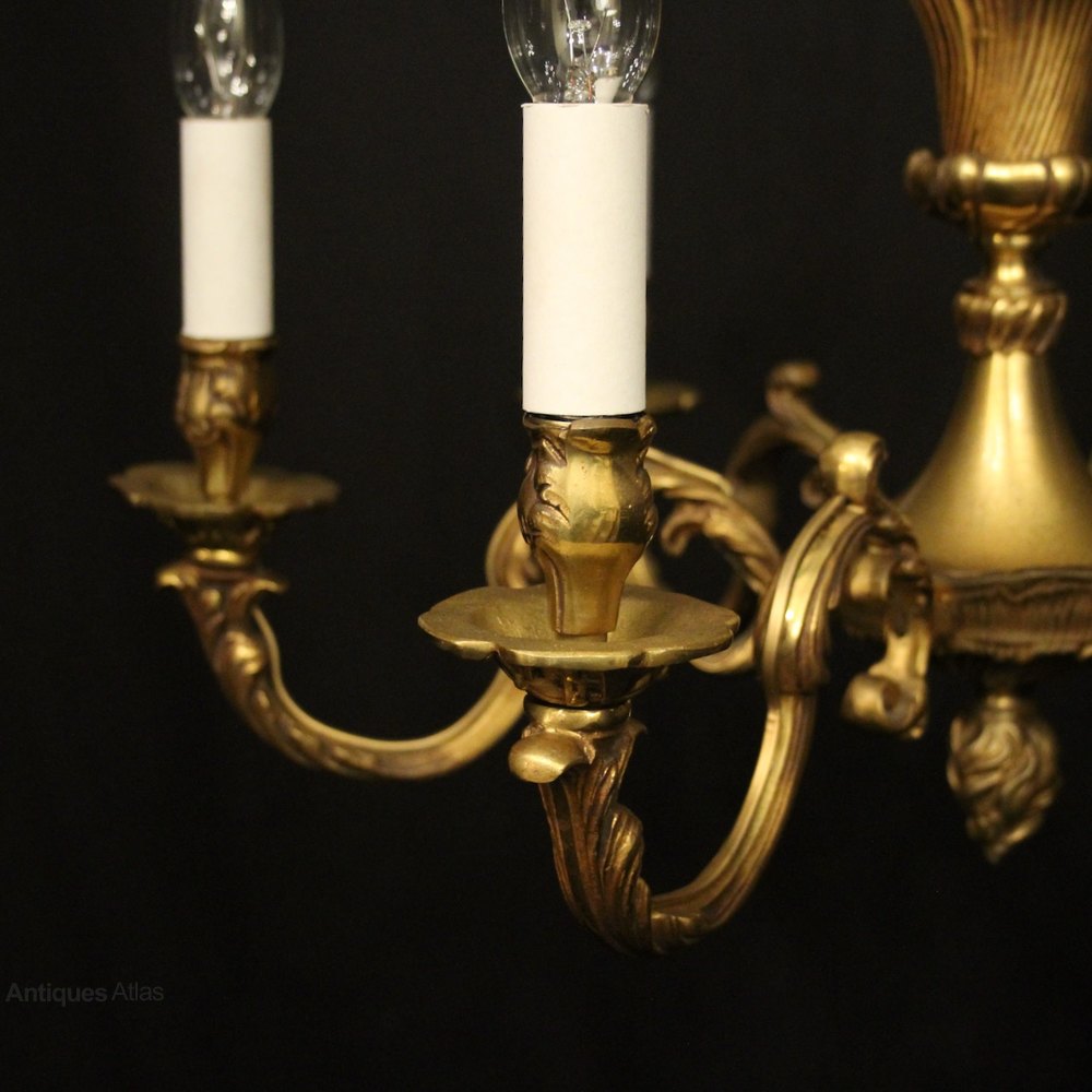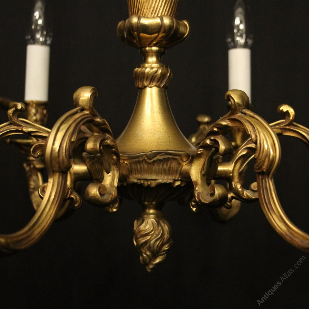 A French gilded bronze 6 light antique chandelier, the leaf clad scrolling arms with circular bobeche drip pans and bulbous candle sconces, issuing from a tapering reeded urn central column with leaf base and flame finial, having the original chain and ceiling rose, nice original patination. Fully rewired and PAT tested. All our chandeliers come with bulbs and ceiling fixings.