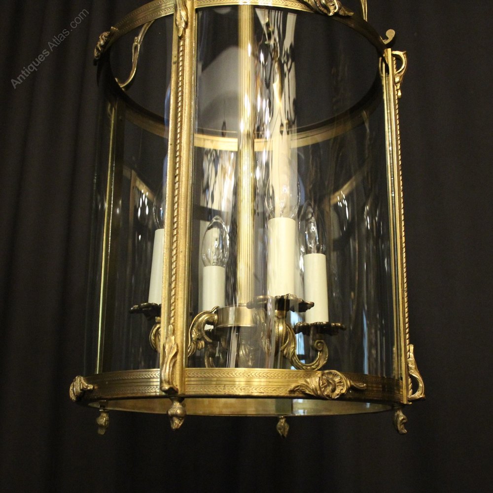 A large French gilded cast bronze four light antique hall lantern, the four ornate scrolling light fittings with leaf bobeche drip pans, surrounded by four sectional convex glass panels and held within an ornately cast scrolling framework with side reeded panels, decorative embellishments and open top scrolling canopy, having the original chain and ceiling rose, excellent original patination and a good large size. Fully rewired and PAT tested.