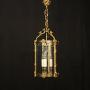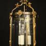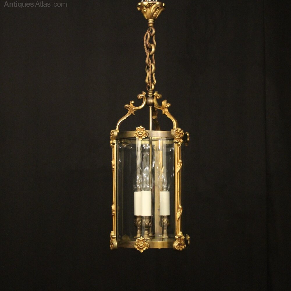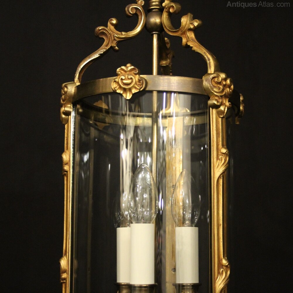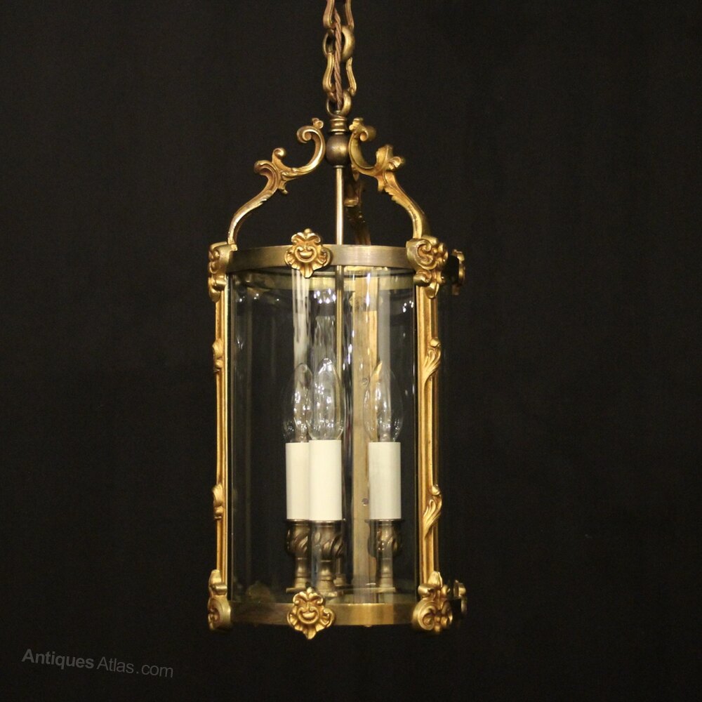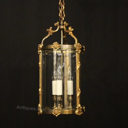 A French gilded bronze triple light antique hall lantern, the bulbous candle sconces, surrounded by sectional circular convex glass panels and held within an ornately cast heavy gauge scrolling framework with side reeded panels, decorative embellishments and open scrolling canopy, having the original chain and ceiling rose, Stamped L.C for Lucian Gau a great French bronze lighting manufacturer and designer, excellent original patination and a lovely scale. Fully rewired and PAT tested. All our lanterns come with bulbs and ceiling fixings.