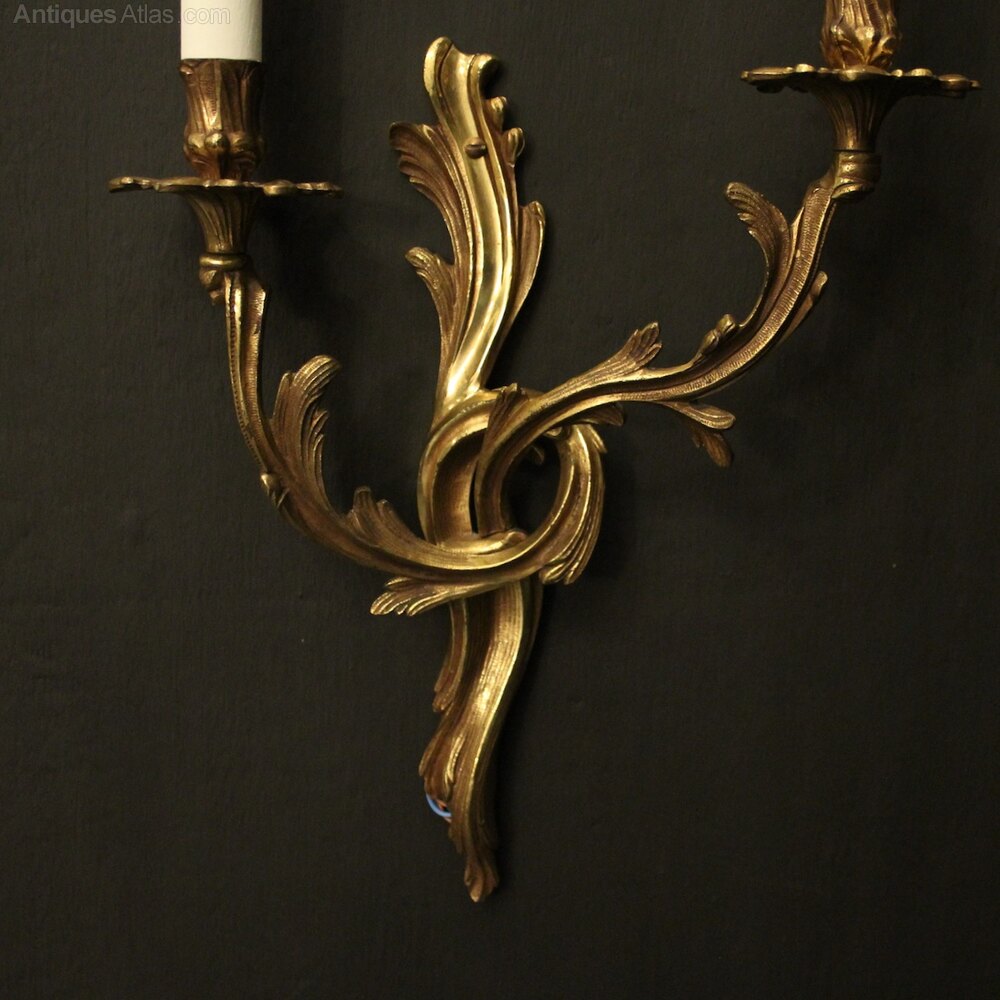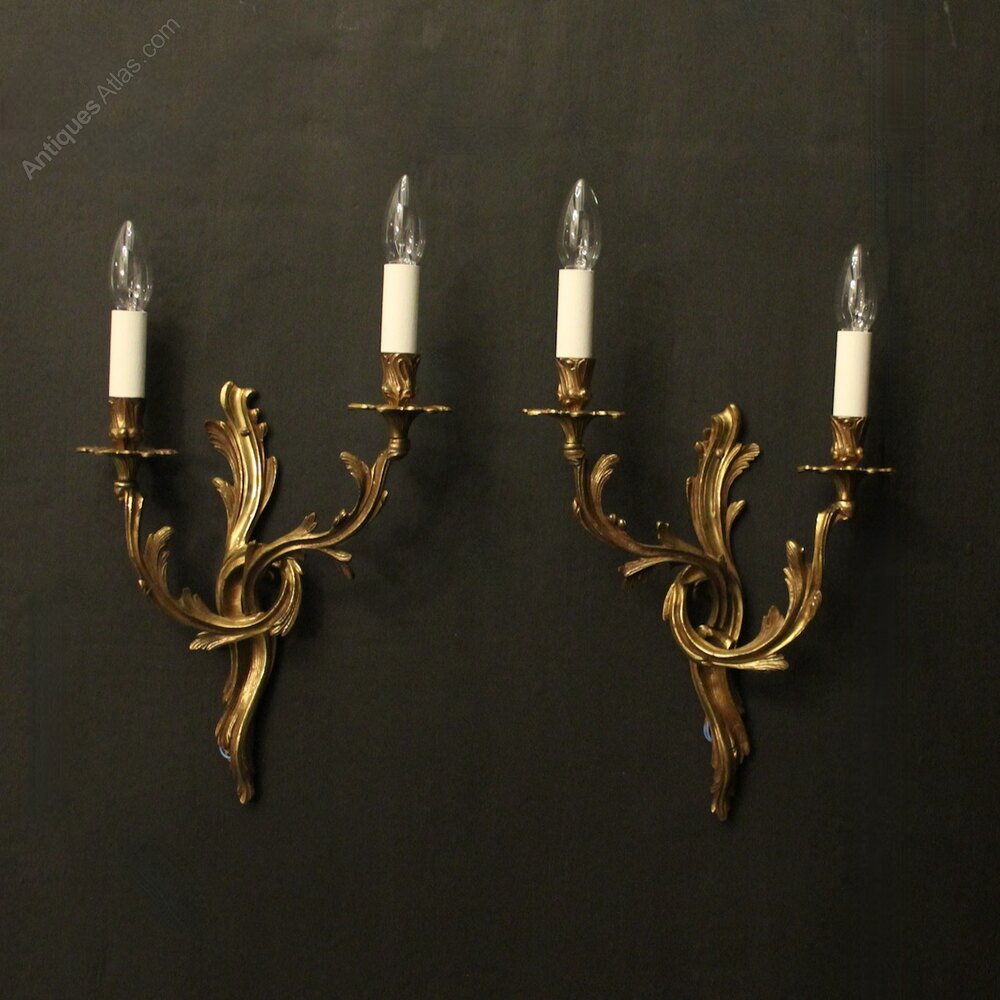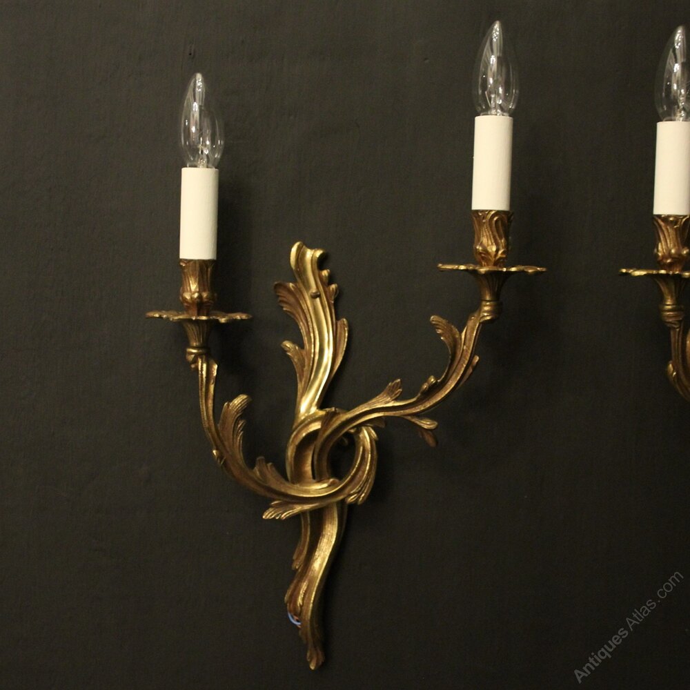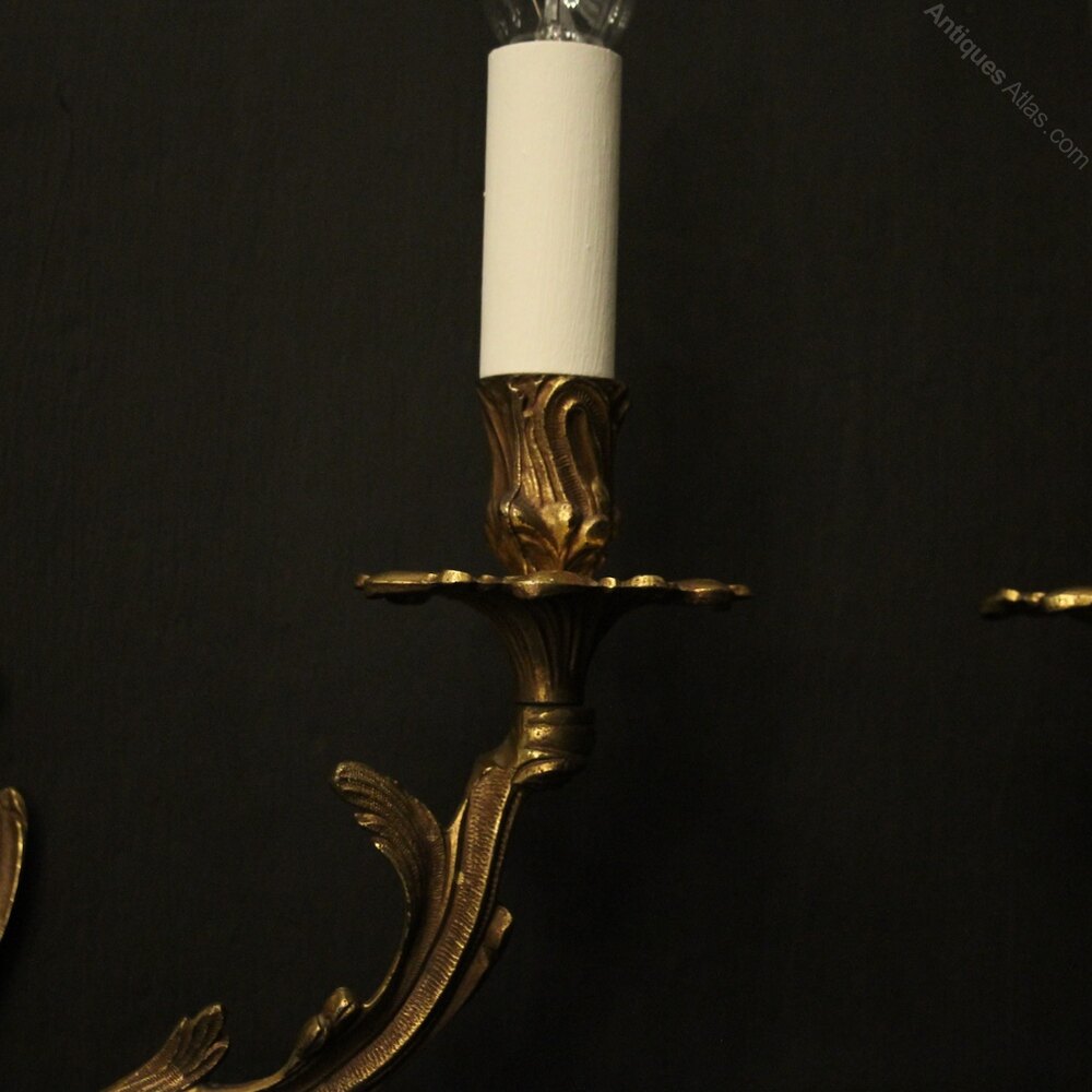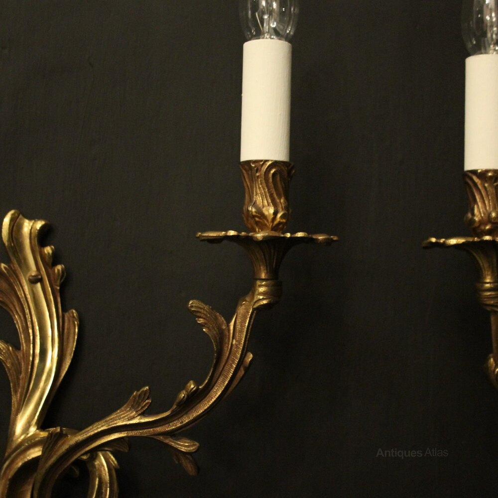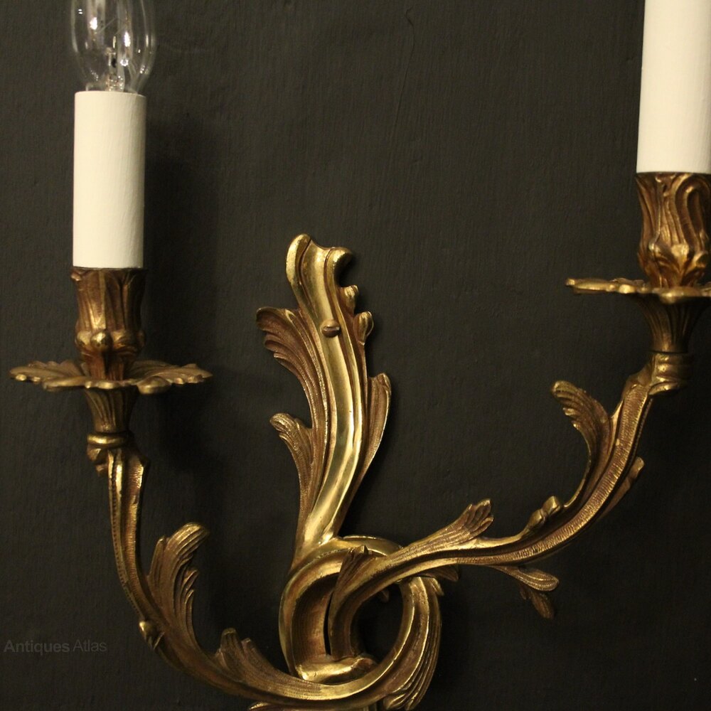 A French pair of gilded brass twin arm antique wall lights, the tiered leaf clad scrolling arms with foliated bobeche drip pans and bulbous candle sconces, issuing from an opposing leaf backplate. Fully rewired and PAT tested. All our wall lights come with aged brass screws or brackets for fixing and spare bulbs.