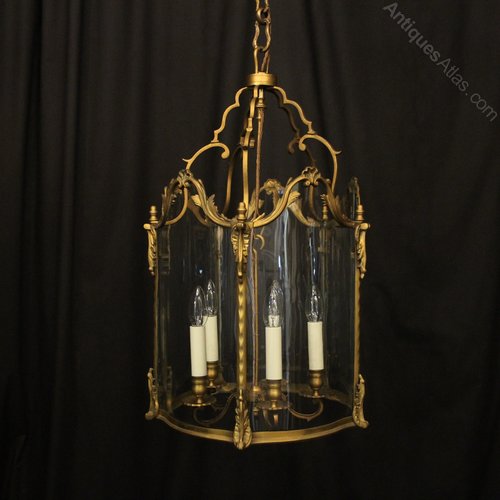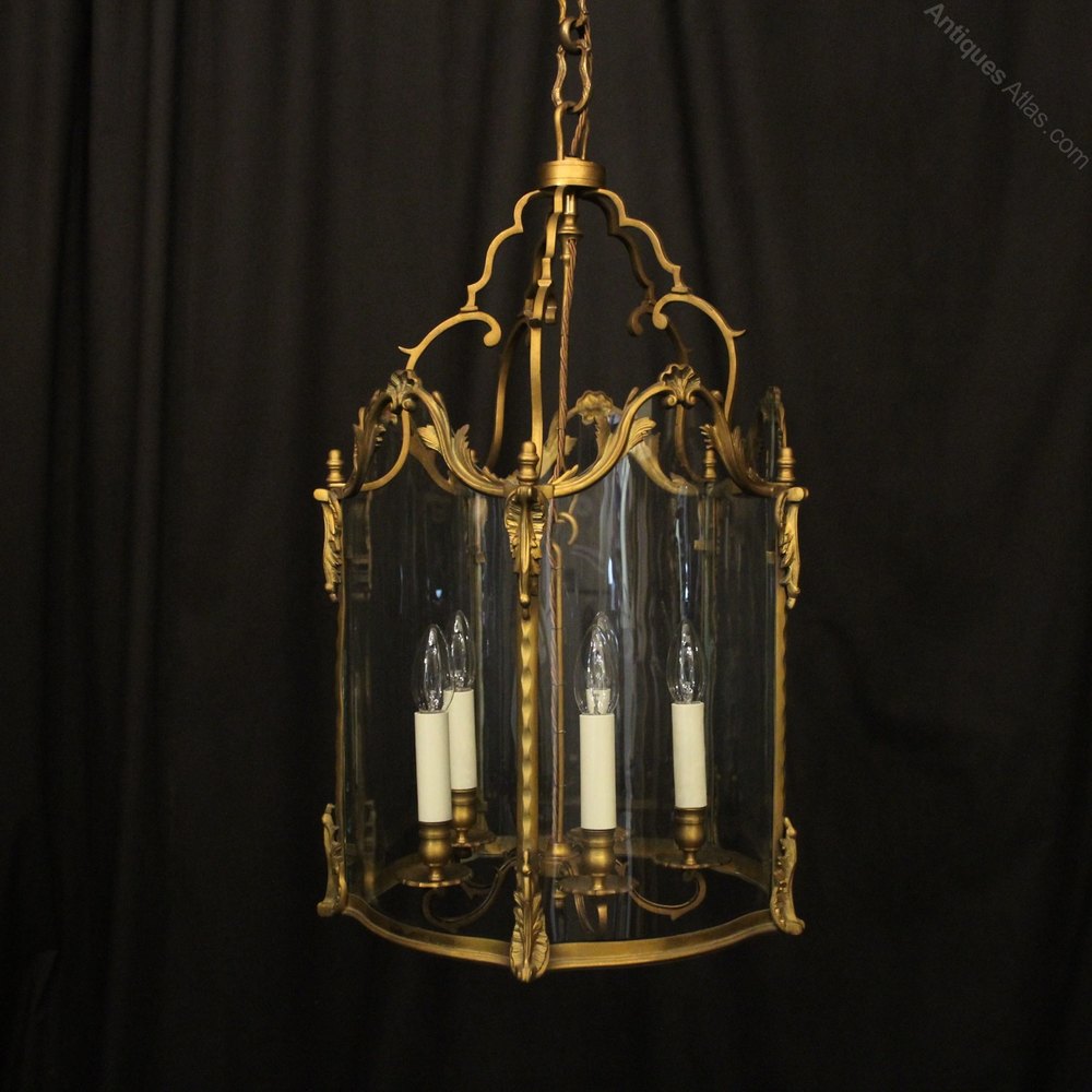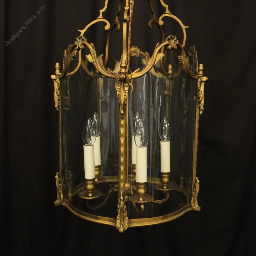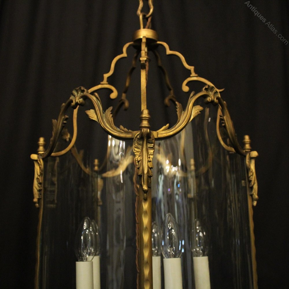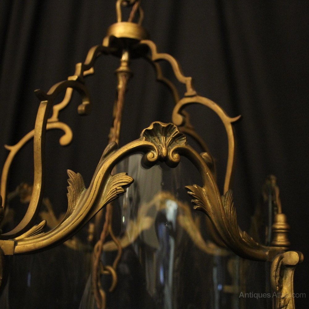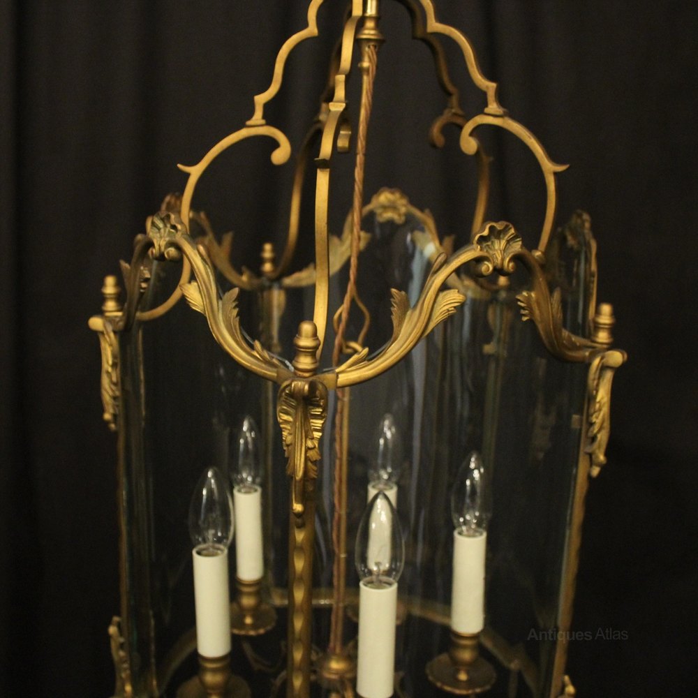 A French 19th Century gilded bronze five light antique hall lantern, the five scrolling light fittings with circular bobeche drip pans and bulbous candle sconces, surrounded by serpentine shaped glass panels and held within an ornate scrolling framework with leaf side panels, ornate central cartouche shields with open scrolling canopy, having the original chain and ceiling rose, originally candle and sympathetically converted to electricity, well cast and nice original faded patination. Fully rewired and PAT tested. All our lanterns come with bulbs and ceiling fixings.