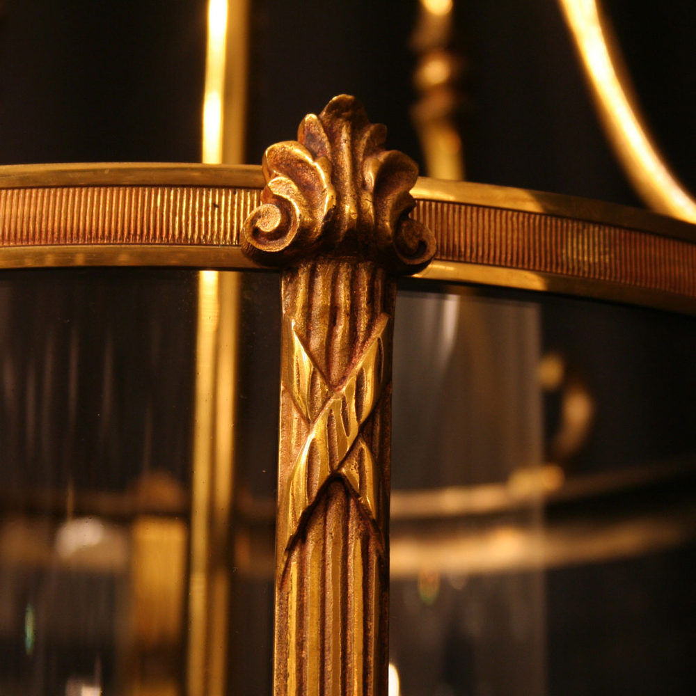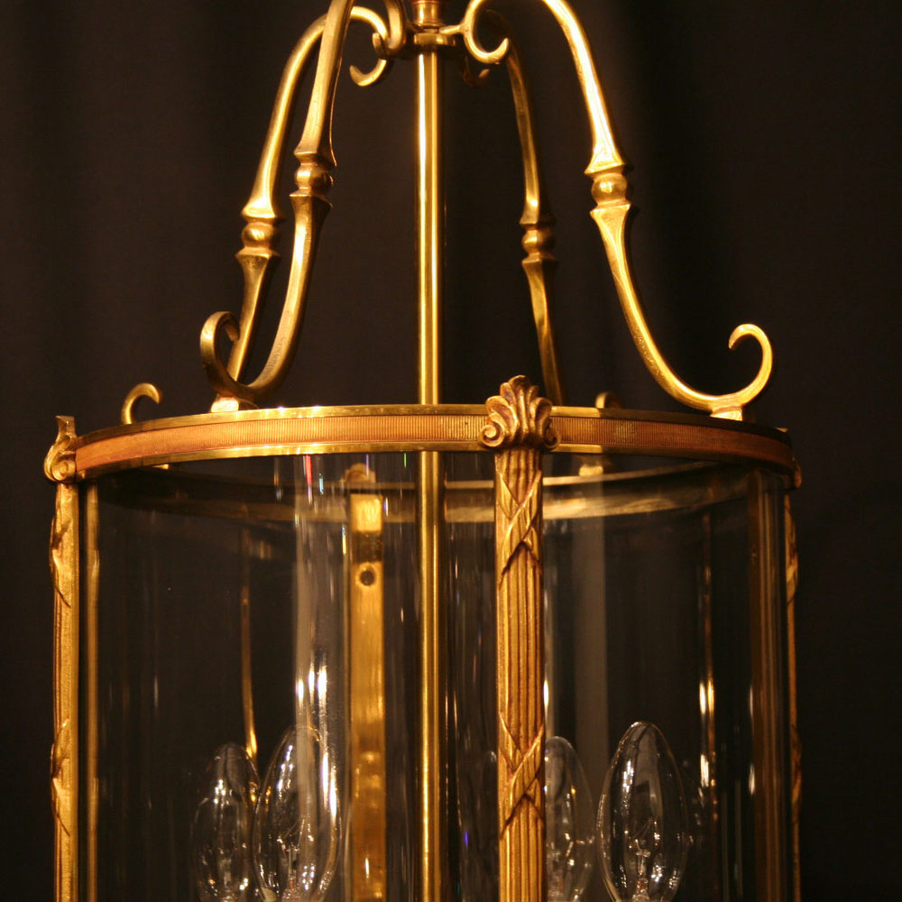 A good quality large French gilded cast brass four light hall lantern, the internal light fittings surrounded by four sectional circular convex glass panels held within a decorative scrolling framework and having the original chain and ceiling rose, excellent patination and great size. Fully rewired and PAT tested. All our lanterns come with bulbs and ceiling fixings.