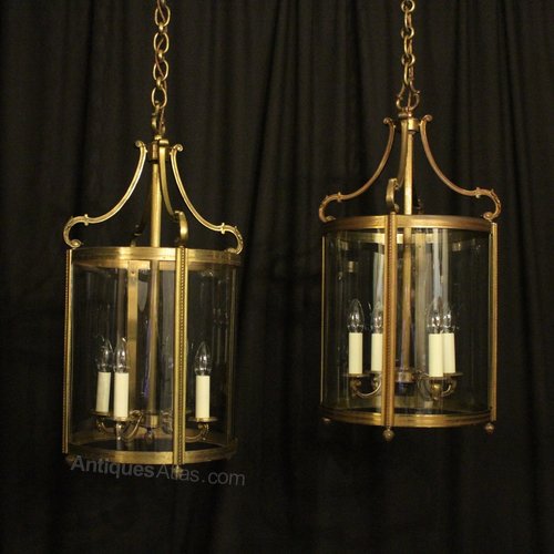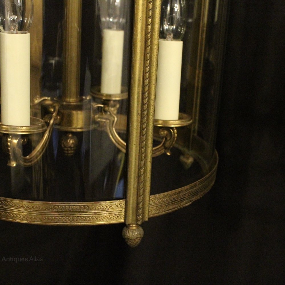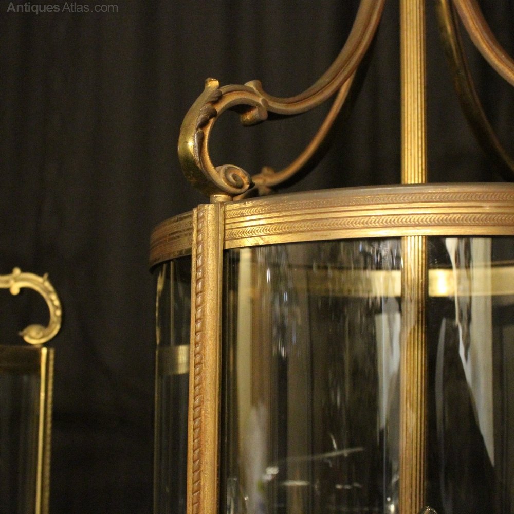 French large pair of gilded cast bronze four light antique hall lanterns, the four scrolling light fittings surrounded by four sectional circular convex glass panels and held within a decorative imbricated leaf scrolling framework with barley twisted side sections, acorn finials and open top scrolling canopy with flame terminal, having the original chain and ceiling rose, nice quality patination and great large size. The colour of the two lanterns are slightly different as one lantern was in a vestibule and the other in main hall. Fully rewired and PAT tested. All our lanterns come with bulbs and ceiling fixings.