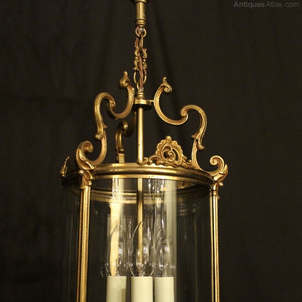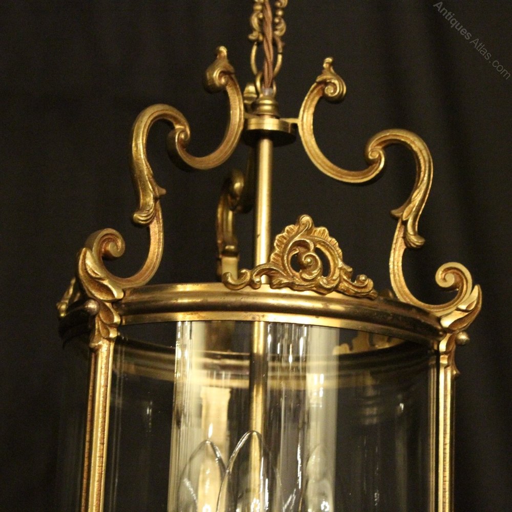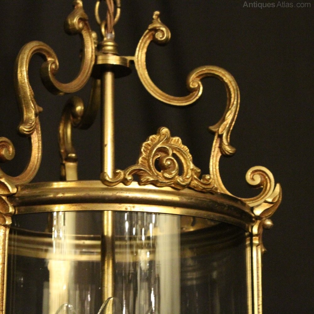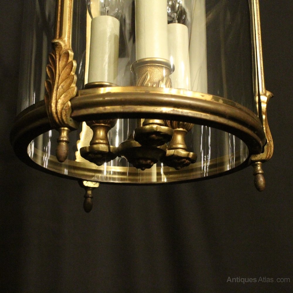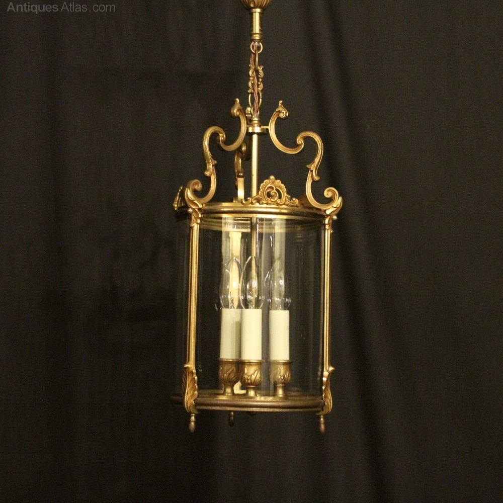 A French gilded cast brass triple light antique hall lantern, the three light fittings with leaf bulbous candle sconces, surrounded by a single circular convex glass panel and held within a decorative scrolling framework with leaf pierced embellishments and turned finials with an open scrolling top canopy, having the original chain and ceiling rose. Fully rewired and PAT tested. All our lanterns come with bulbs and ceiling fixings.