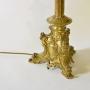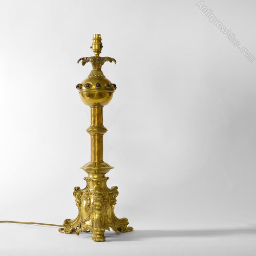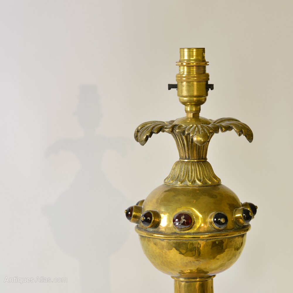 Hammered brass orb mounted with ruby glass, over knopped stem to trefoil foliate tripod base. Now wired with gold flex, bayonet cap bulb holder and PAT tested.