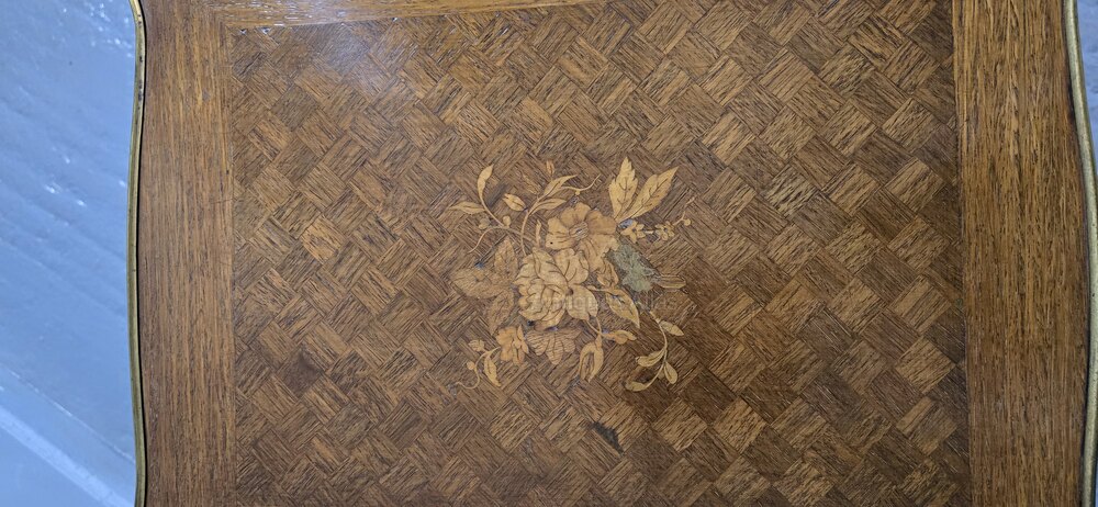 A super quality parquetry walnut occasional lamp table with a marquetry spray of flowers to the centre, ormolu mounts and edging, in overall very good condition throughout.