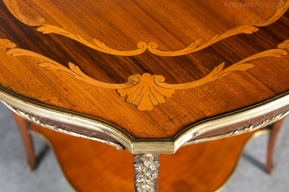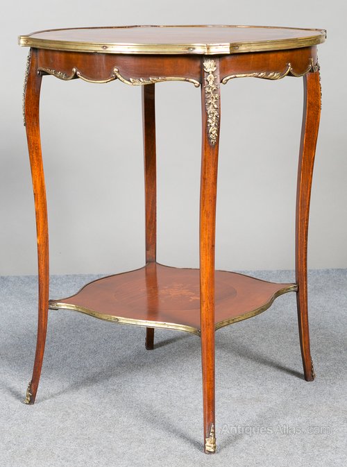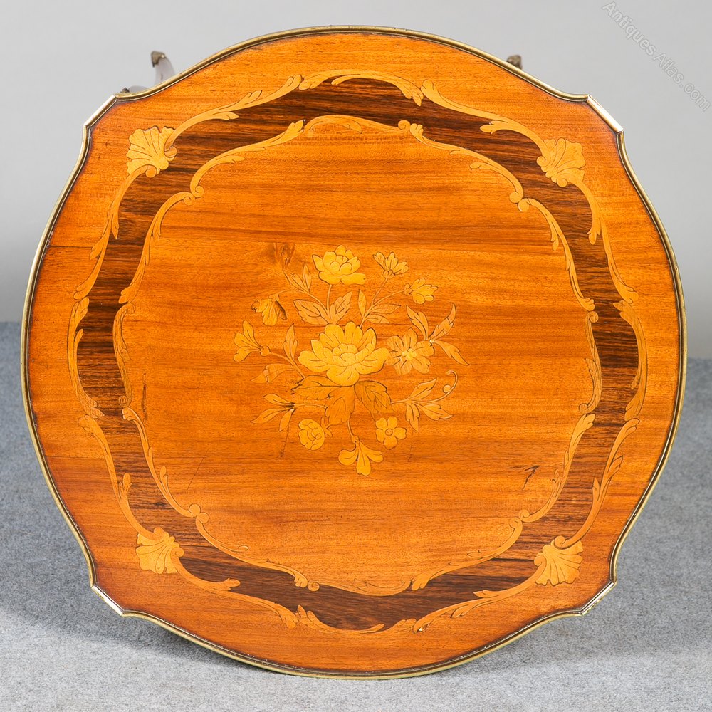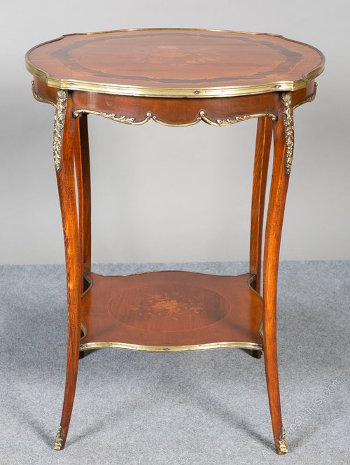 An inlaid and brass mounted French mahogany occasional table. The shaped and brass mounted top with a central floral marquetry panel in rosewood, satinwood and various stained woods. The shaped frieze has further ornate mounts with a shaped lower under tier with conforming inlay. The whole standing on 4 cabriole legs with brass mounts and sabots . Size- Height...28.5''...72.5cm. Diameter...22''...56cm. Condition-Very Good. Delivery to most of U.K. mainland £35.