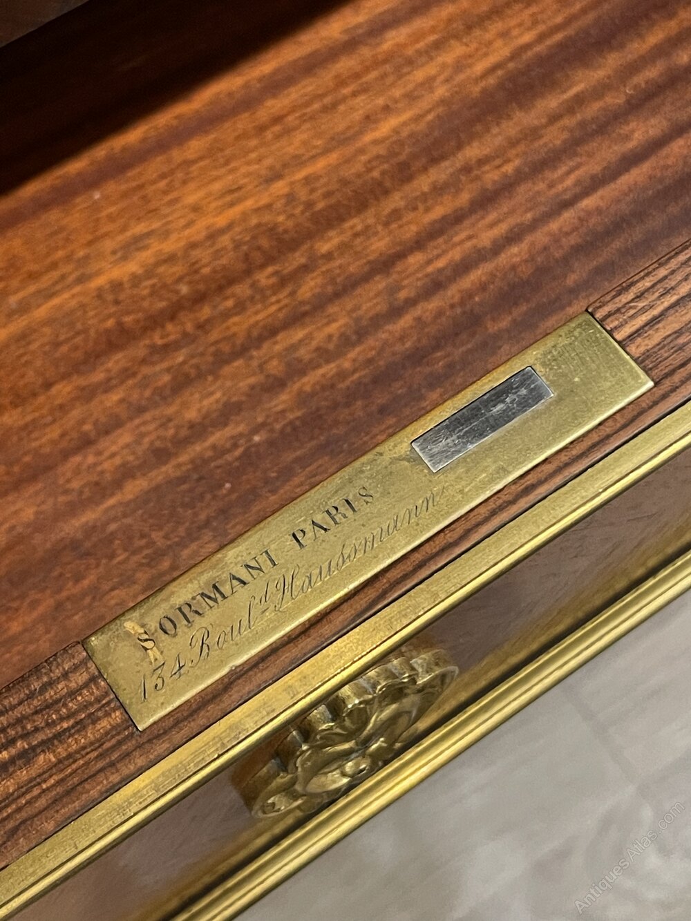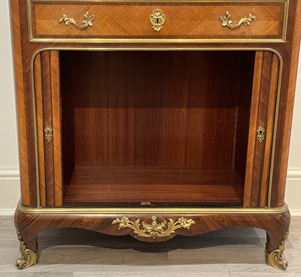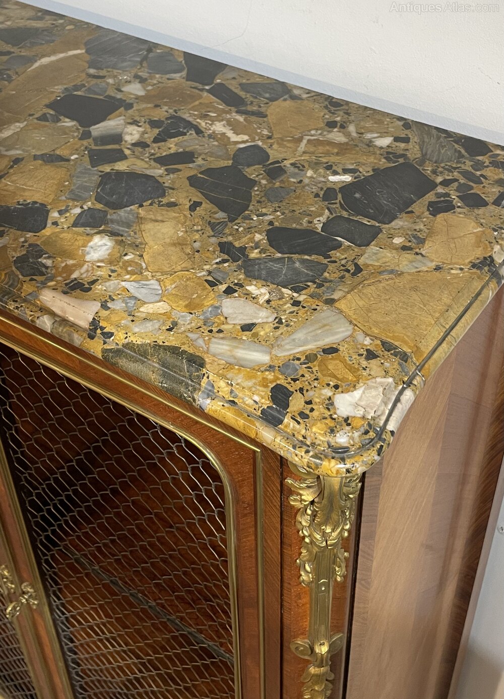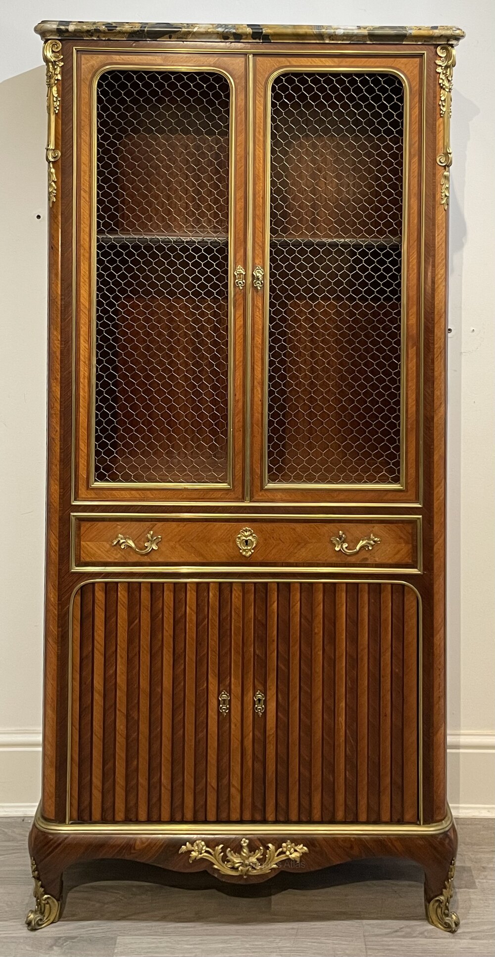 An important French gilt bronze mounted kingwood cabinet / bookcase by Paul Sormani with Brèche d''Alep marble top, cupboard with pair of doors above a single drawer and sliding tambour cupboard beneath. The cabinet offers extensive and versatile storage. Signed to top under marble P Sormani and also signed to the lock plate on the drawer. Circa 1880.