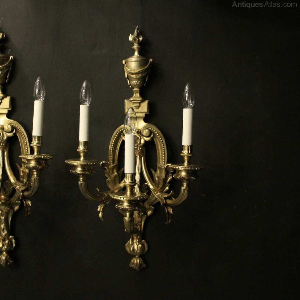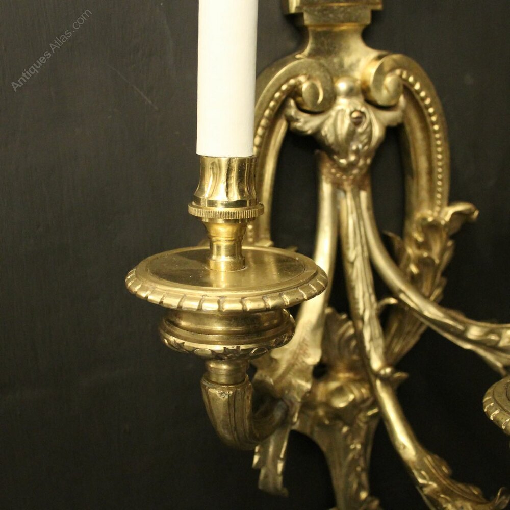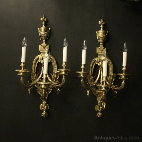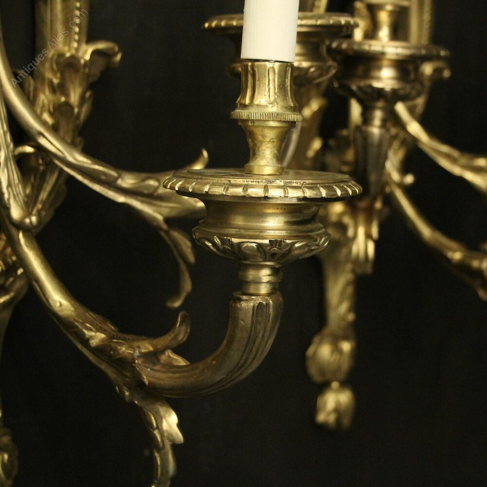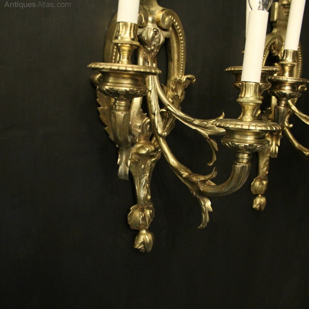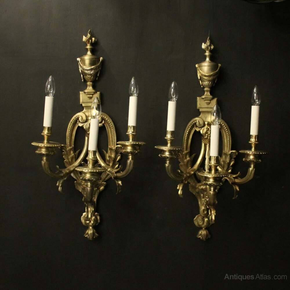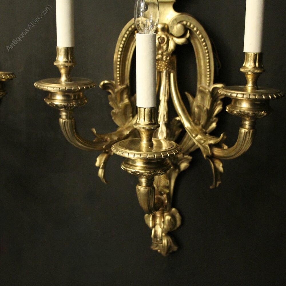 A large French pair of gilded brass triple arm wall lights, the leaf clad reeded tapering scrolling arms with circular bobeche drip pans and reeded scalloped candle sconces, issuing from a pierced oval millgrain leaf tapering backplate with urn flame finial. Great large scale. Fully rewired and PAT tested. All our wall lights come with aged brass screws or brackets for fixing and spare bulbs.