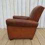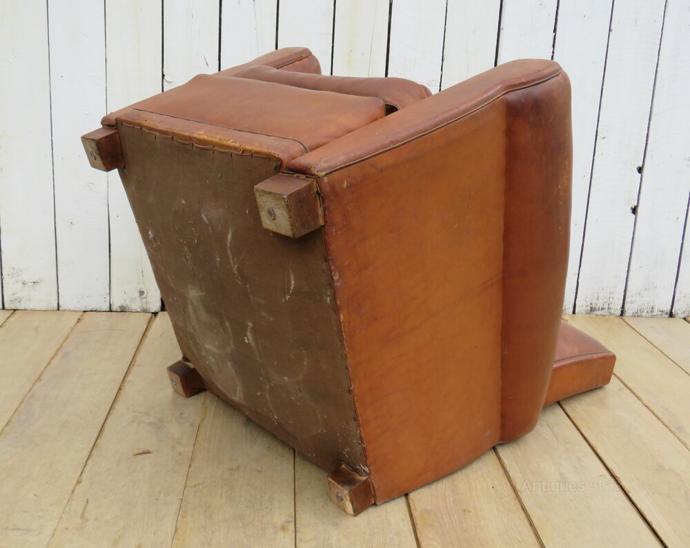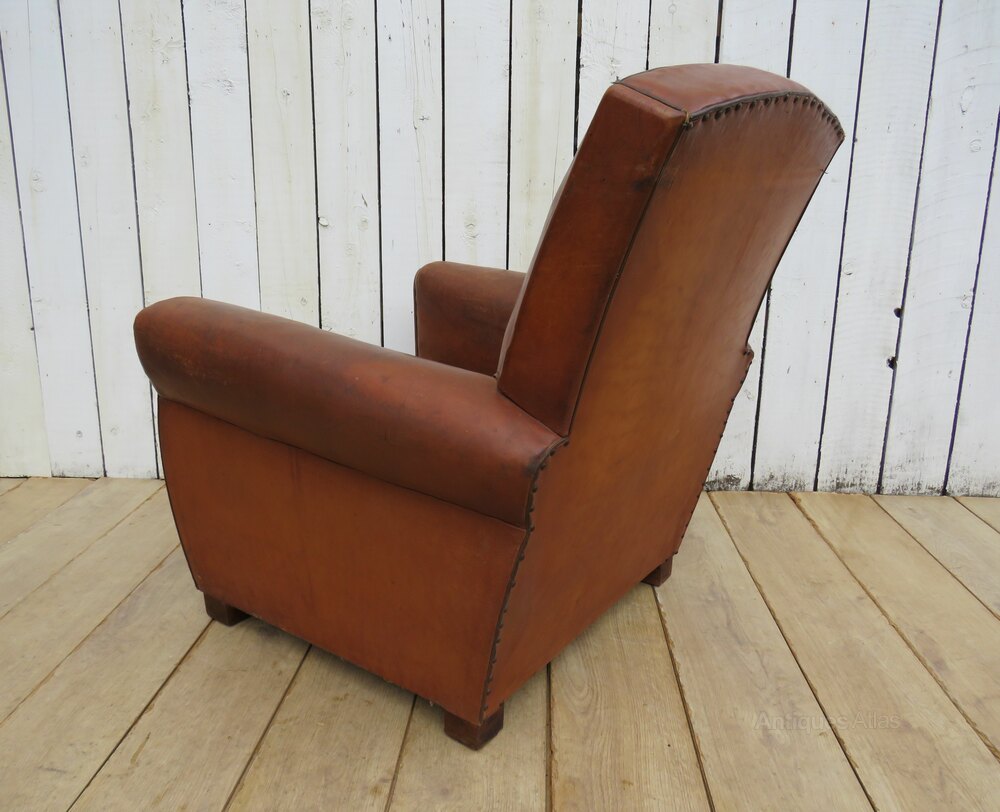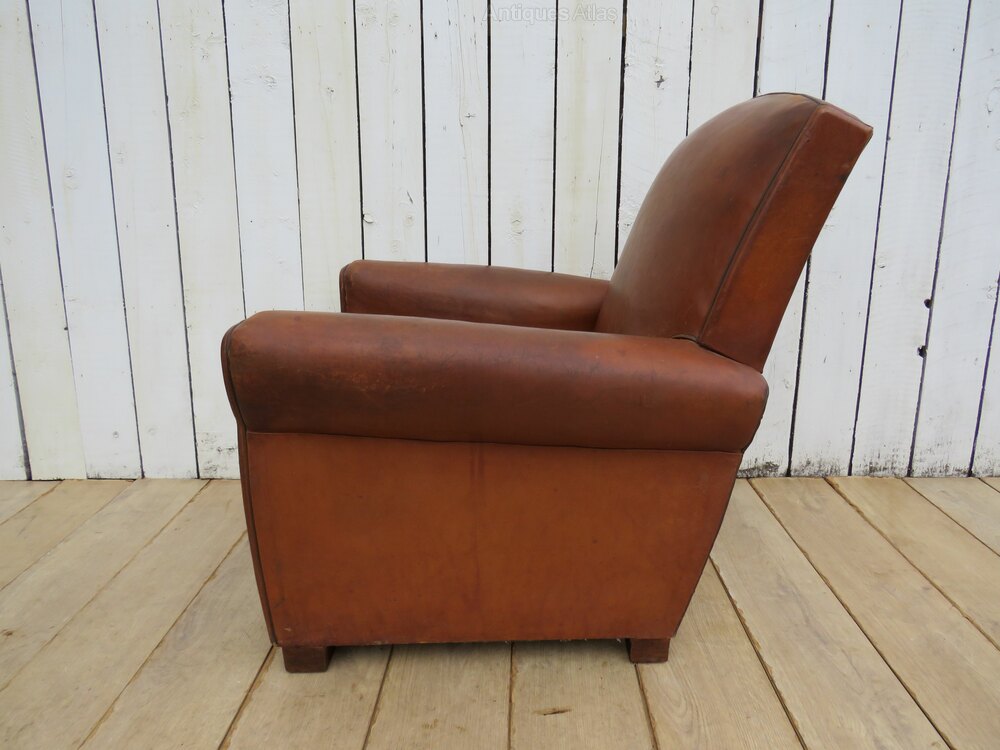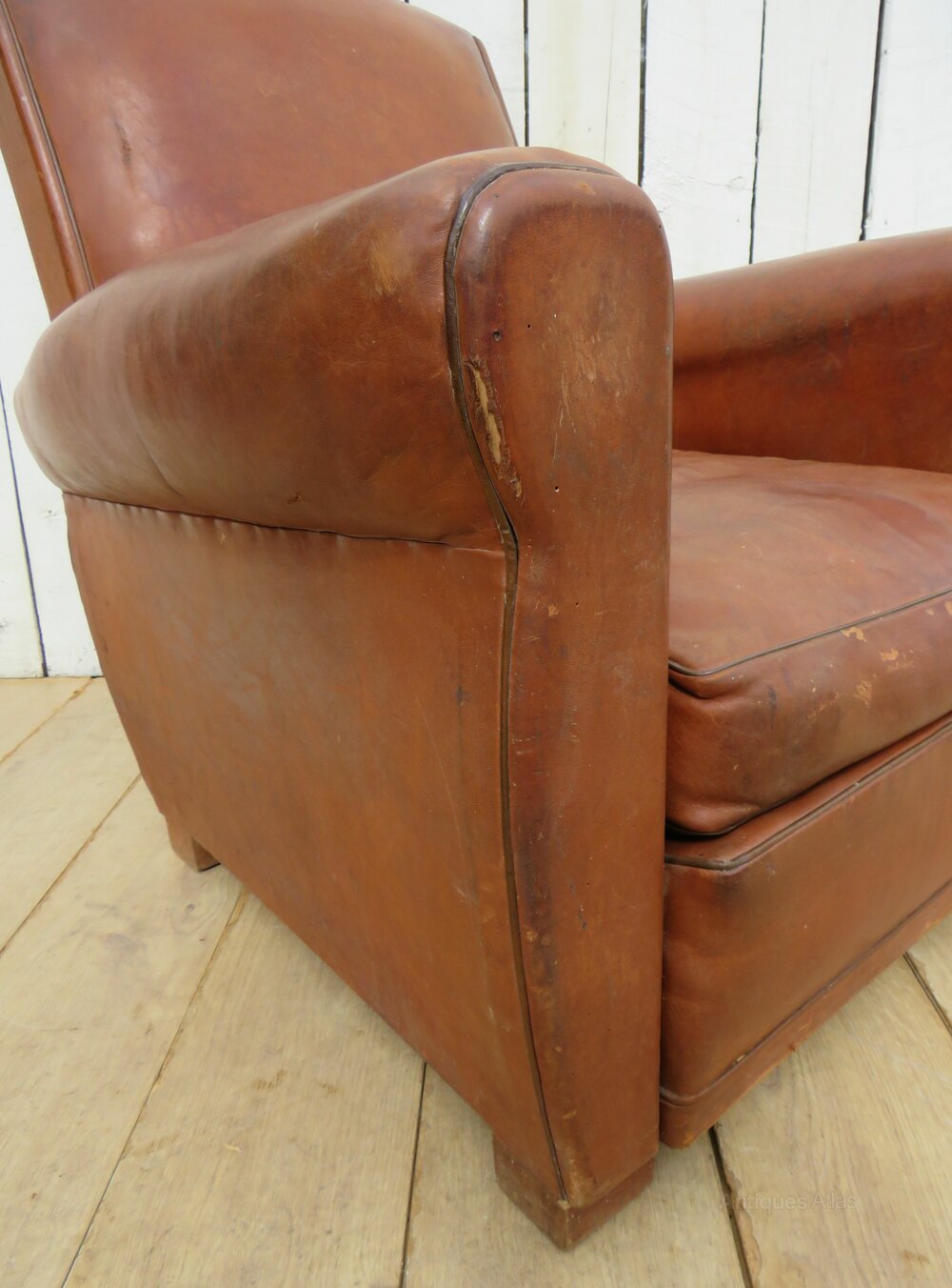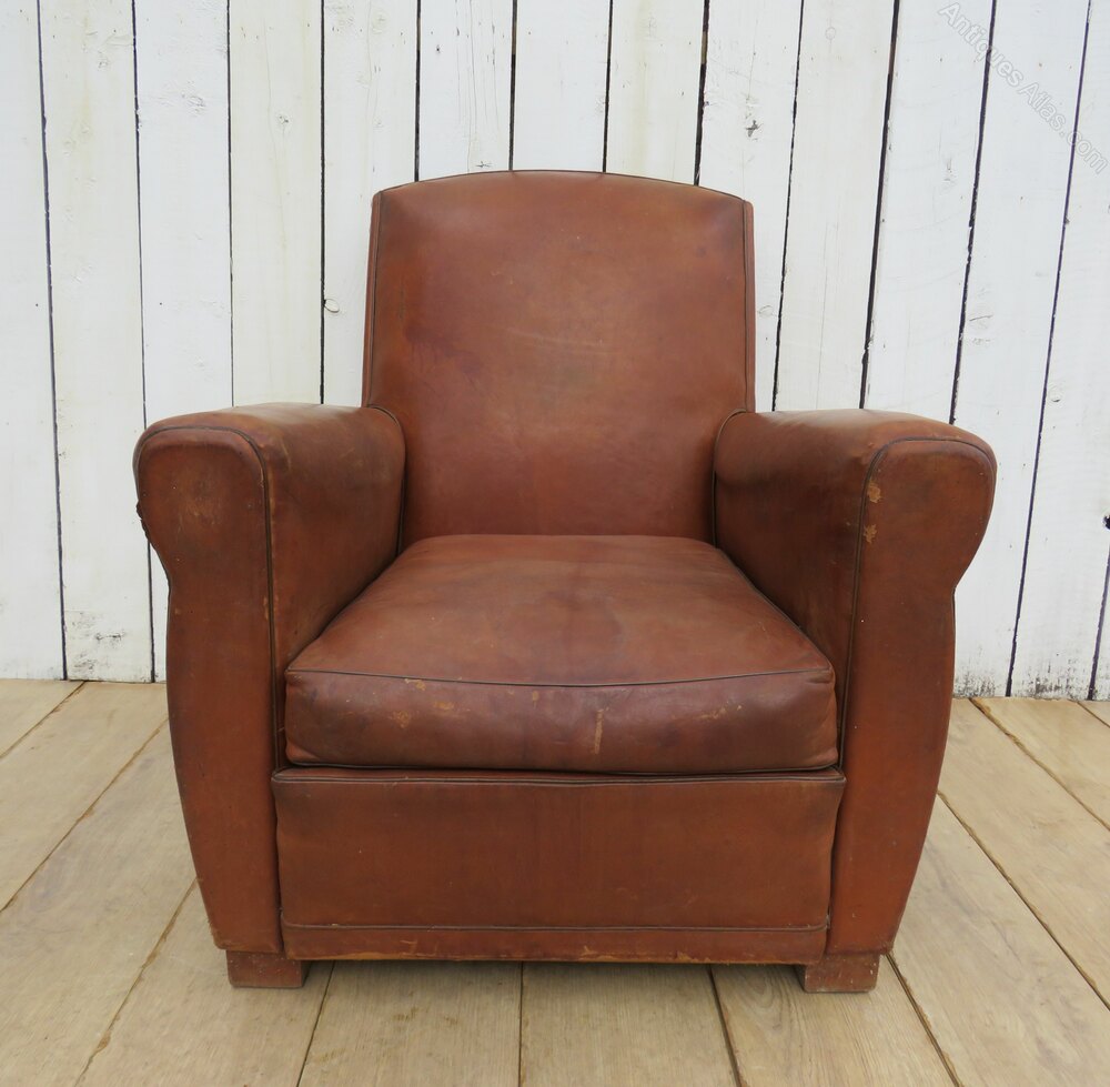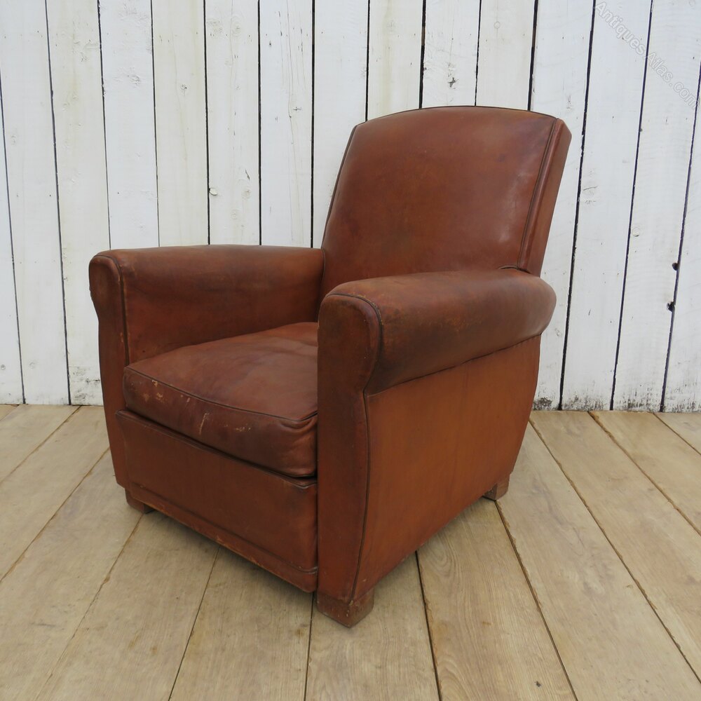 Shapely, sound, sturdy and sprung 1930-40s French leather club armchair retaining original seat cushion. More images available.