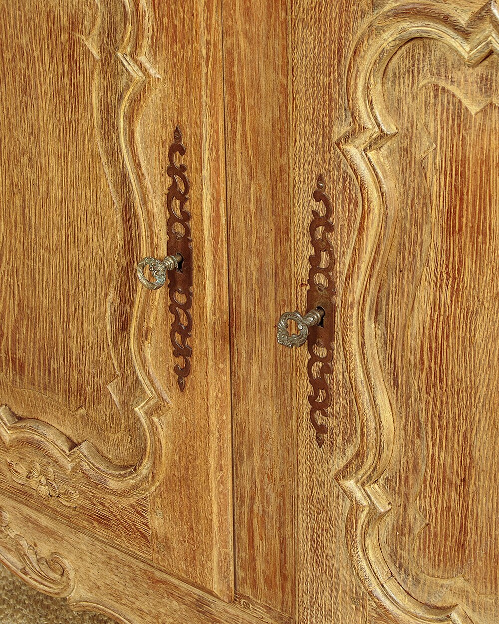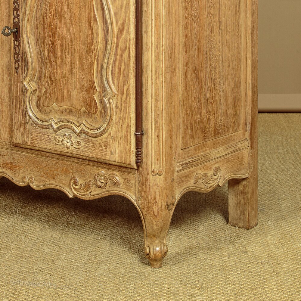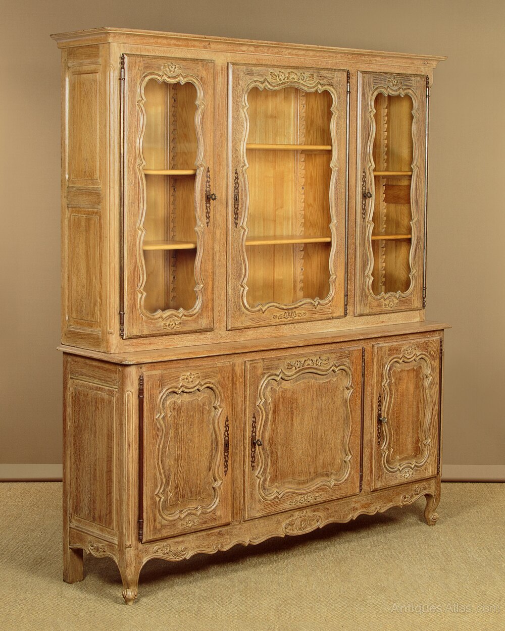 Large French limed oak bookcase. In two pieces, the three door glazed bookcase top with two adjustable shelves to each section (internal depth 10½"). Over a deeper blind door cupboard base with a single adjustable shelf to each section (internal depth 14"). Moulded cornice over attractively shaped door panels with moulded surround and carved floral detail. Long steel hinges and escutcheons to each door. Shaped and carved apron to the front and sides, scroll carved front feet. Solid oak carcass, raised and fielded oak panelled sides, ash back panels. Excellent condition, cleaned and waxed in our workshops. Keys supplied.
