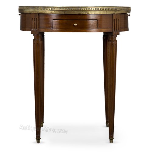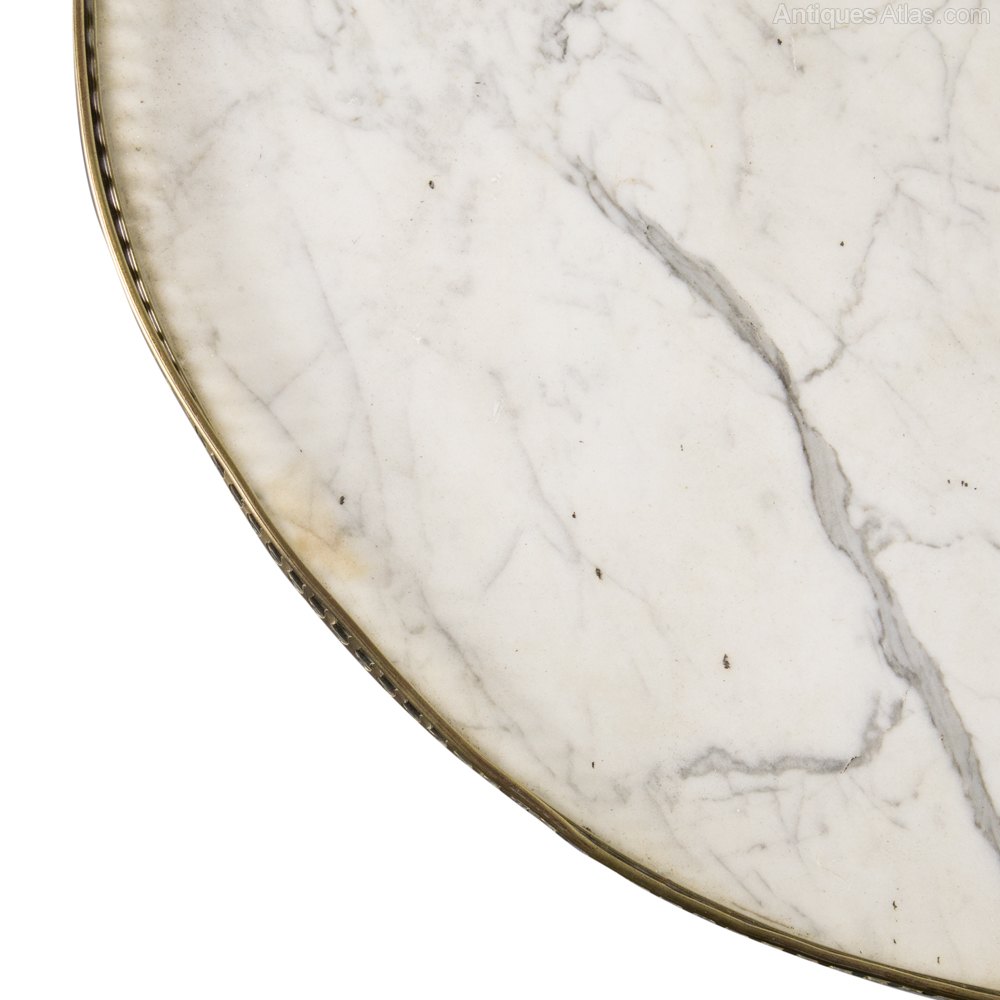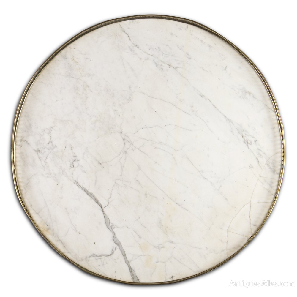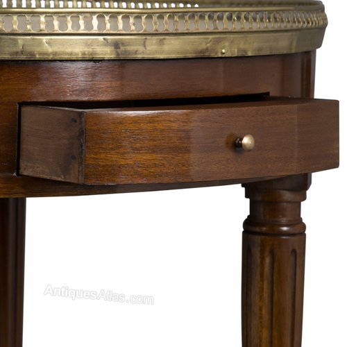 This item is in original structural condition. The polish has been revived, and the brass gallery cleaned, by our own craftsmen, by hand in the traditional manner. The gallery is intact, though slightly bent in places and bears signs of some pitting. There are some minor old marks under the polish, but nothing serious or unsightly. The marble top has an old repair, visible in the final detail photograph it is sound and shows no signs of movement.