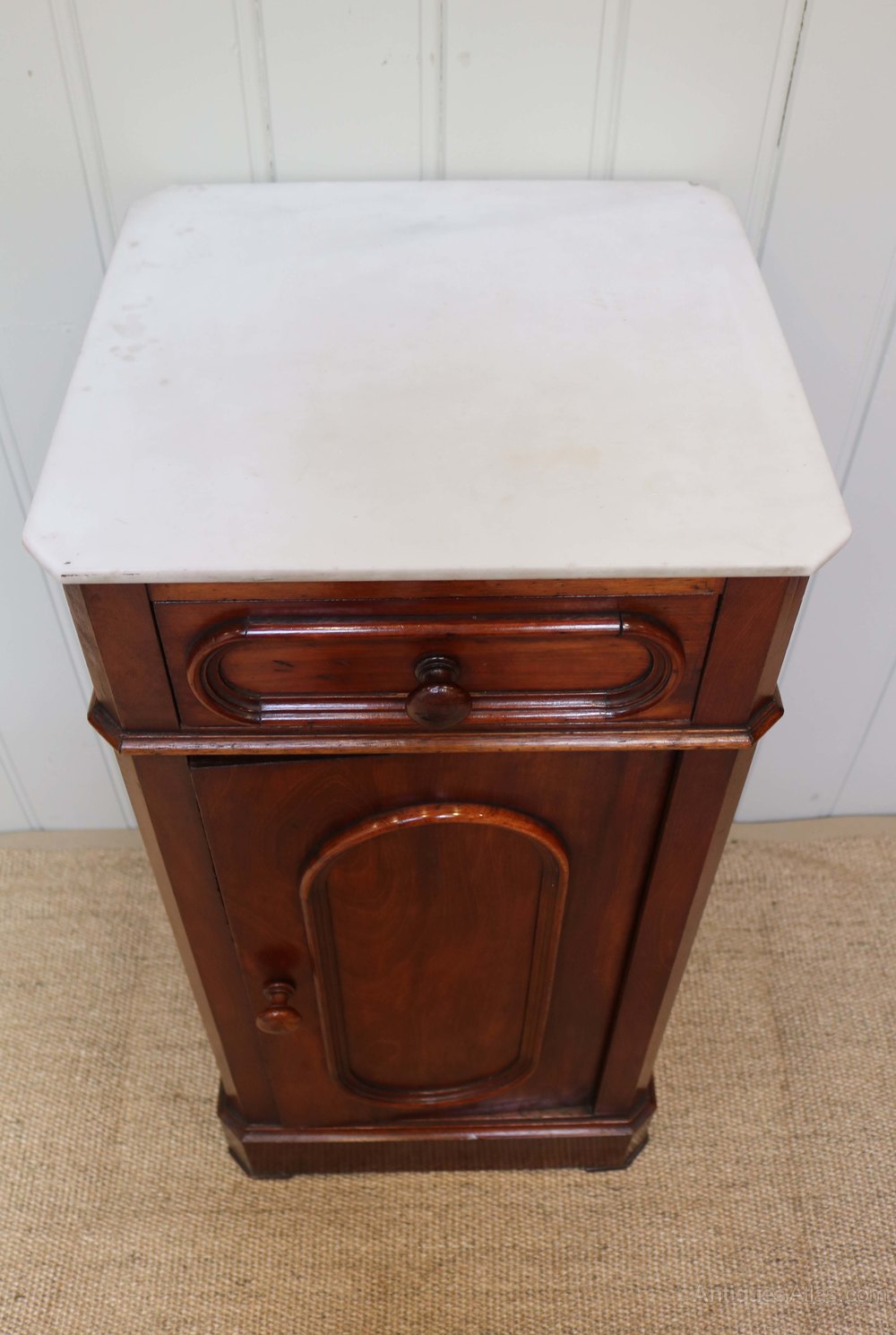French mahogany marble top pot cupboard having a single door below a single drawer with canted corners and a marble top