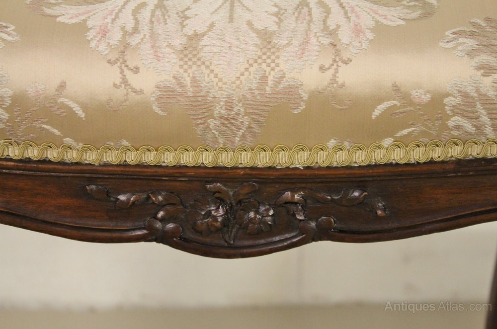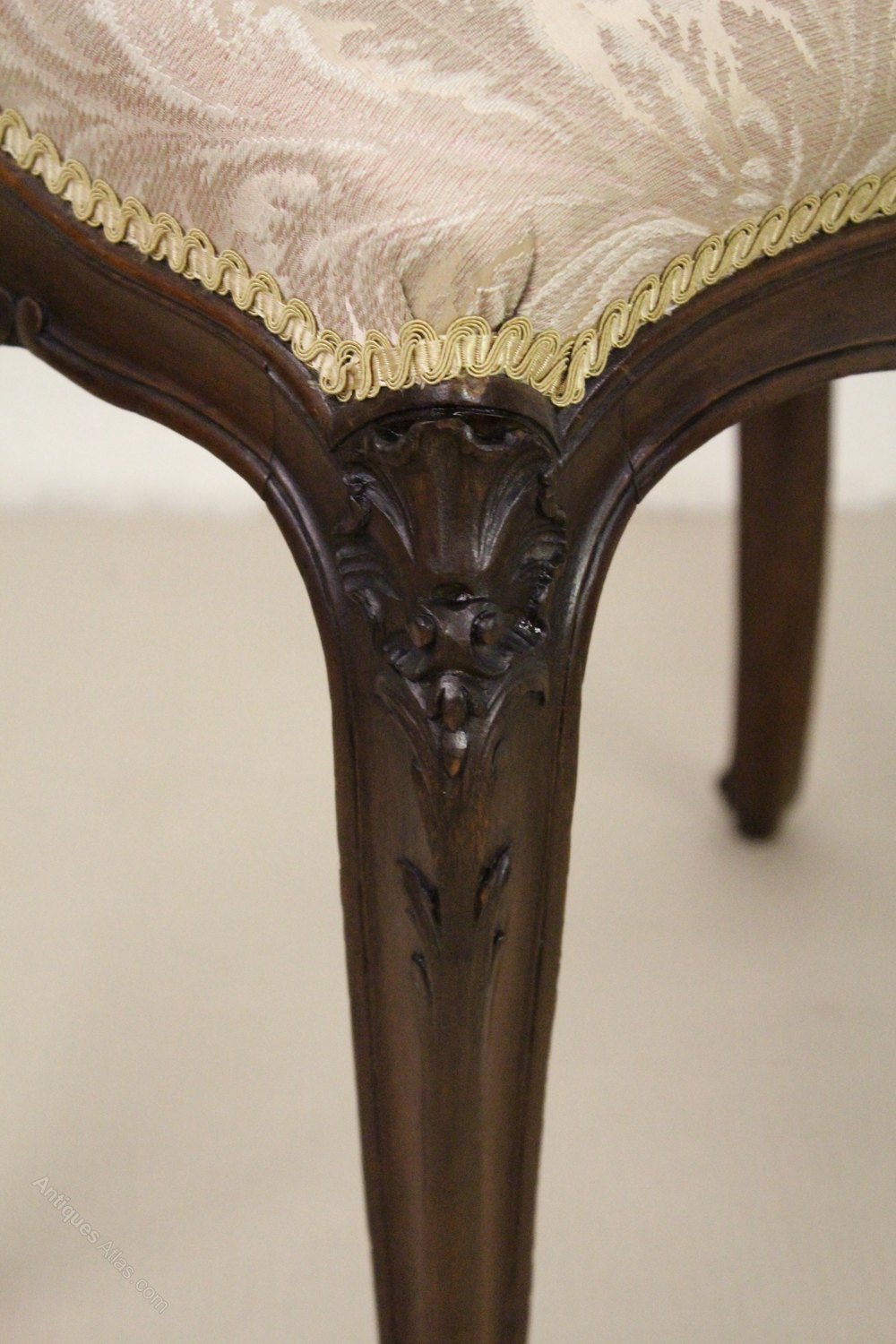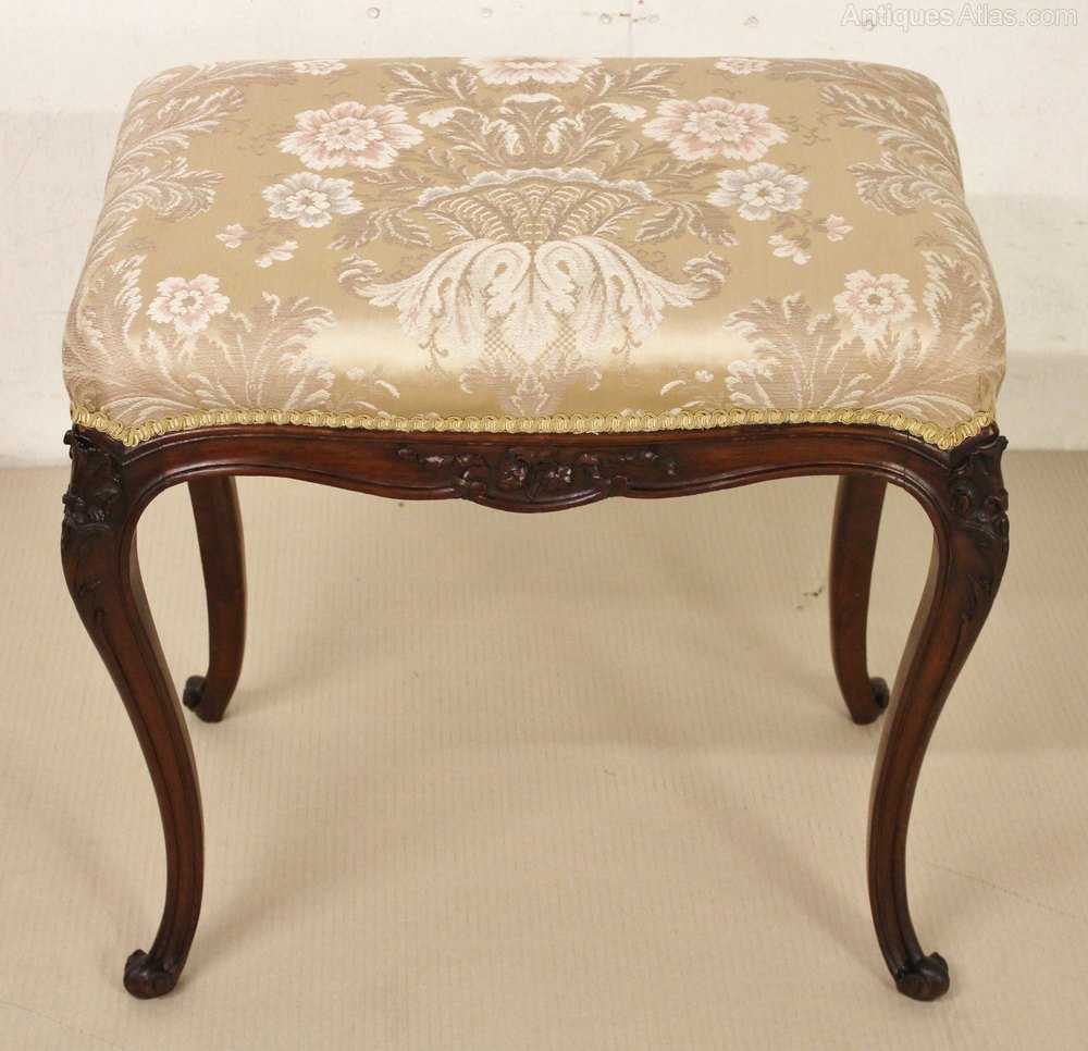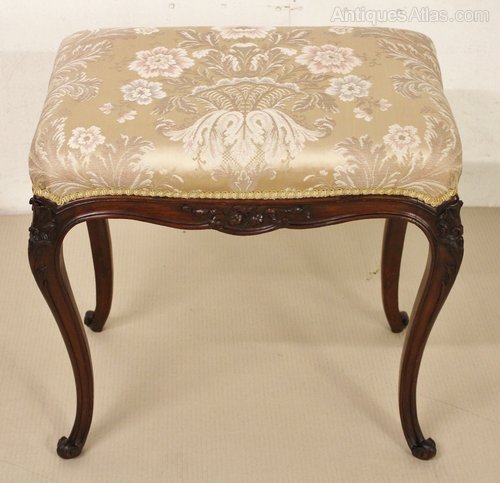 A pretty French late 19th century upholstered stool. Well made in solid mahogany with a scrolling design and carved floral decorations. The two back legs are longer than the two front legs providing a slightly sloping seat and a comfortable sitting position. This lovely stool could be used as a piano stool or dressing stool. It is offered for sale in excellent original condition ready to go straight into the home.