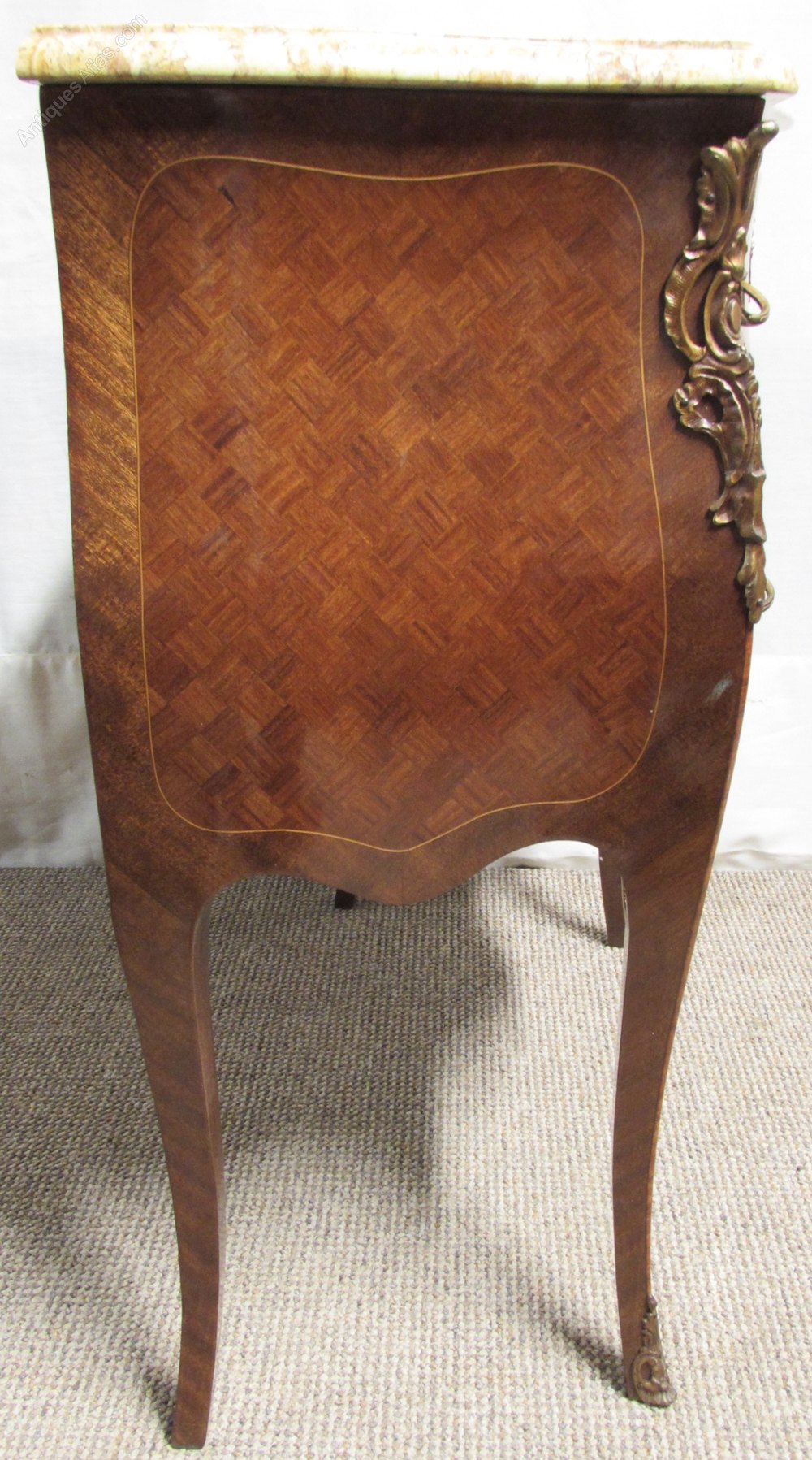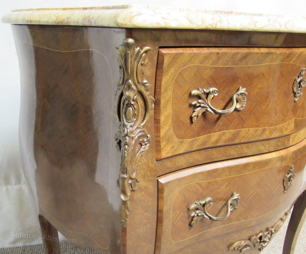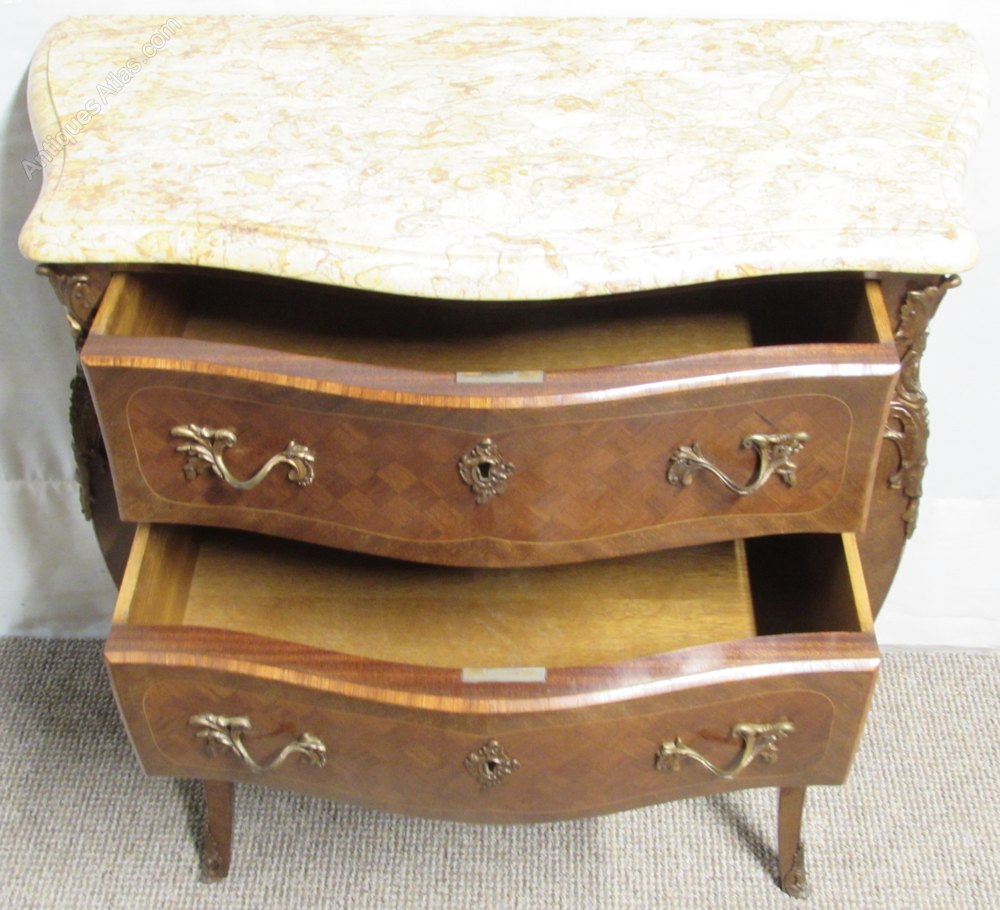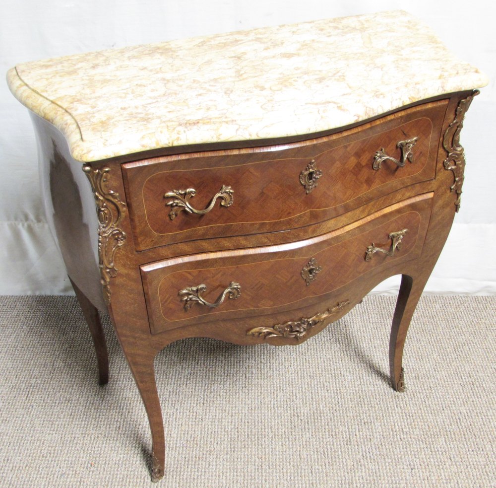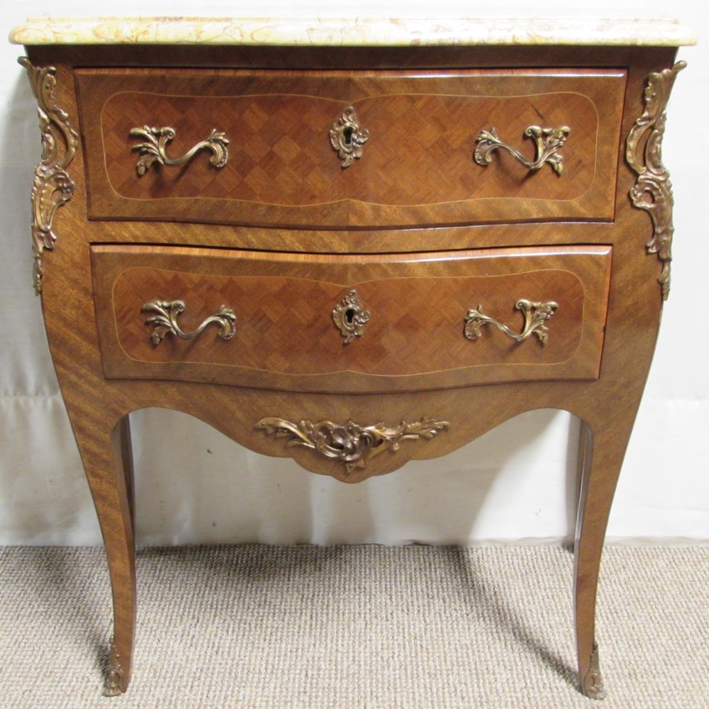 A delightful French Chest of Drawers, Serpentine in form and having 2 drawers which run smoothly, the ormolu mounts and handles are original and all well cast. The front and sides are bombe and have parquetry panels. The marble is in perfect condition.