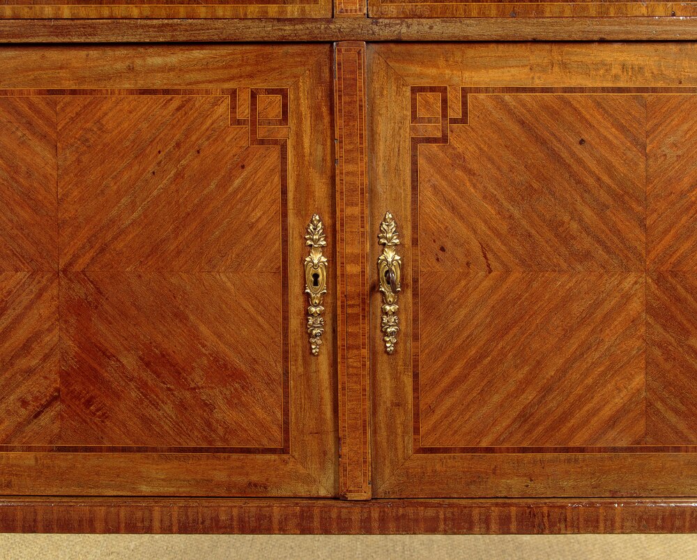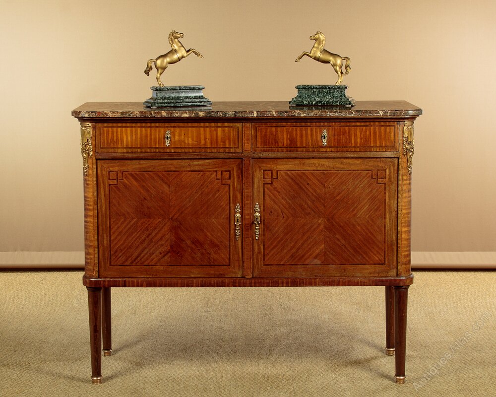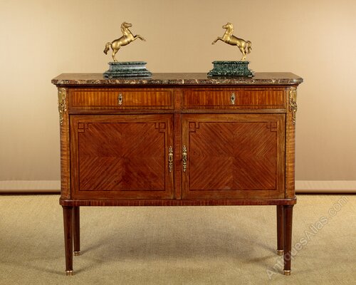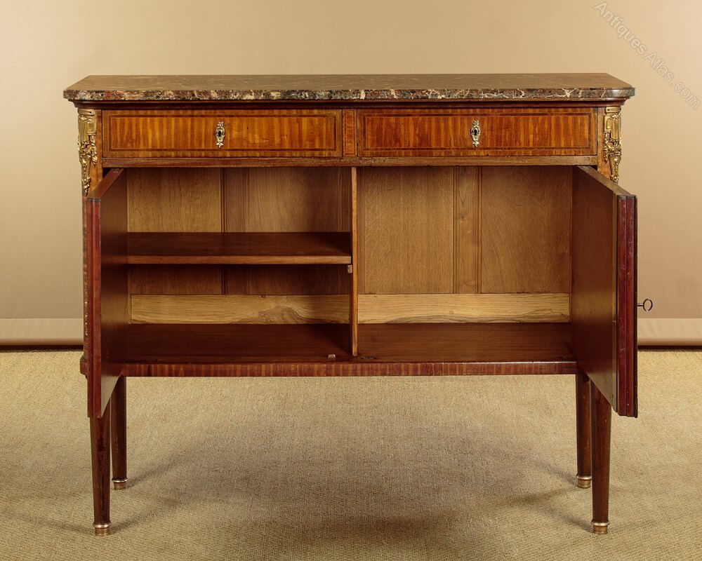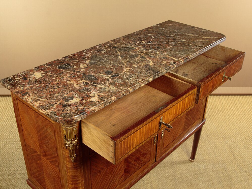 Very smart French Louis XVI style marble top side cabinet c.1930. Highly figured marble top with rounded front corners and a moulded edge. Over a cabinet with two drawers and a two door cupboard with a central divider and a single shelf to the left hand side (internal depth 13½"). Symmetrically arranged mahogany veneers to the exterior with inlaid rosewood crossbanding and boxwood stringing, repeated on the cabinet sides. Large gilded ormolu mounts at the shoulders and decorative escutcheons to the drawers and doors. Raised on turned and tapering legs with brass mounts to the feet front and rear. Oak drawer linings and back panels. Some light scratches to the marble and wear to the polished finish. Otherwise very good condition, cleaned and waxed in our workshops, key supplied for both drawers and the cupboard.