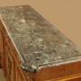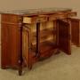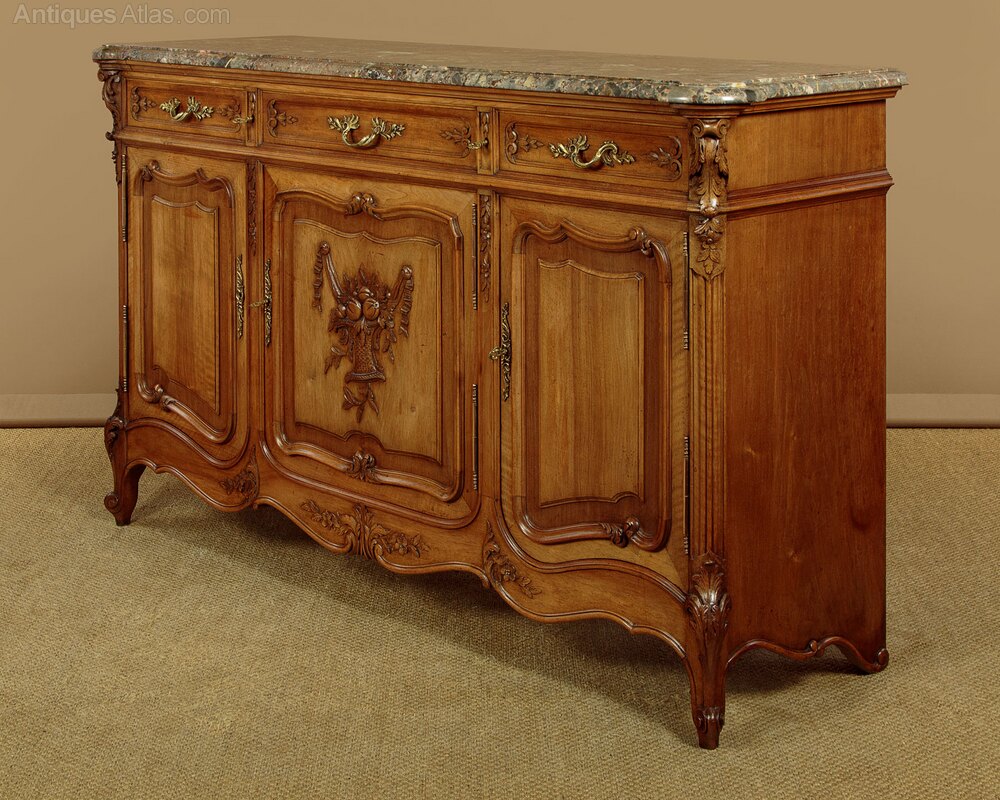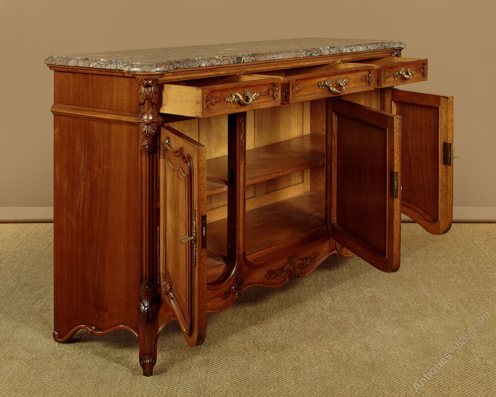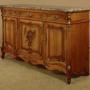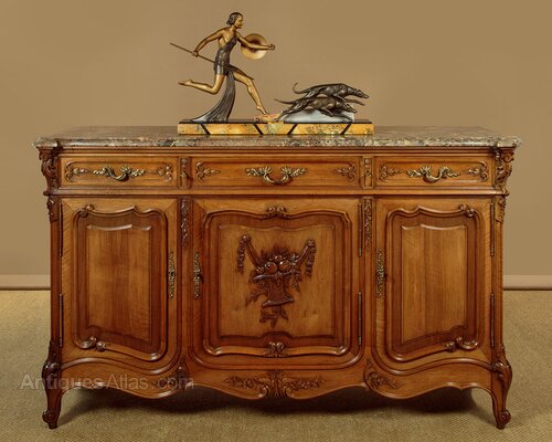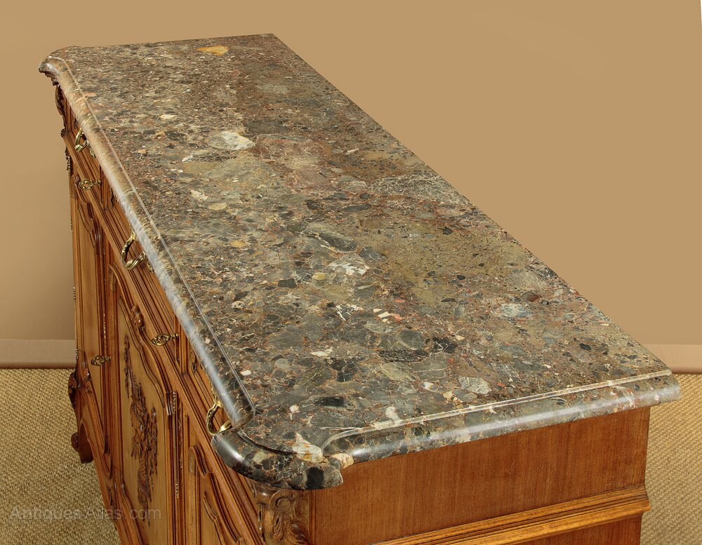 Quality French walnut and marble top sideboard c.1930. Thick marble top with rounded projecting front corners and a moulded edge. Over three oak lined drawers and a three door cupboard fitted with a single long shelf inside (depth 16"). Decorative front with carved and moulded drawers and shaped and raised door panels carved with a basket of fruit to the centre. Note also the shaped bottom edges to the doors, an unusual feature. Original brass handles, escutcheon plates and hinges. Further carved detail to the corner pilasters and front feet and to the elaborately shaped apron at the front and sides. Excellent colour and condition, cleaned and waxed in our workshops. Keys supplied for the drawers and doors.
