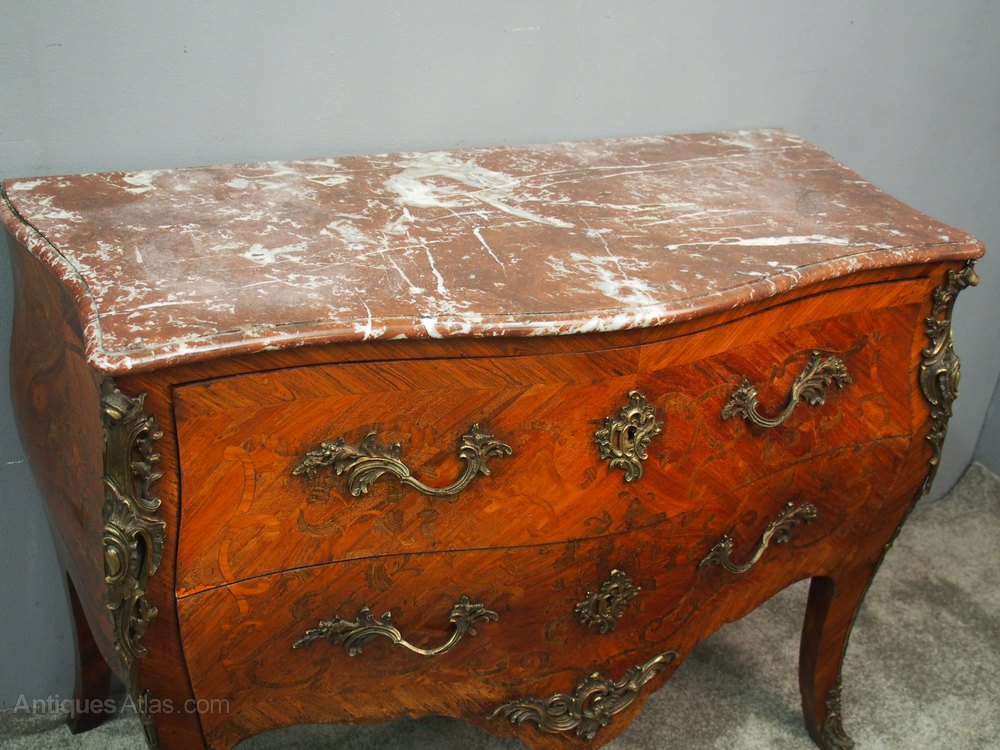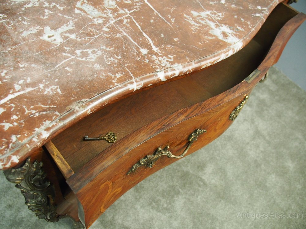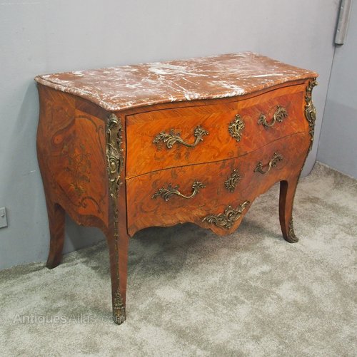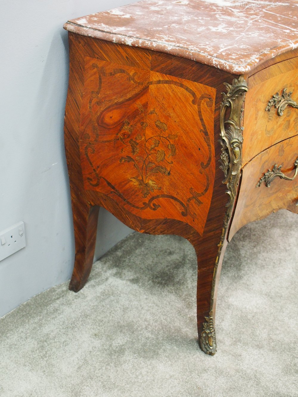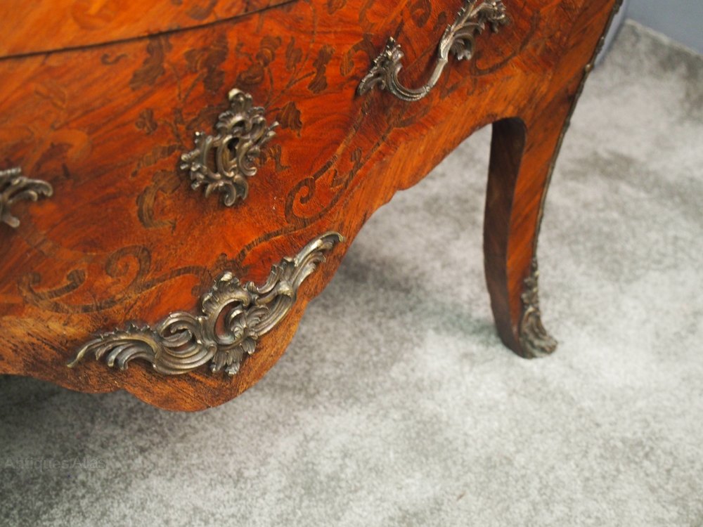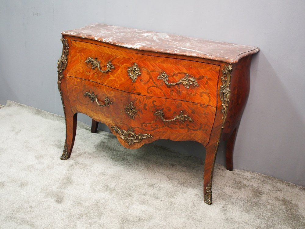 Circa 1860, large French marquetry inlaid Kingwood commode. The serpentine top is in pink variegated marble with a moulded edge over two deep bombe-front, oak lined drawers with marquetry and arabesque inlay, ormolu rococo handles and escutcheons. There is conforming inlay to the sides and it stands on cabriole supports with extensive ormolu mounts.