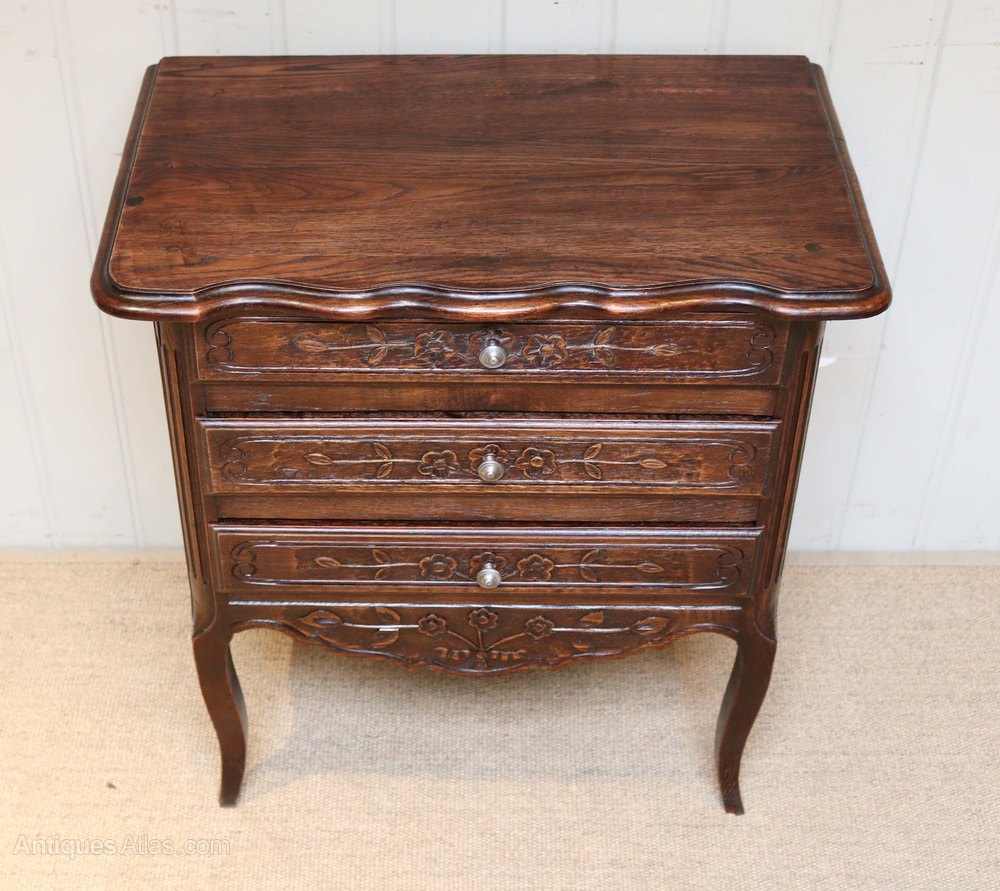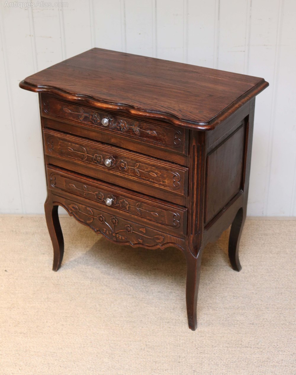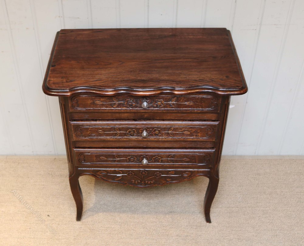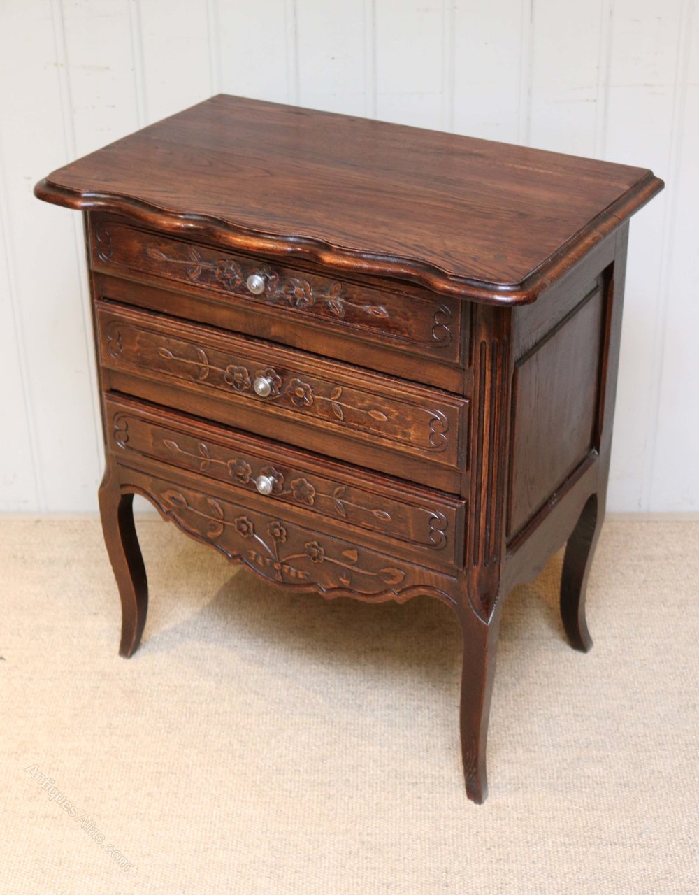 French oak chest of three long drawers having carved decoration and a shaped top raised on cabriole legs